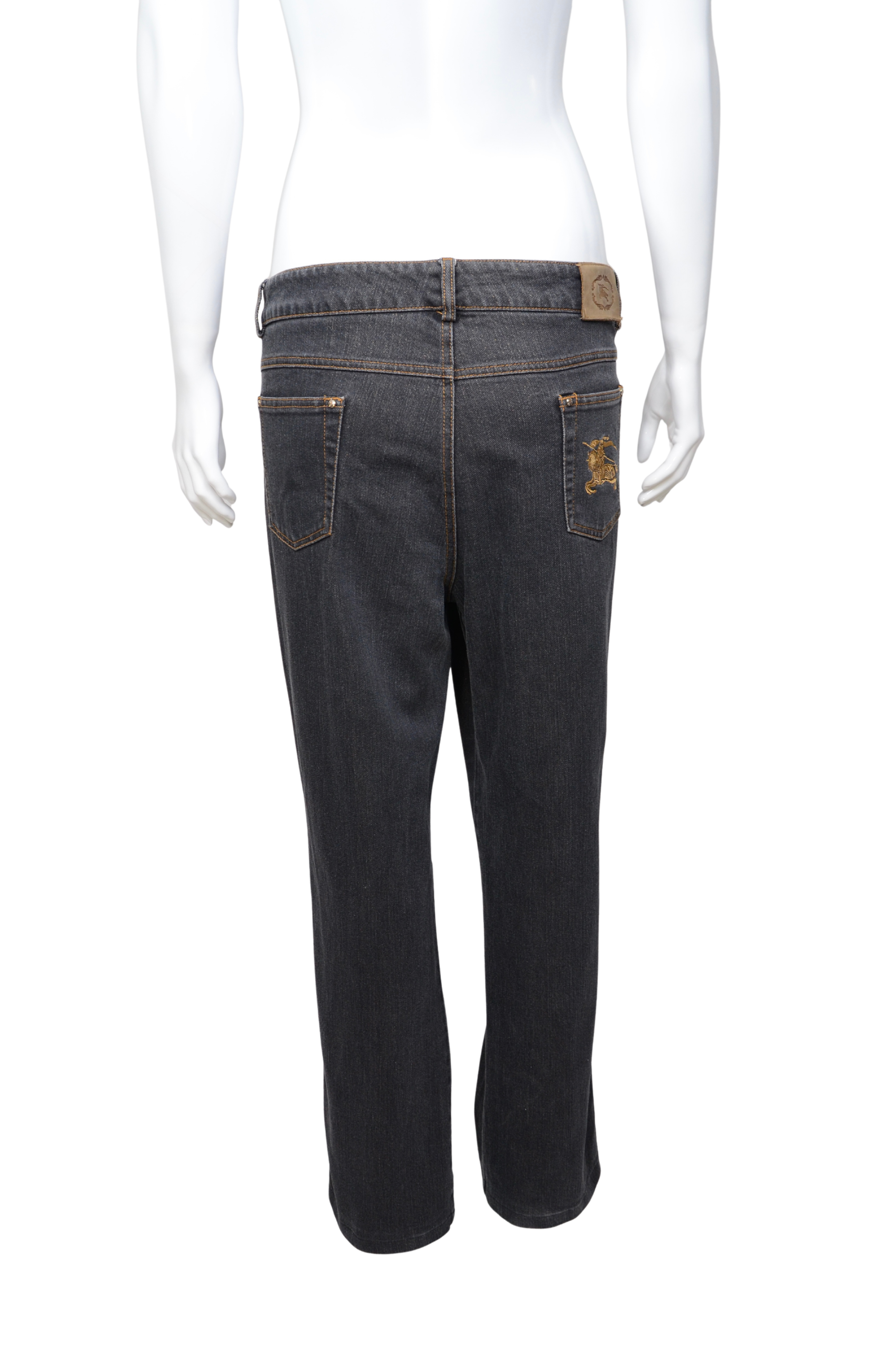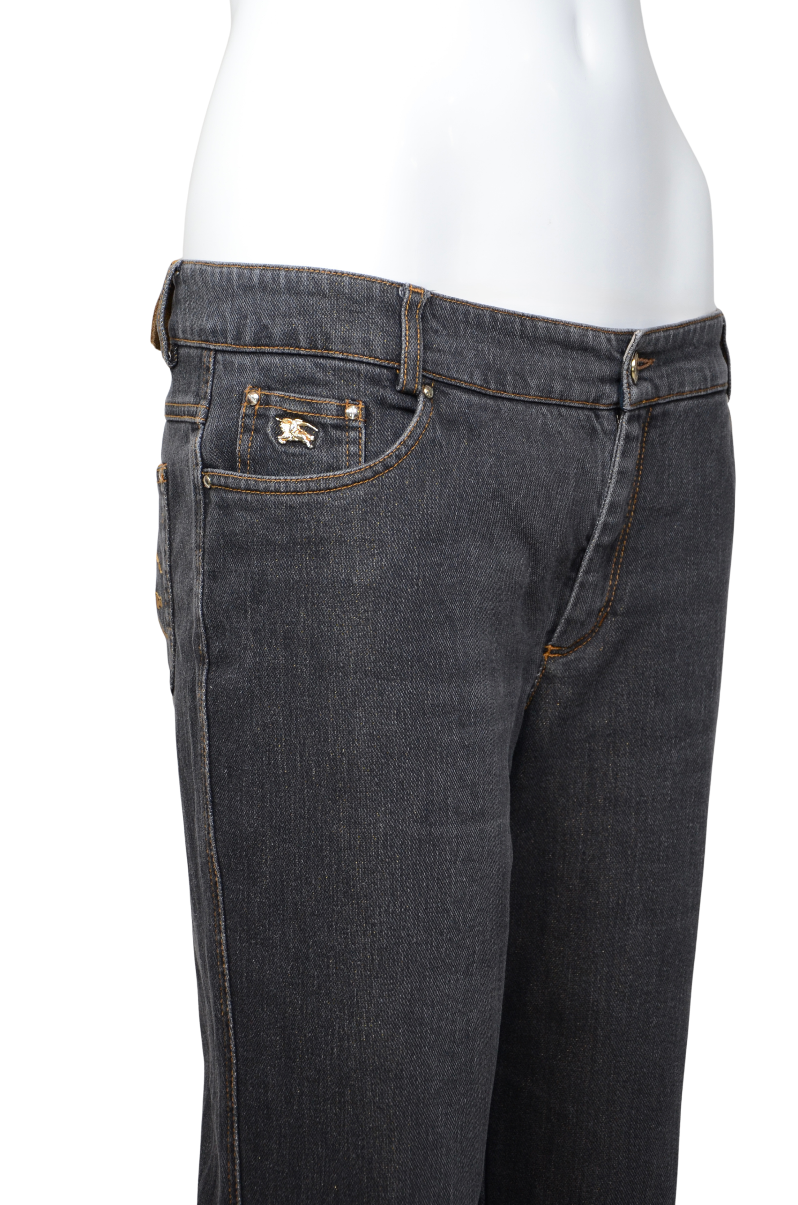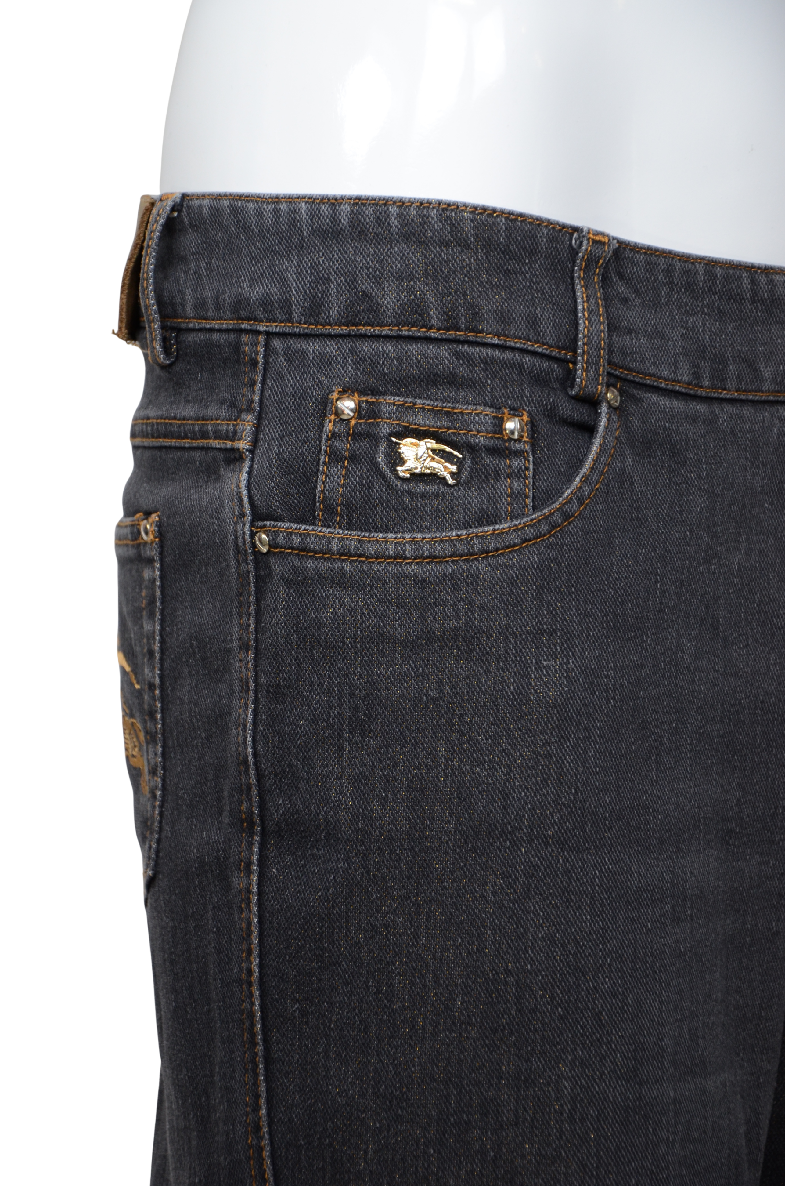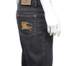 Description: A refined yet striking denim piece by Burberry London, these dark-wash jeans feature a subtle glitter finish that catches the light beautifully. The design includes the brand’s signature equestrian knight emblem embroidered in gold on the back pocket and a matching metal logo detail on the front coin pocket. Crafted in a straight-leg silhouette with a low-rise waist, they combine timeless tailoring with a touch of modern glamour. The interior waistband showcases the iconic Burberry check lining for a signature finish.