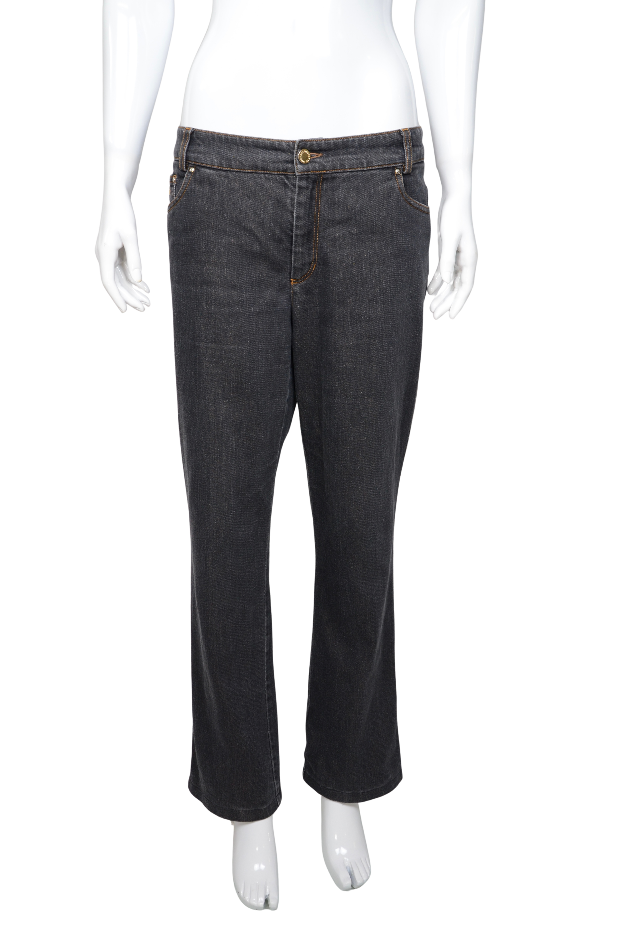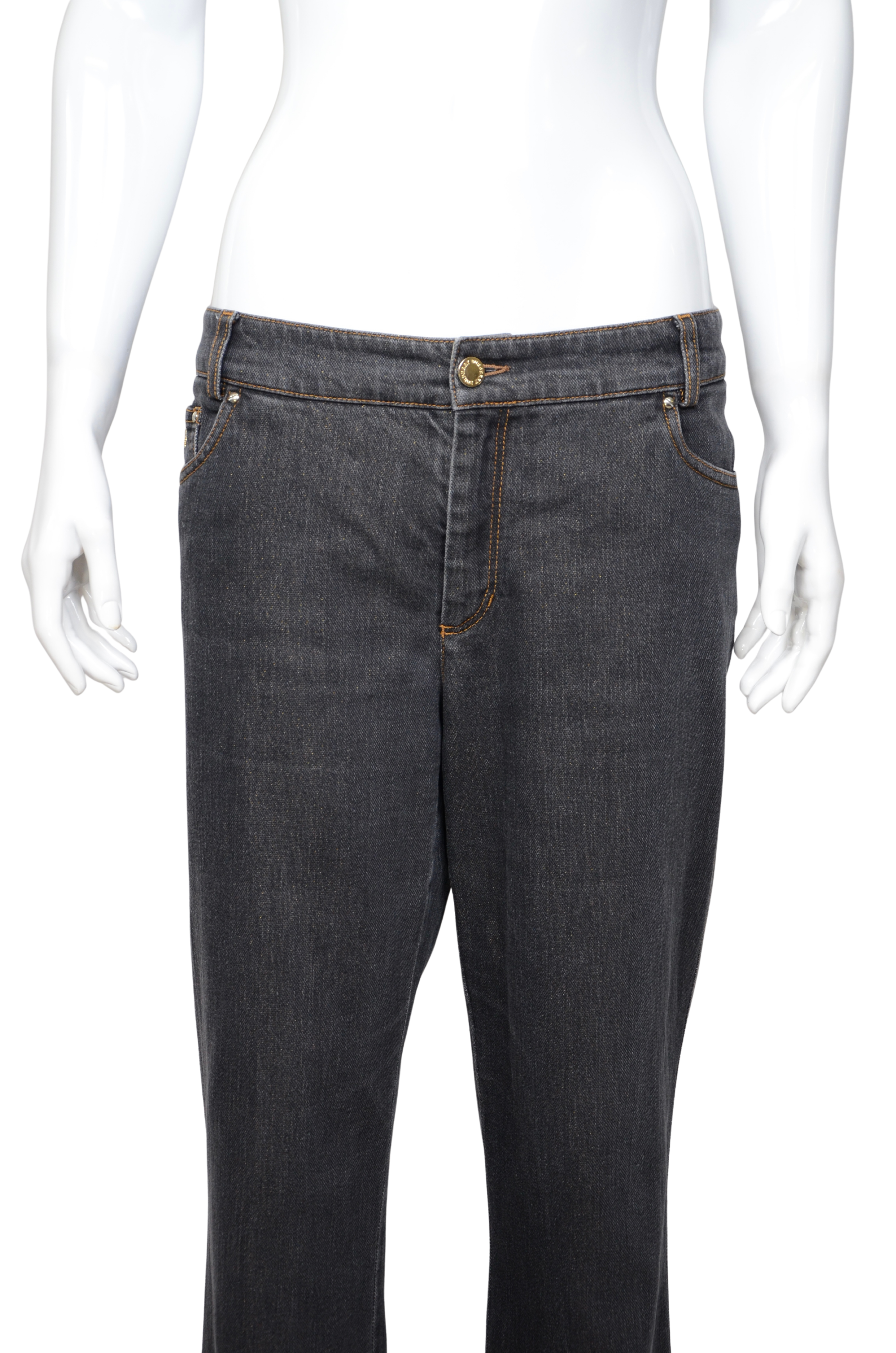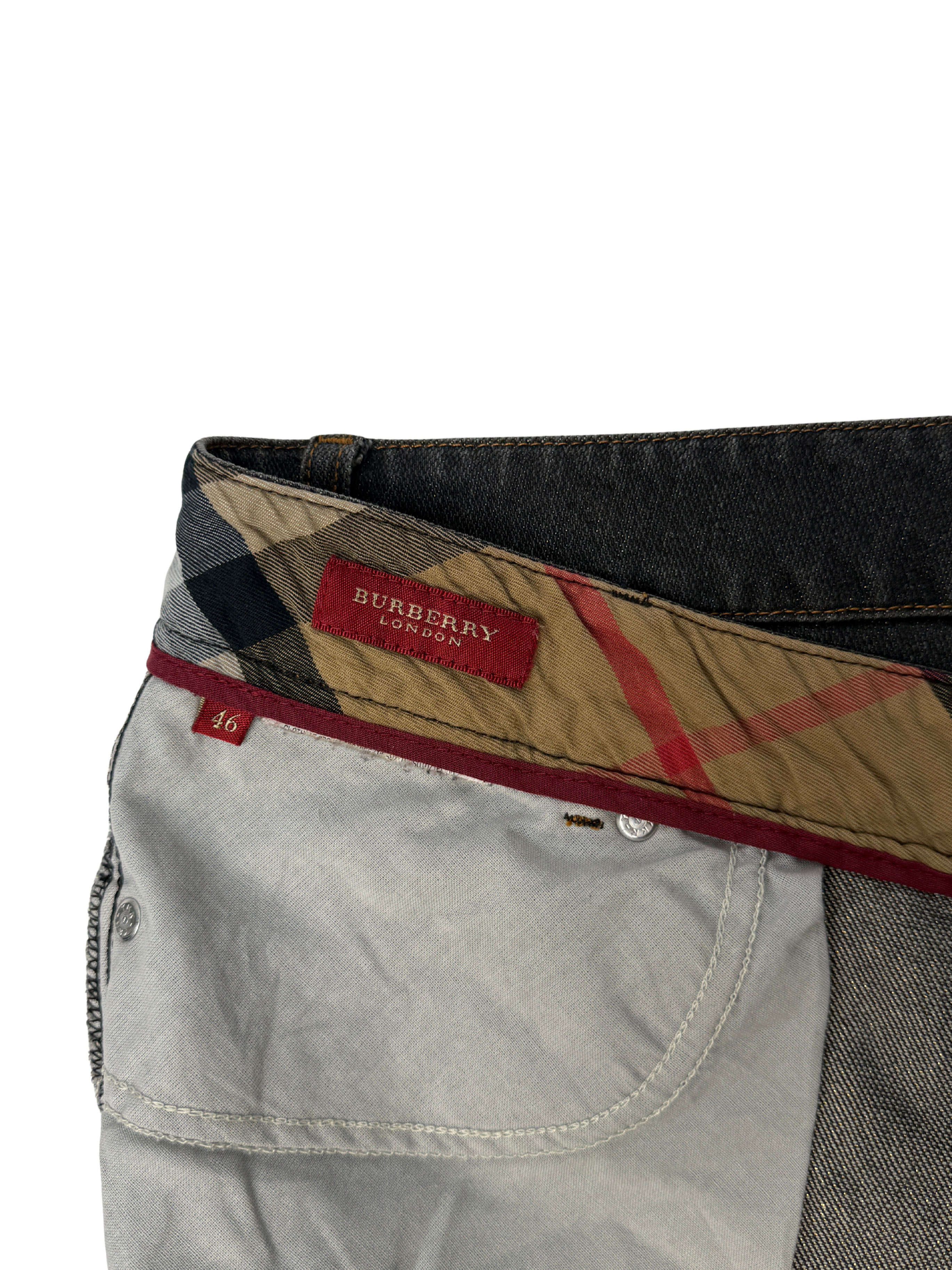 Description: A refined yet striking denim piece by Burberry London, these dark-wash jeans feature a subtle glitter finish that catches the light beautifully. The design includes the brand’s signature equestrian knight emblem embroidered in gold on the back pocket and a matching metal logo detail on the front coin pocket. Crafted in a straight-leg silhouette with a low-rise waist, they combine timeless tailoring with a touch of modern glamour. The interior waistband showcases the iconic Burberry check lining for a signature finish.