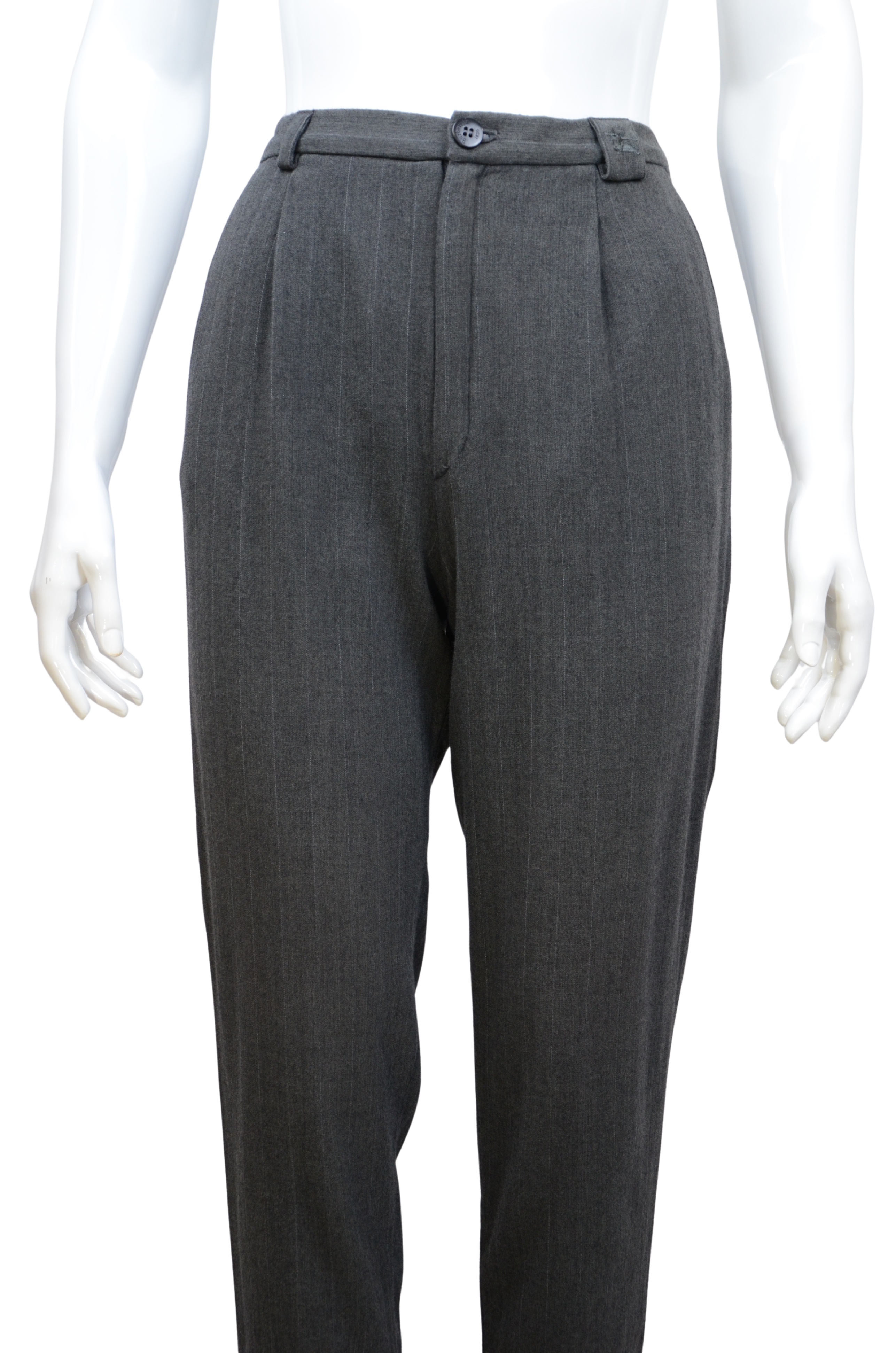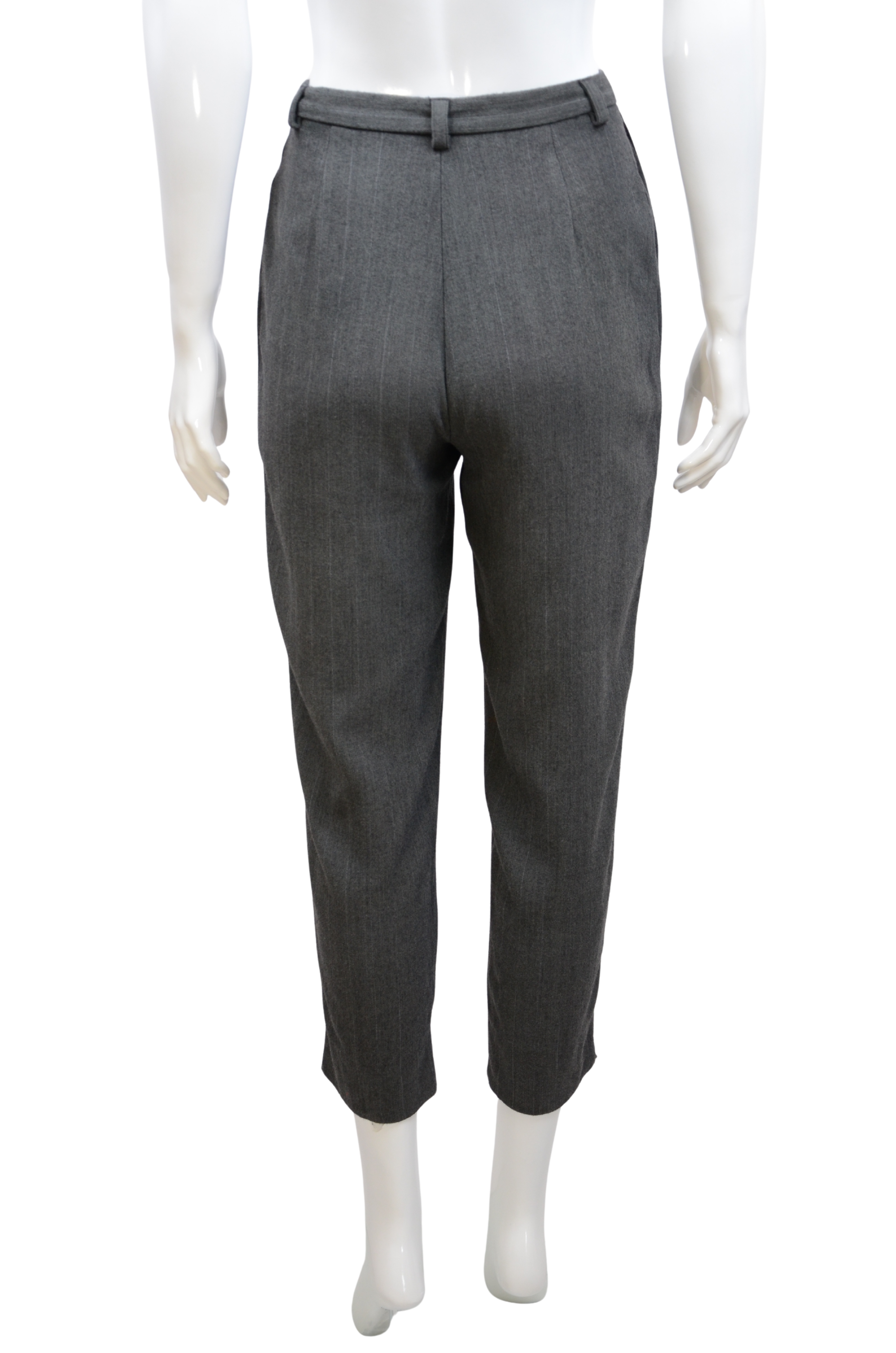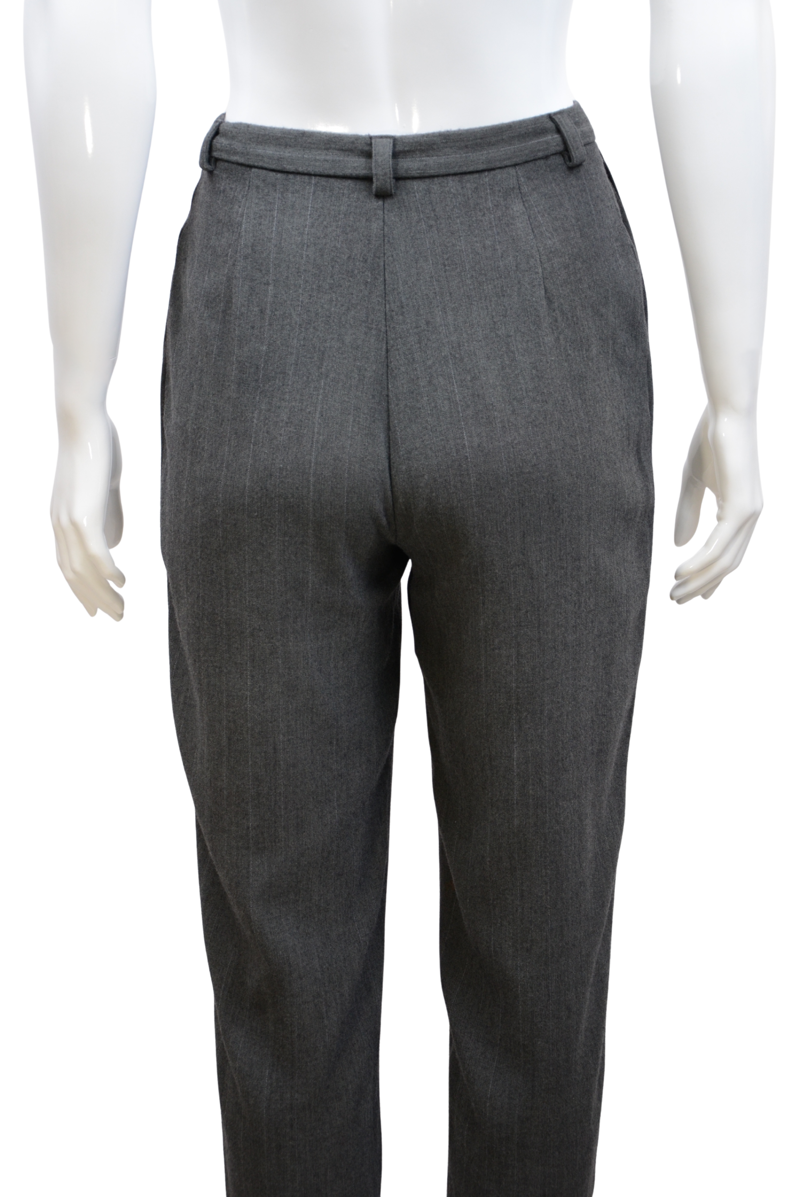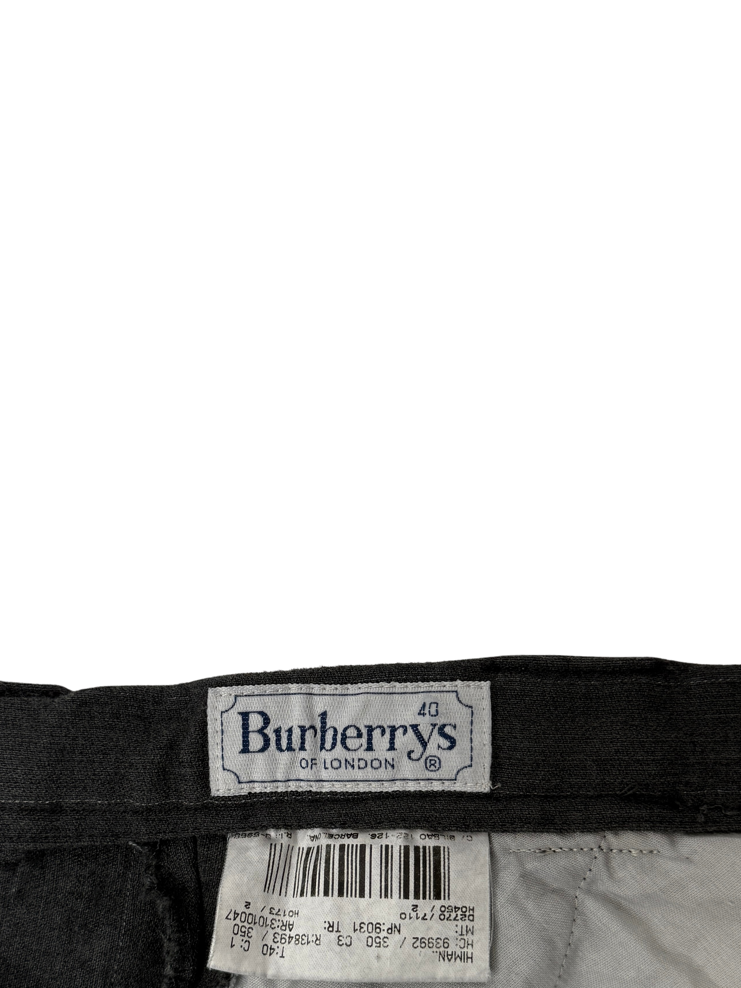 Description: A timeless tailored piece by Burberrys of London, these grey wool trousers feature a refined pinstripe pattern and a slightly cropped, tapered leg for a modern silhouette. The high-waisted fit and front pleats add structure, while the soft wool fabric ensures luxurious comfort and elegant drape. A classic Burberrys label on the inside waistband highlights the brand’s vintage heritage and attention to craftsmanship.