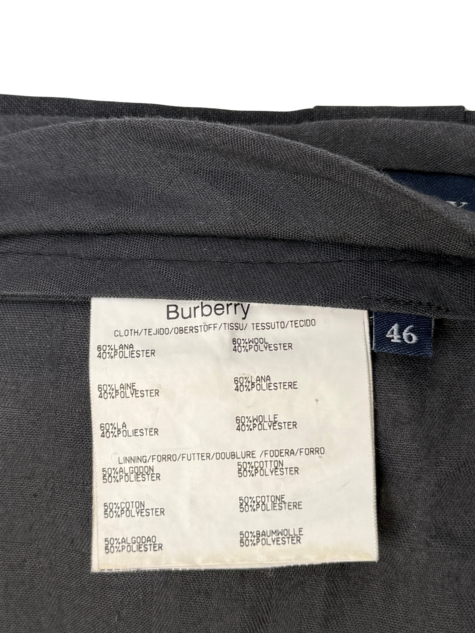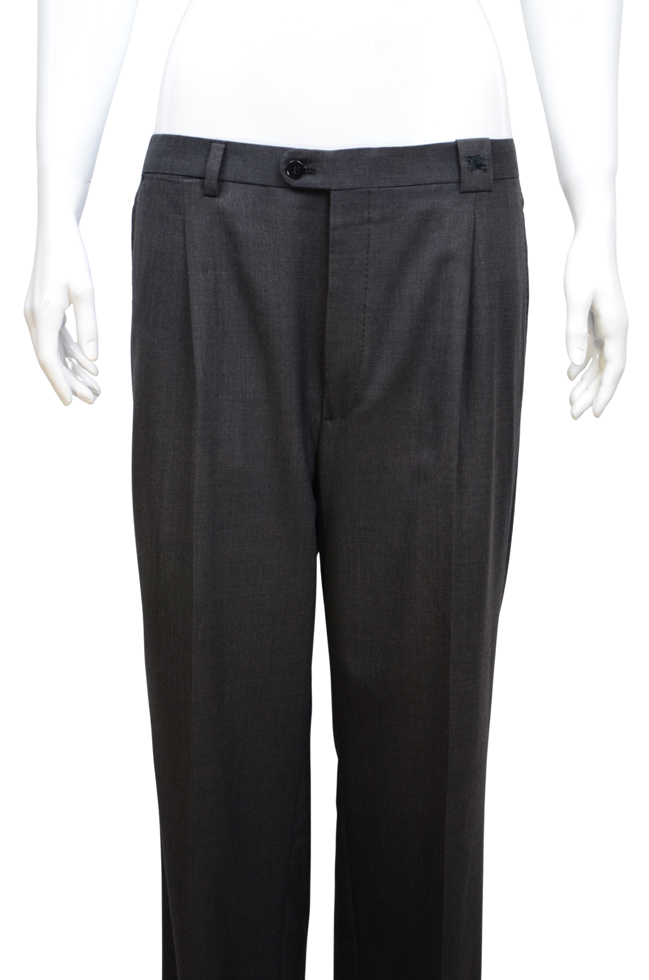 Description: A sophisticated wardrobe essential by Burberry London, these dark charcoal trousers are crafted from a premium wool blend with a soft, lightweight drape. Designed with a mid-rise waist, front pleats, and a straight-leg silhouette, they offer a timeless tailored fit that transitions effortlessly from office to evening wear. Finished with discreet Burberry logo detailing at the waistband, the design reflects the brand’s refined British tailoring heritage.