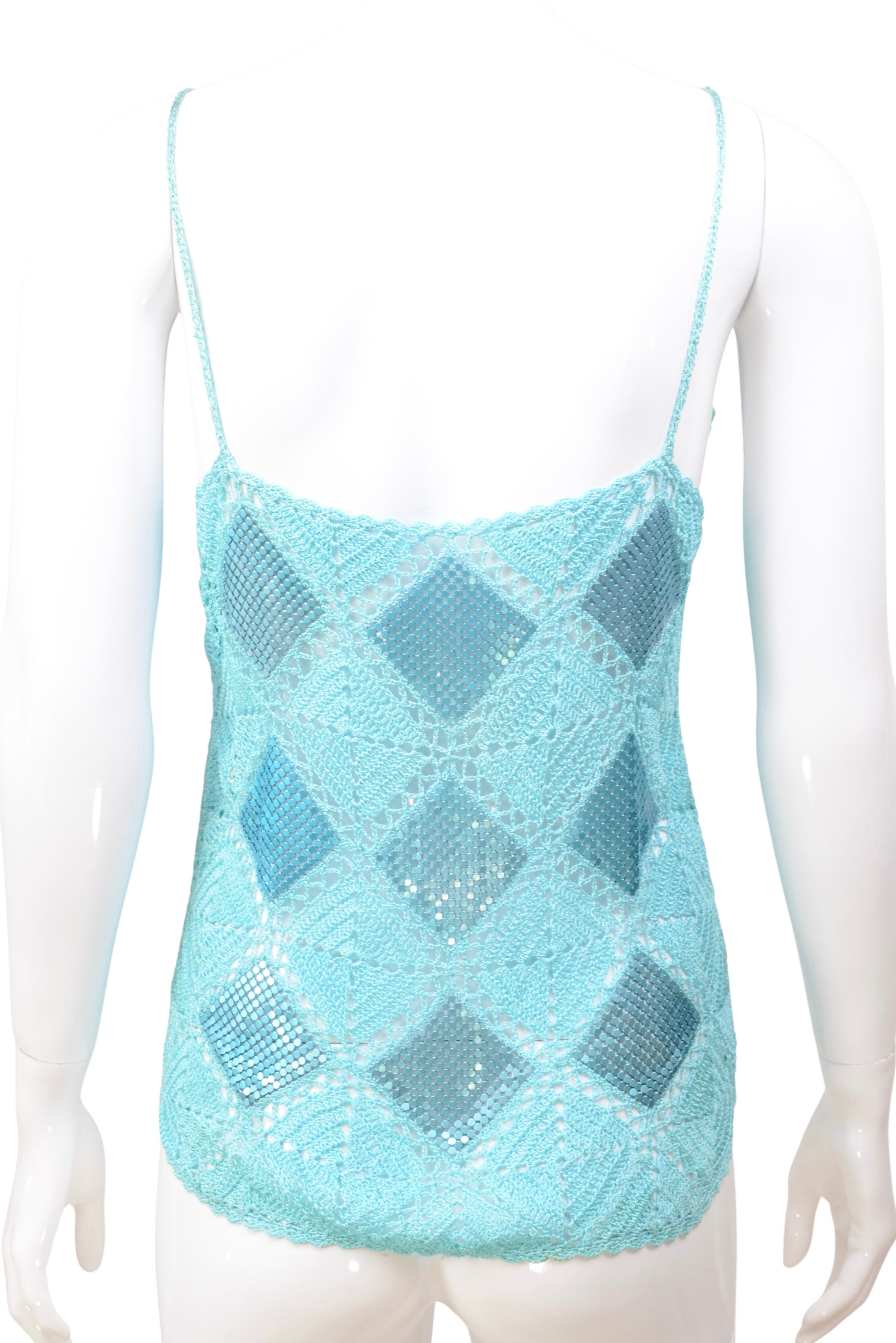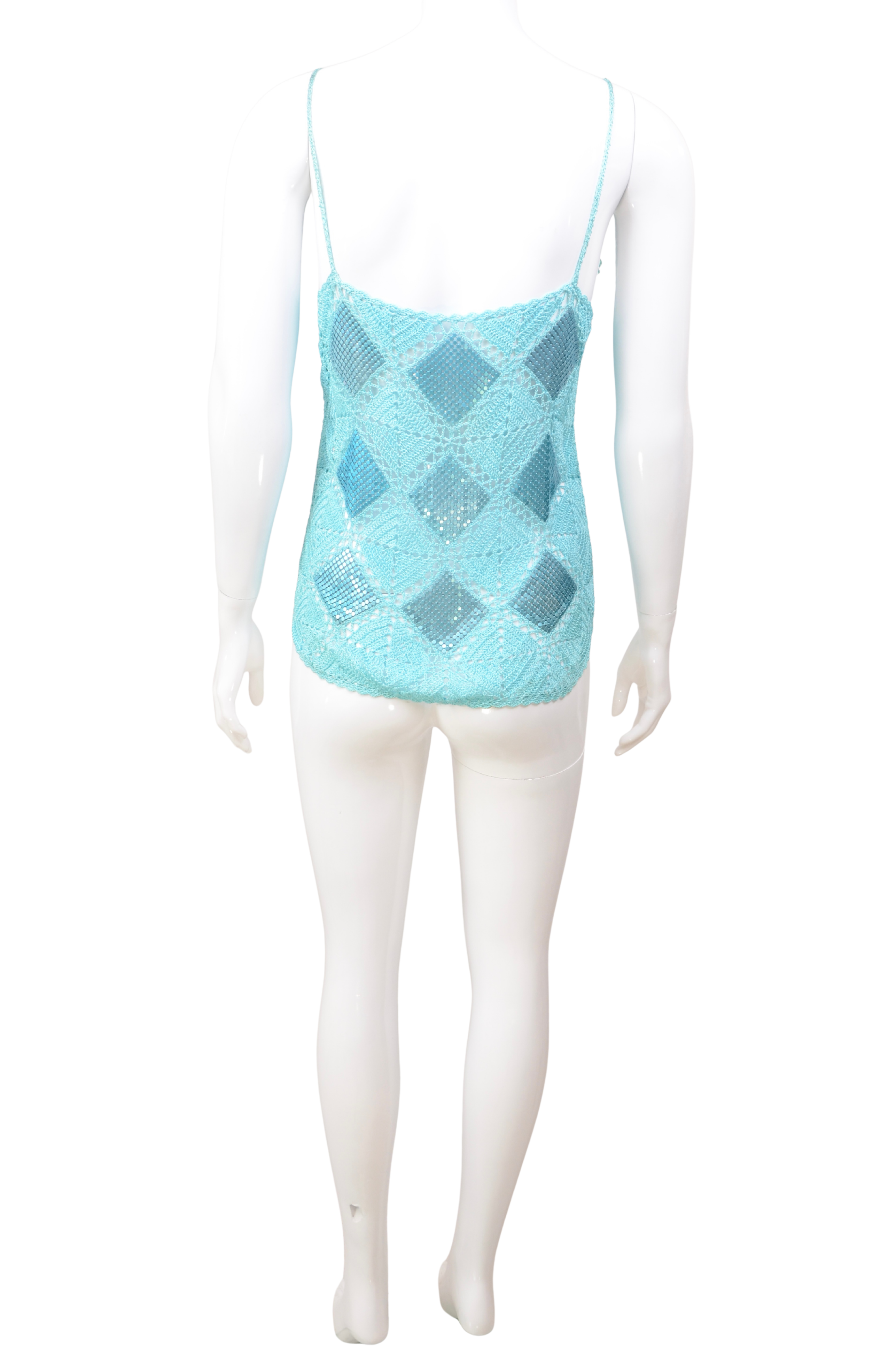 Italian Vintage Turquoise Crochet Cami with Sequin Diamond Pattern