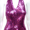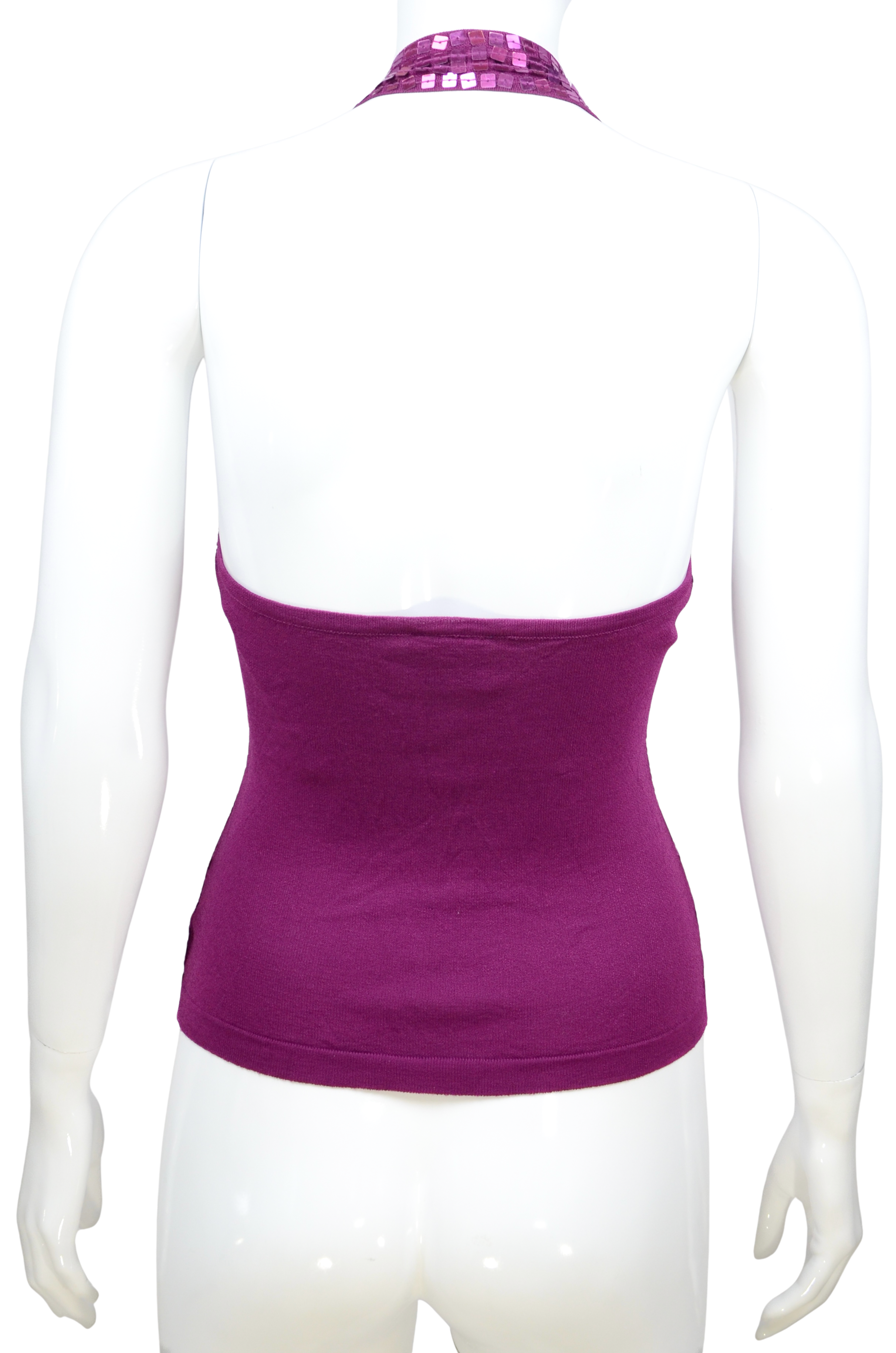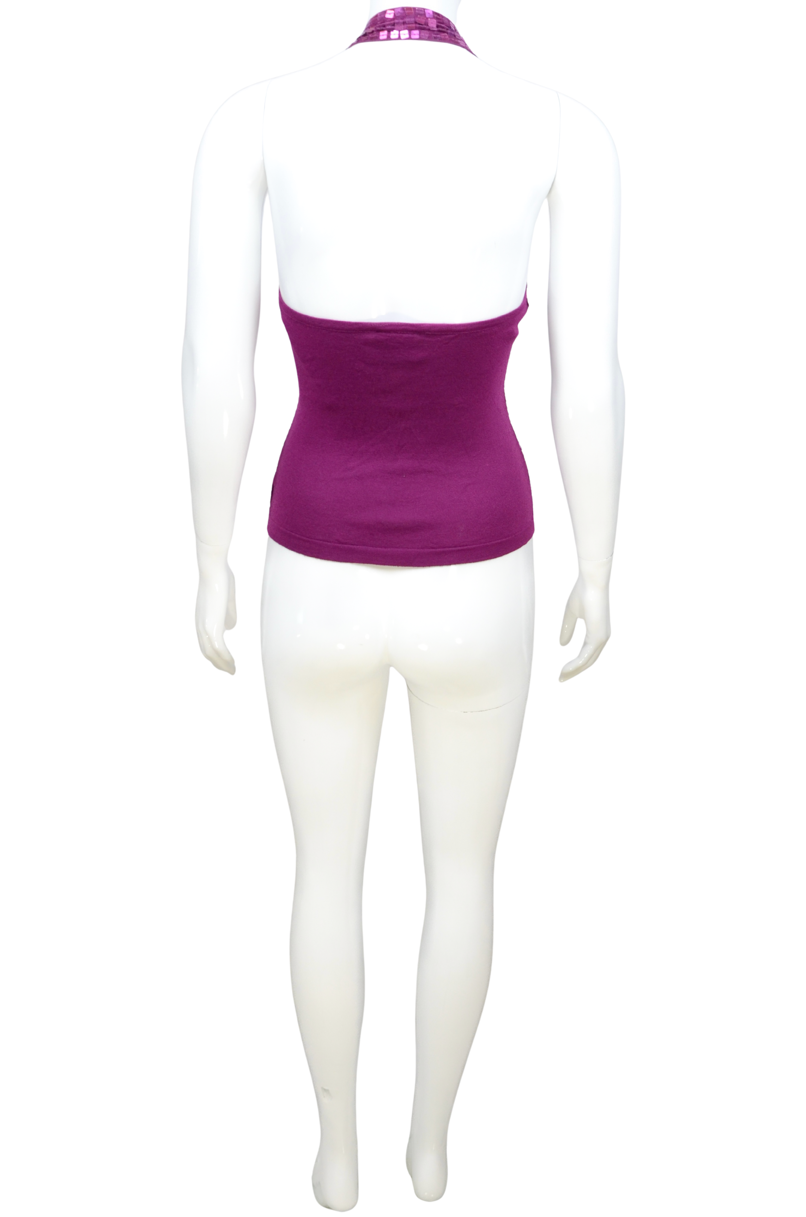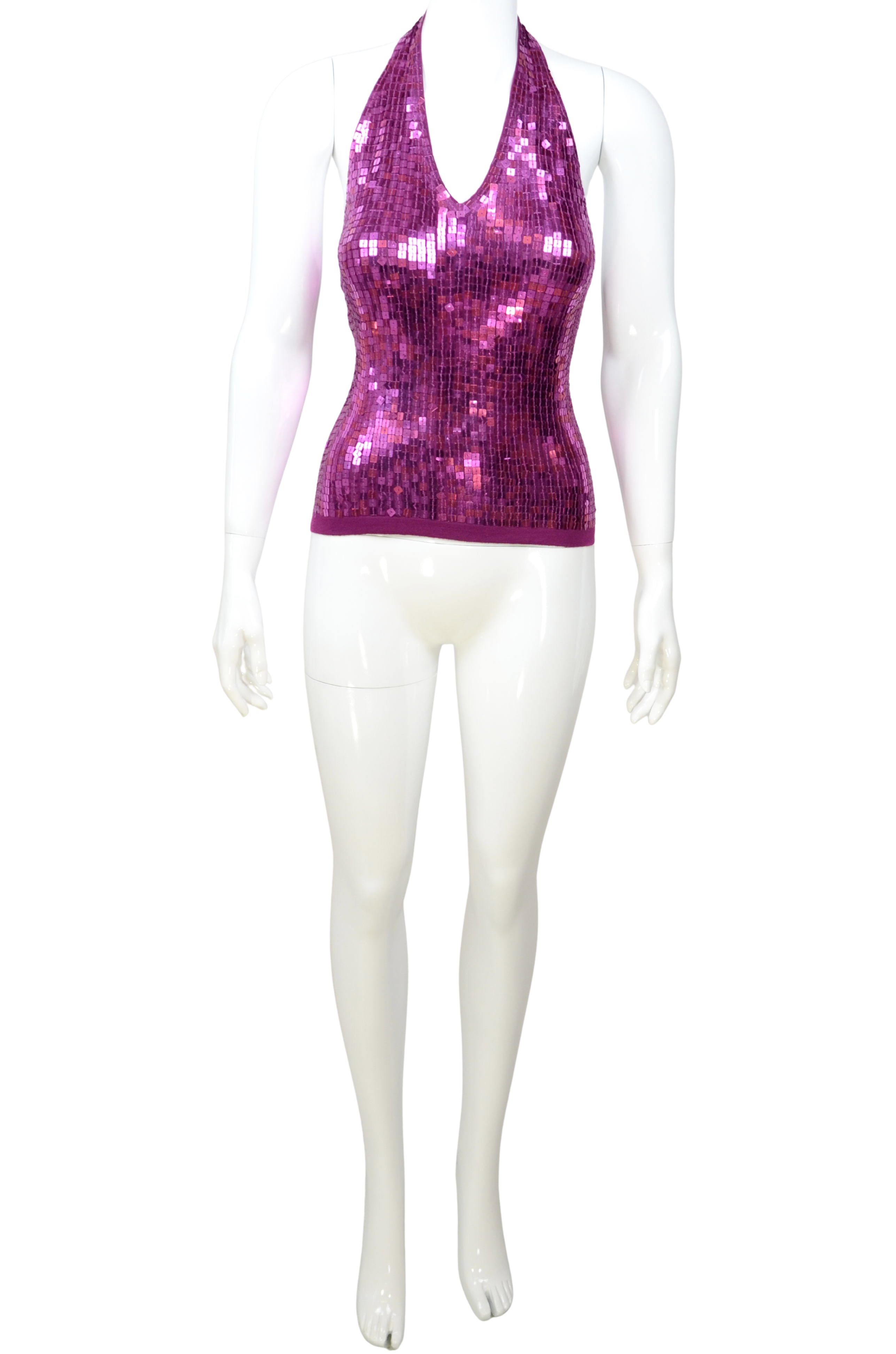 Description: turn heads with this shimmering magenta halter top from Pilot Club, a true Y2K party essential. Covered in a grid of glossy sequins, this piece captures the iconic early-2000s clubwear vibe with its plunging halter neckline and open back. The stretch jersey base ensures comfort and a flattering fit, while the dazzling surface reflects light from every angle — perfect for the dance floor. A nostalgic gem for lovers of retro nightlife fashion.
