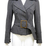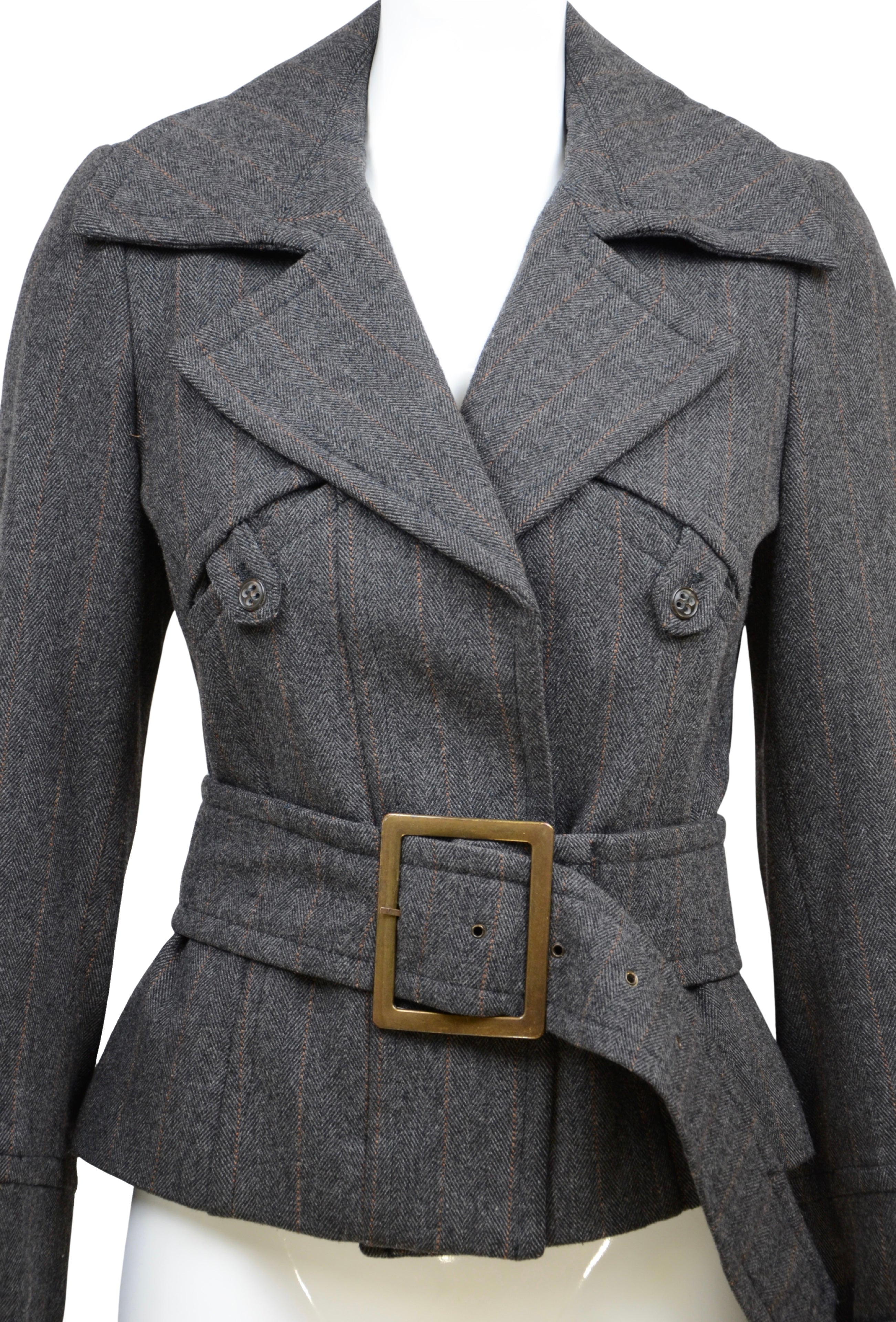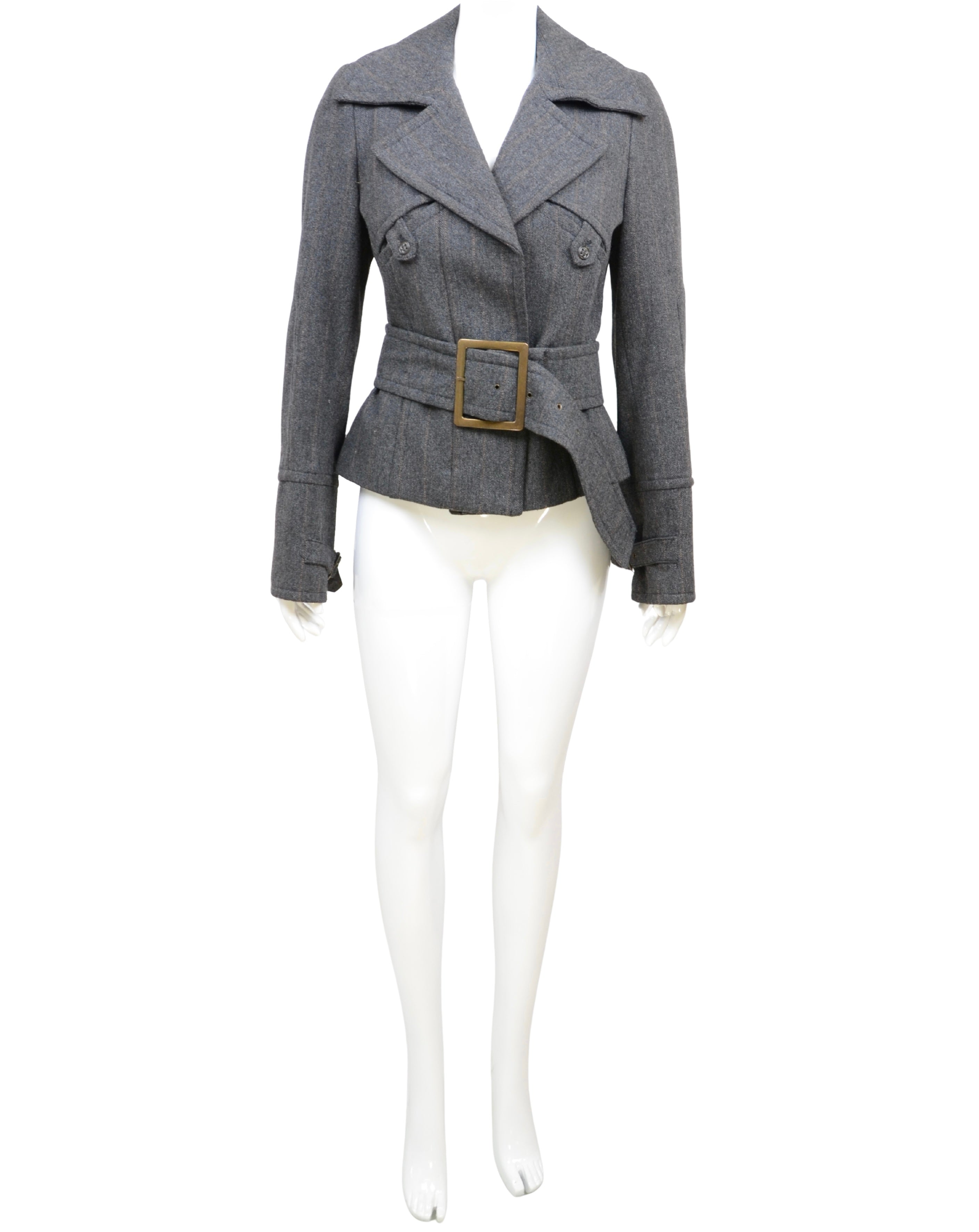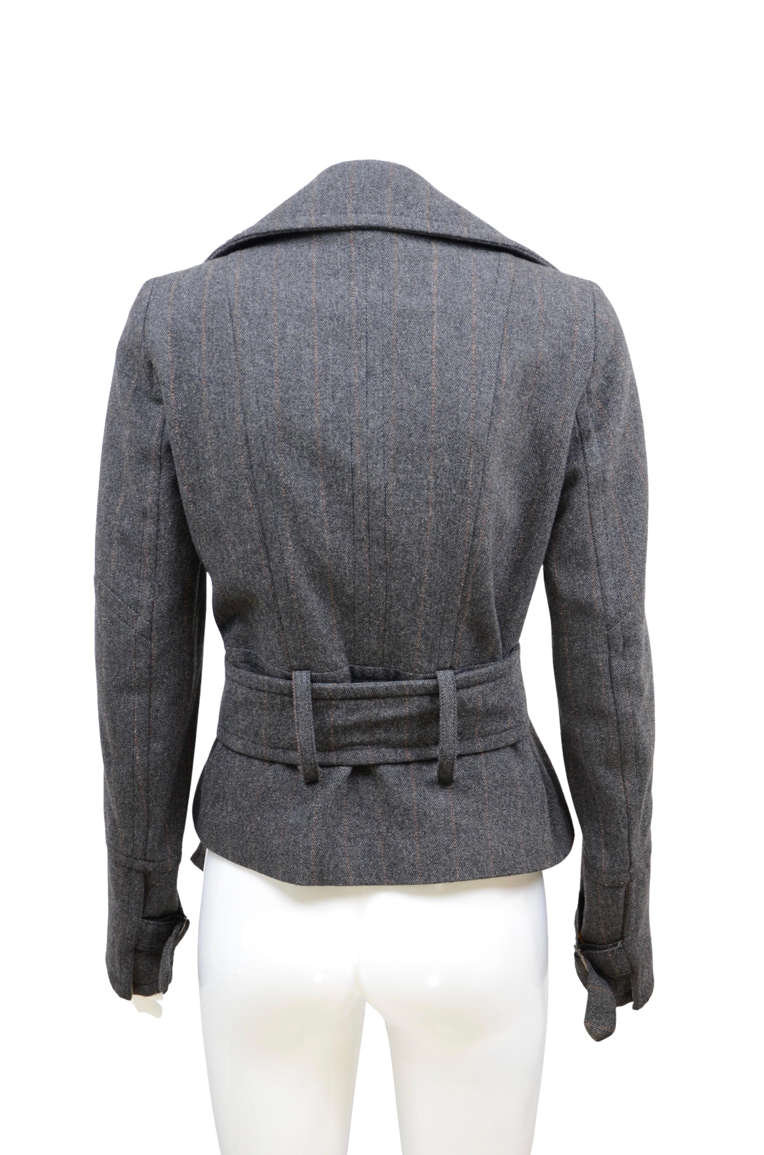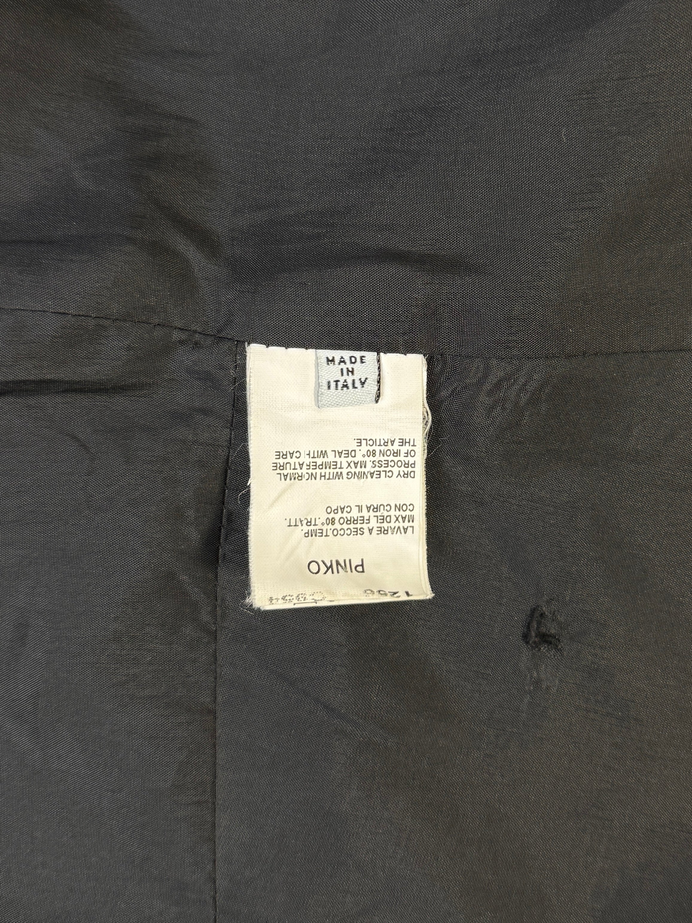 Description: A tailored statement piece by Pinko, this structured jacket is crafted in a rich wool-blend with subtle pinstripes. Featuring a wide lapel collar, double-breasted button closure, and a cinched waist with a bold oversized belt, the design creates a flattering hourglass silhouette. Perfect for elevating both office and evening looks, this jacket embodies Pinko’s refined Italian tailoring with a modern edge.
