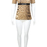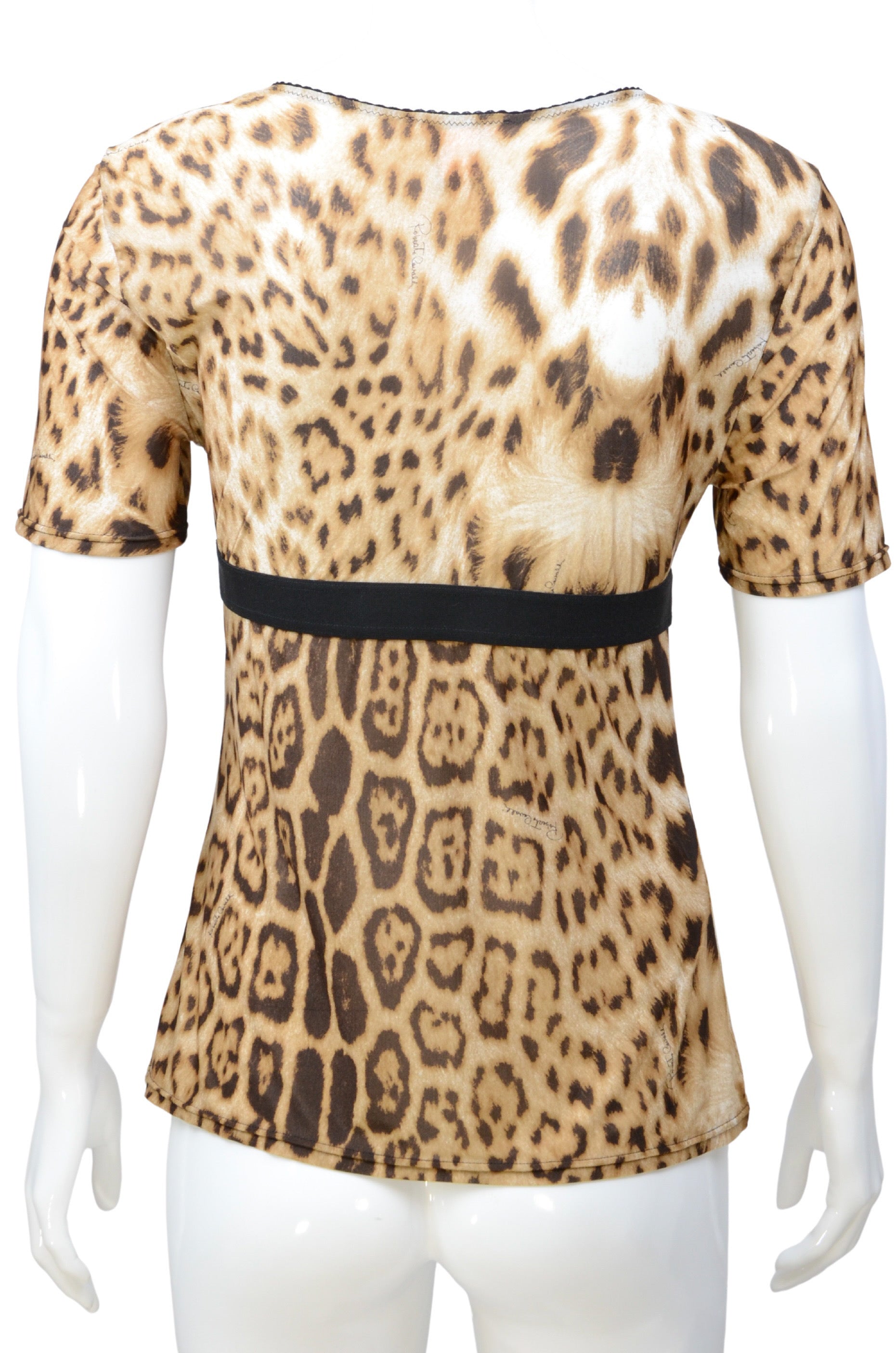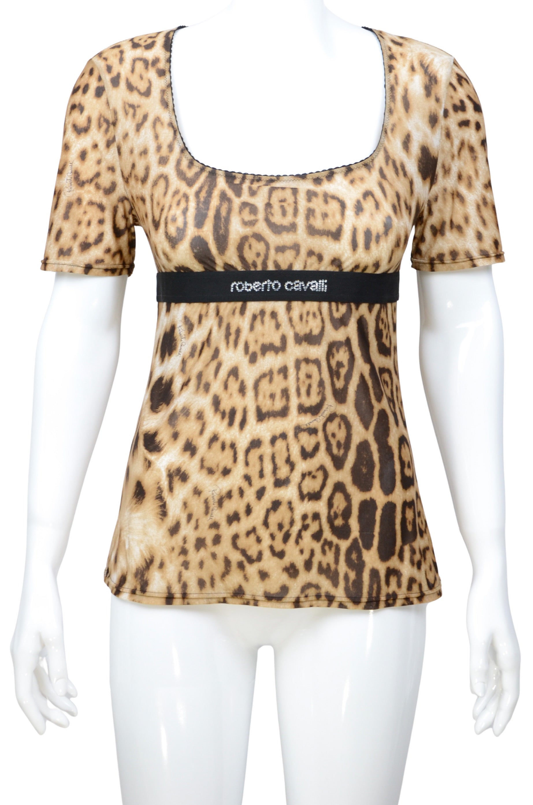 Description: step into bold Italian glamour with this Roberto Cavalli top, crafted in signature leopard print stretch fabric. Designed with a flattering square neckline and short sleeves, the silhouette is both feminine and modern. A black waistband with crystal embellished Roberto Cavalli logo accentuates the waist and adds a touch of sparkle to the wild print. Perfect to pair with tailored trousers or a sleek skirt, this top captures Cavalli’s iconic mix of sensuality and sophistication.