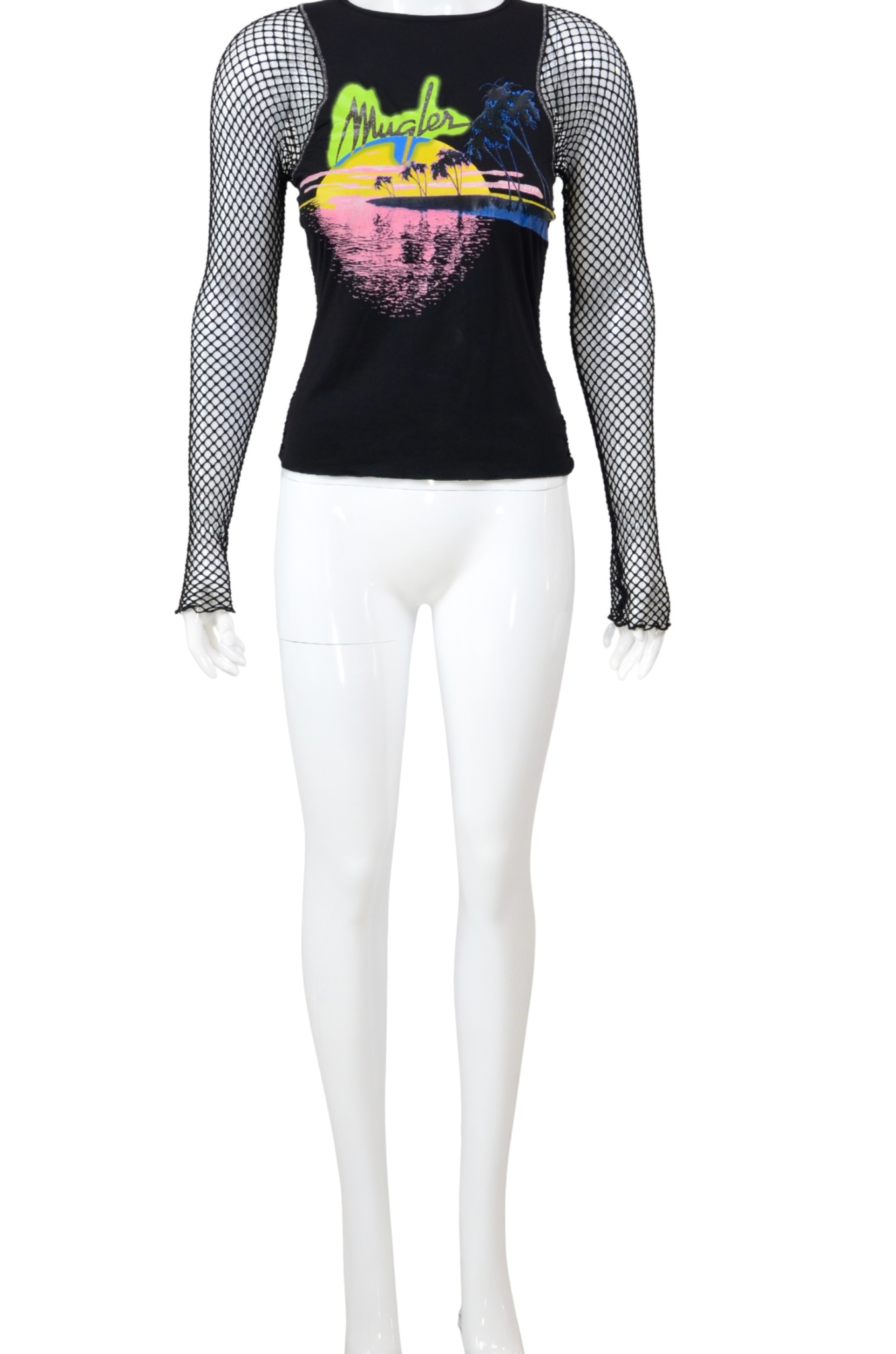 Thierry Mugler Mesh Sleeve Graphic Top – Estimated Size S