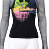 Description: This rare Thierry Mugler top features a bold tropical sunset graphic with neon tones and the “Mugler” logo on the front. Designed with contrast black fishnet mesh sleeves for a striking Y2K look. A collector-worthy piece that fuses early 2000s glam with edgy attitude.