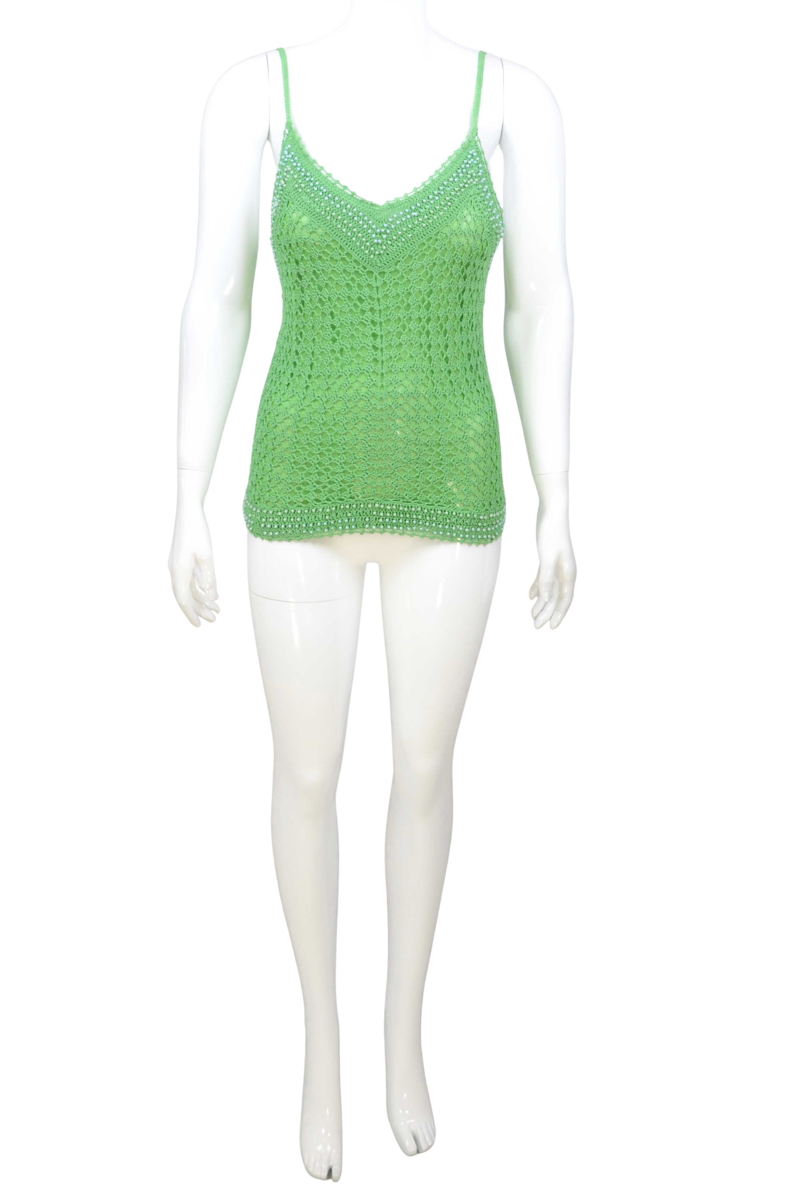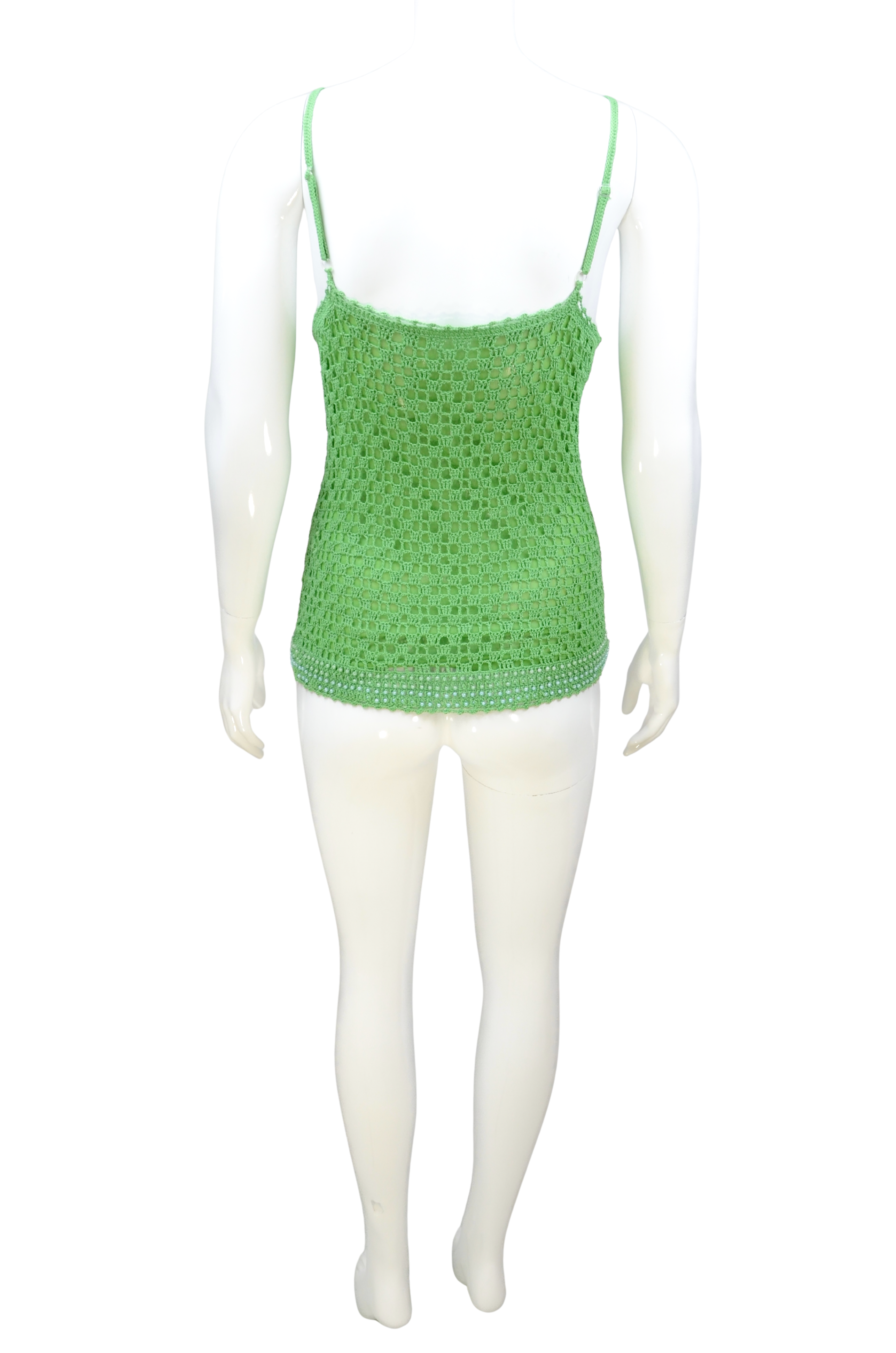 Description: stel into early 2000s nostalgia with this vibrant green Y2K crochet camisole. Crafted from 100% viscose, this lightweight piece features intricate open-knit patterns and a flattering V-neckline with thin adjustable straps. The breathable crochet design makes it perfect for layering over swimwear, bralettes, or a fitted tee for that effortlessly cool retro vibe. A true throwback staple that embodies the playful and carefree spirit of the era.