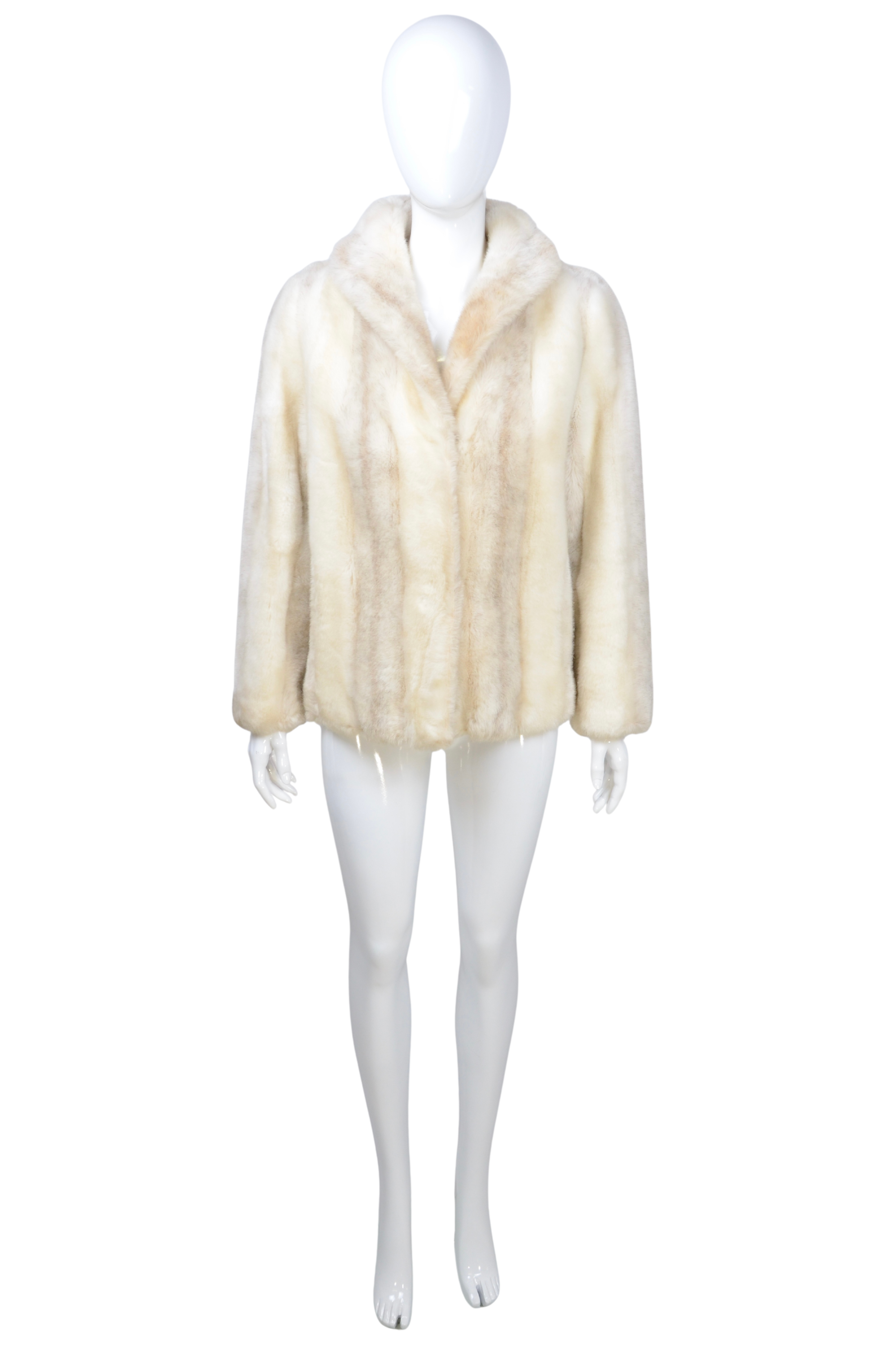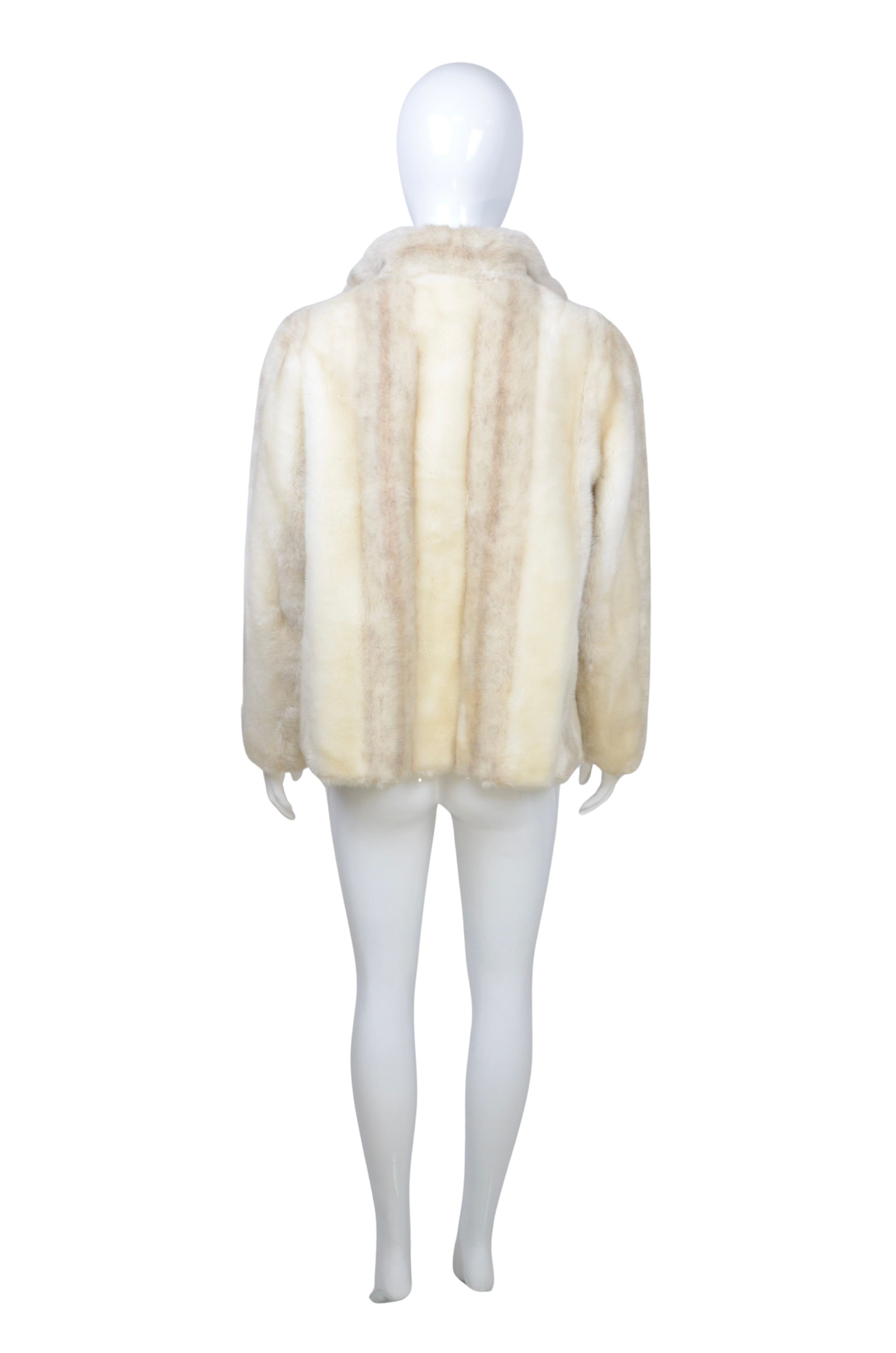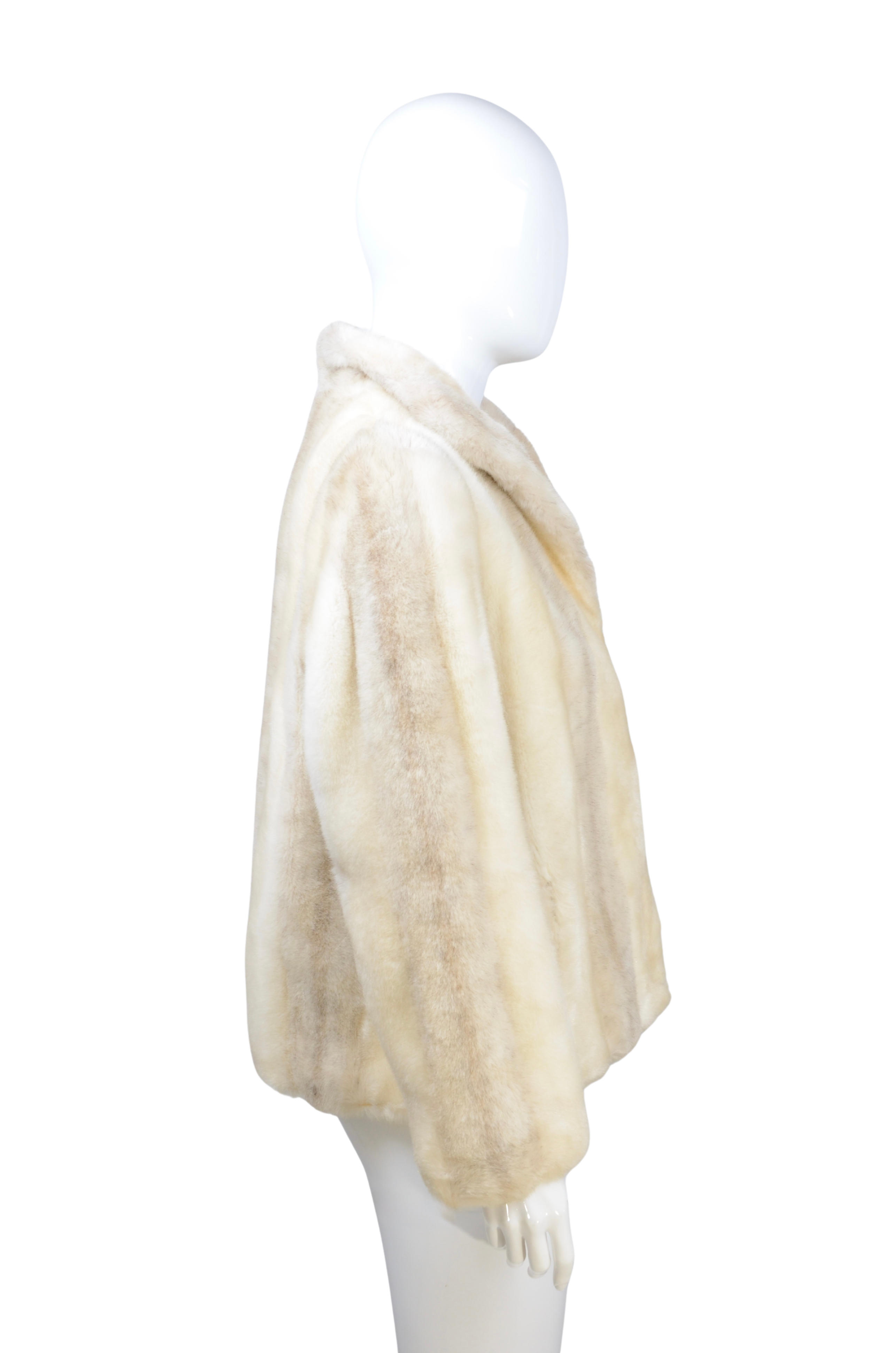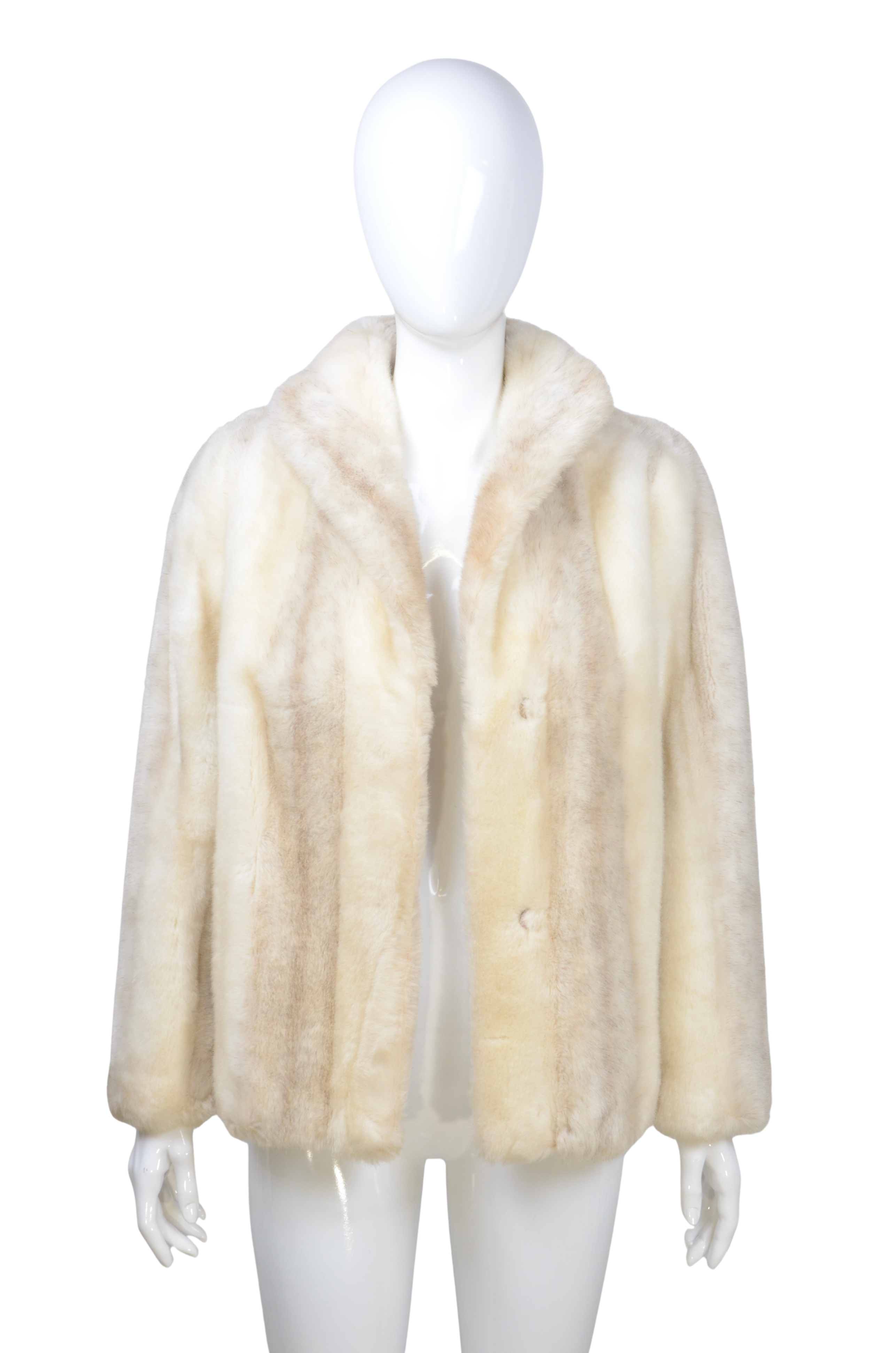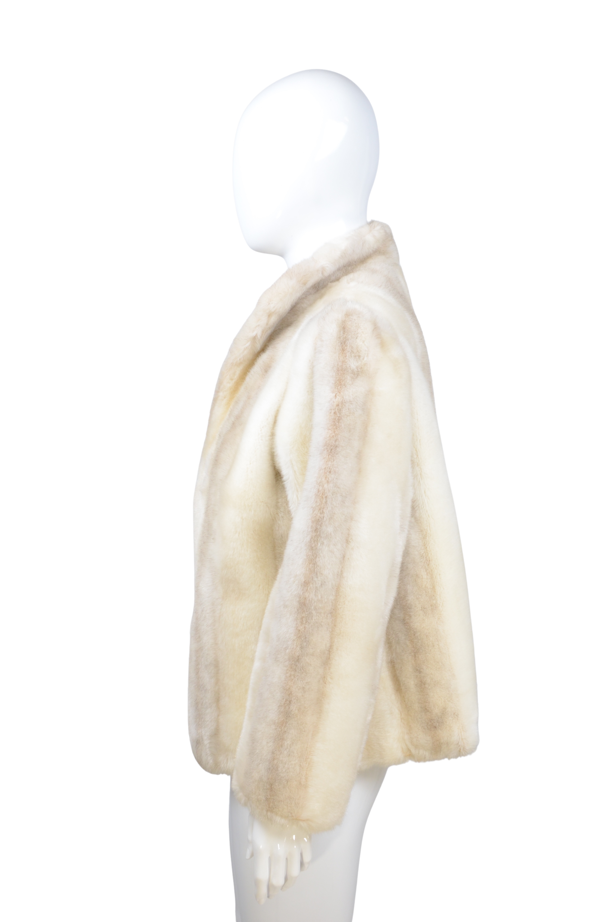 Description: this elegant cream faux fur coat brings a touch of timeless sophistication to any look. Designed in a soft neutral tone with a subtle sheen, it offers the luxurious feel of fur while remaining animal-friendly. The clean silhouette and slightly cropped fit make it a versatile choice for both day and evening styling. The coat closes with discreet hook-and-eye fastenings, adding to its refined finish.