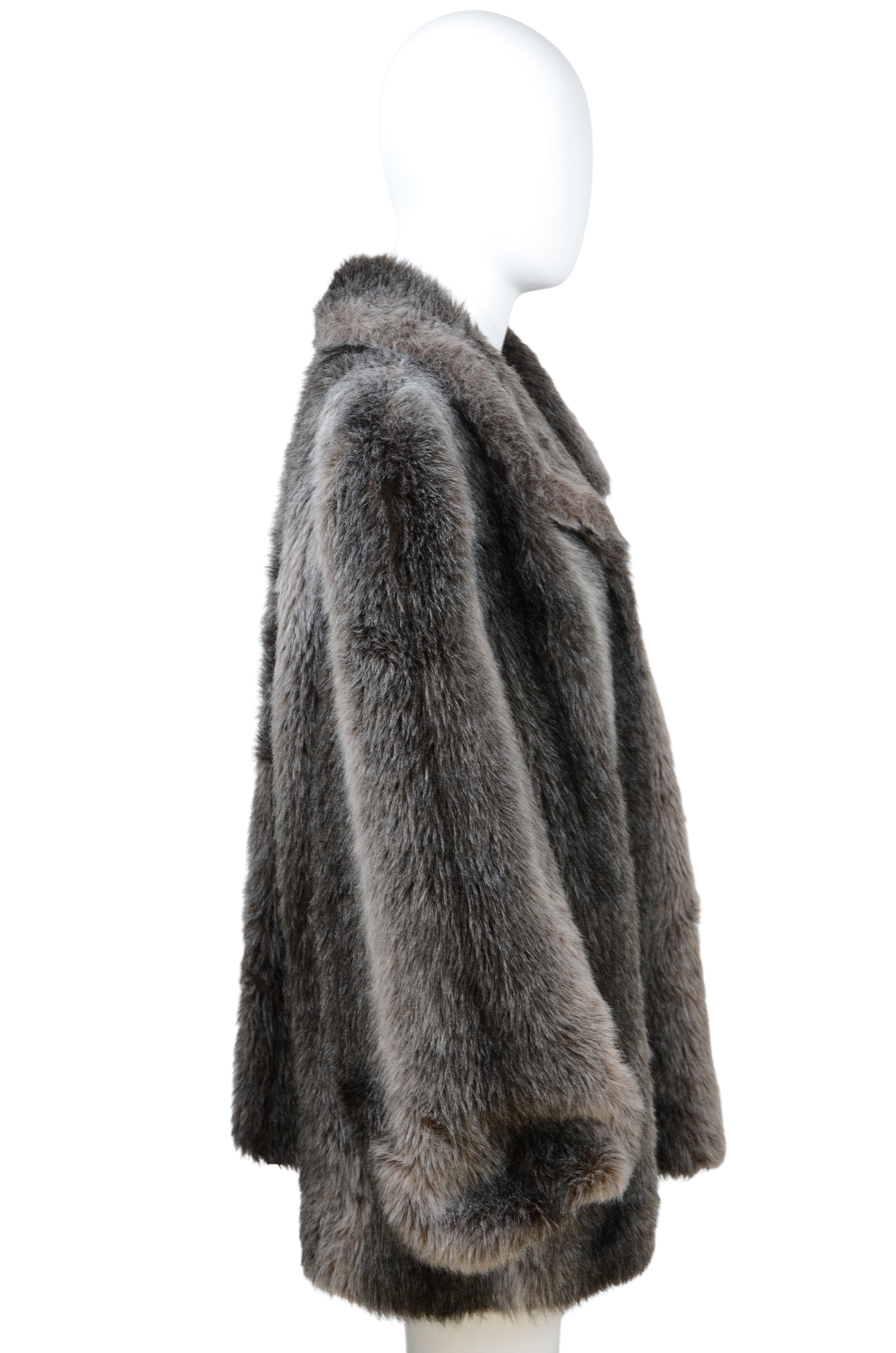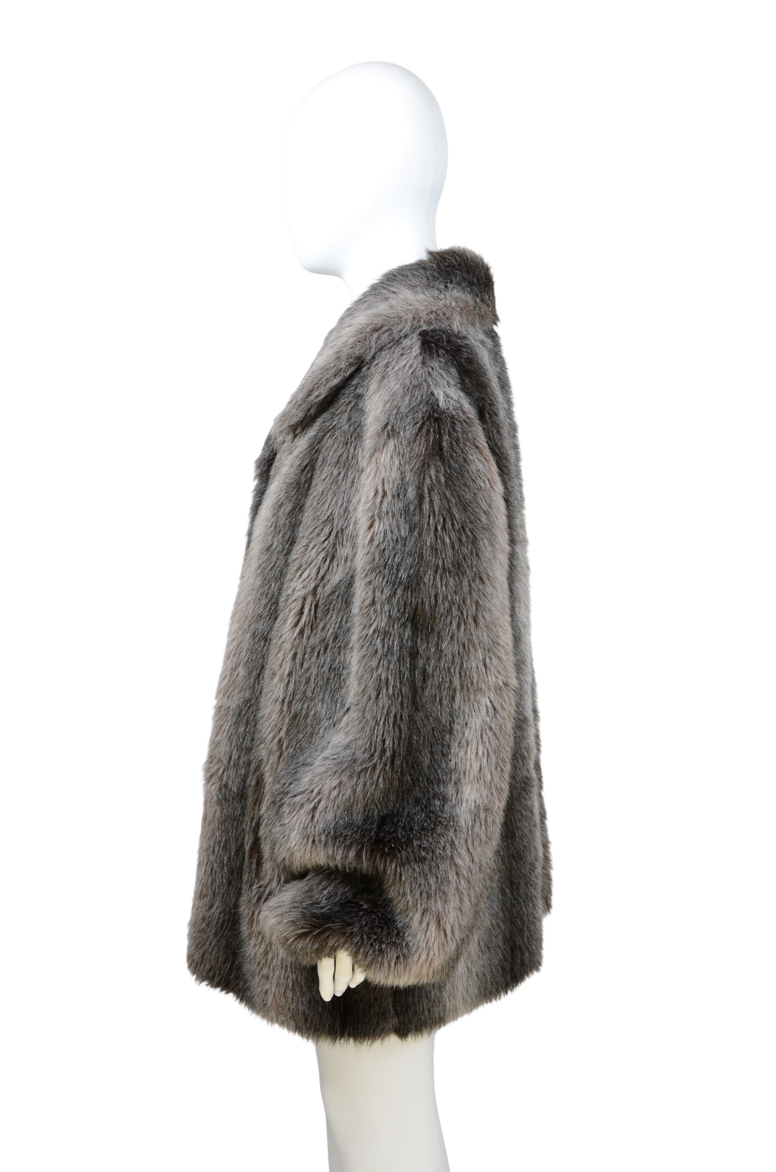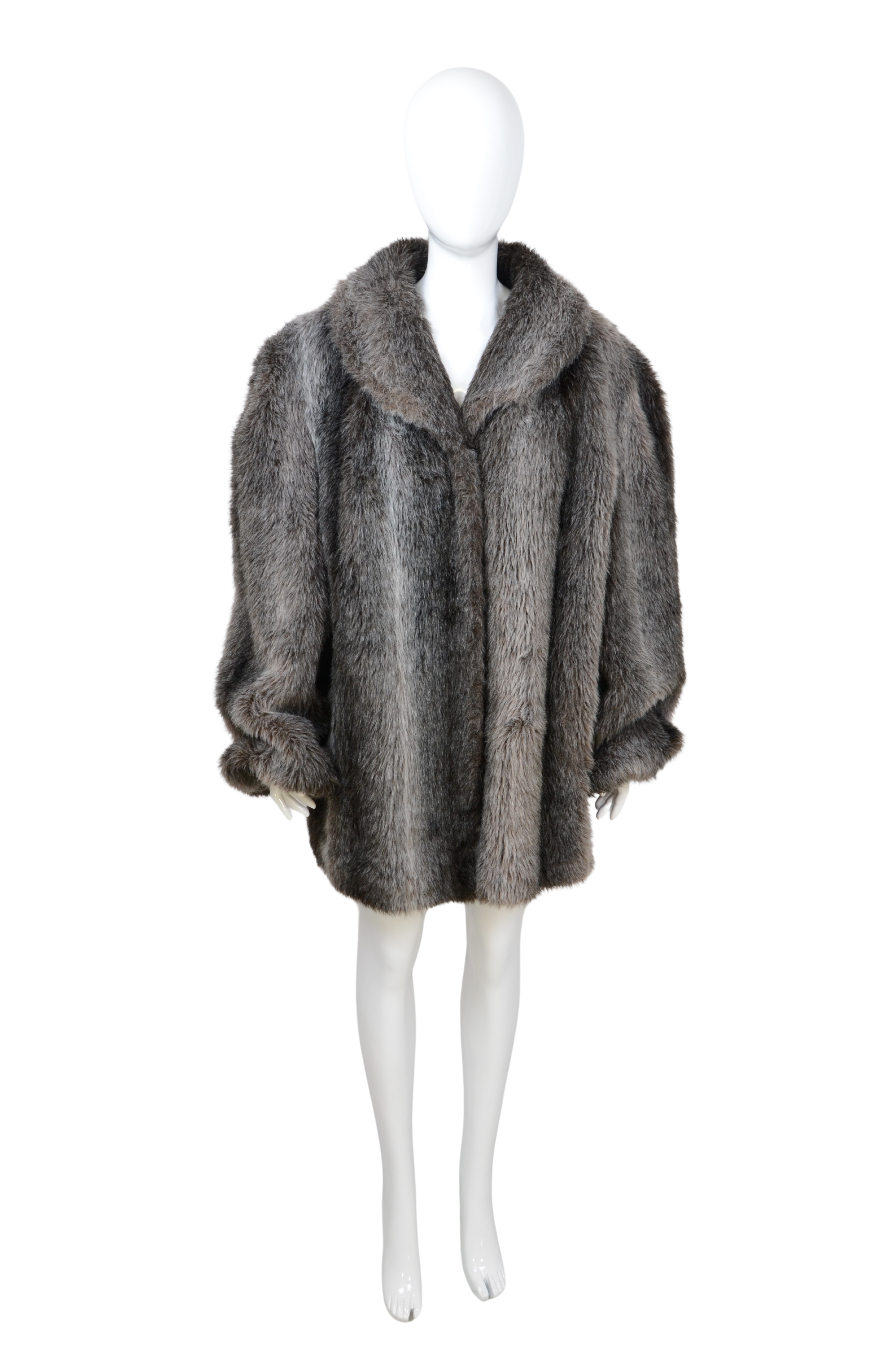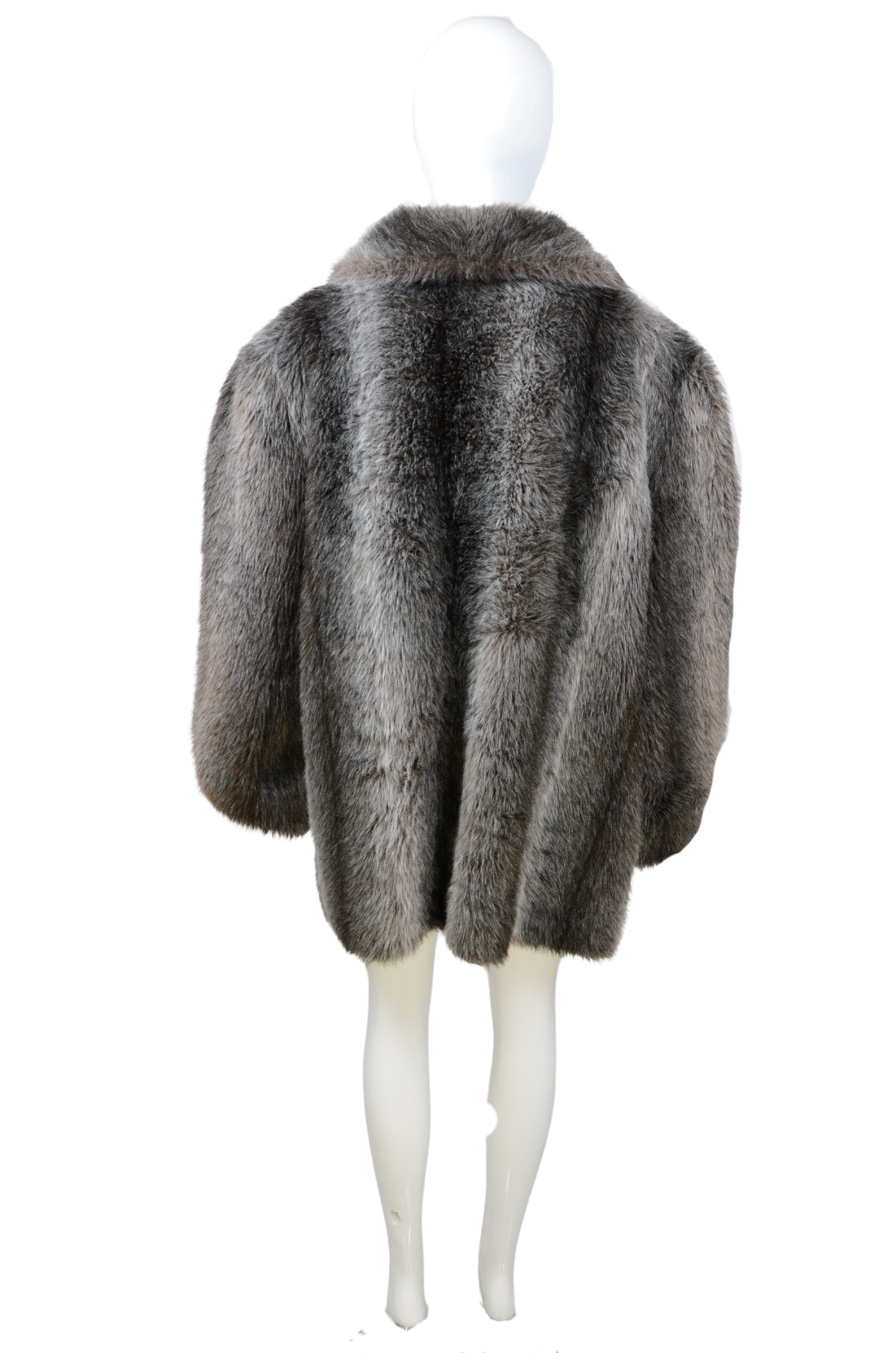 Description: this vintage faux fur coat in a deep gray tone combines timeless elegance with a cozy oversized fit. The soft texture and subtle sheen give it a luxurious look, while the wide collar and relaxed silhouette make it versatile for both day and evening wear. A chic, animal-friendly alternative to real fur, offering warmth and glamour in equal measure.