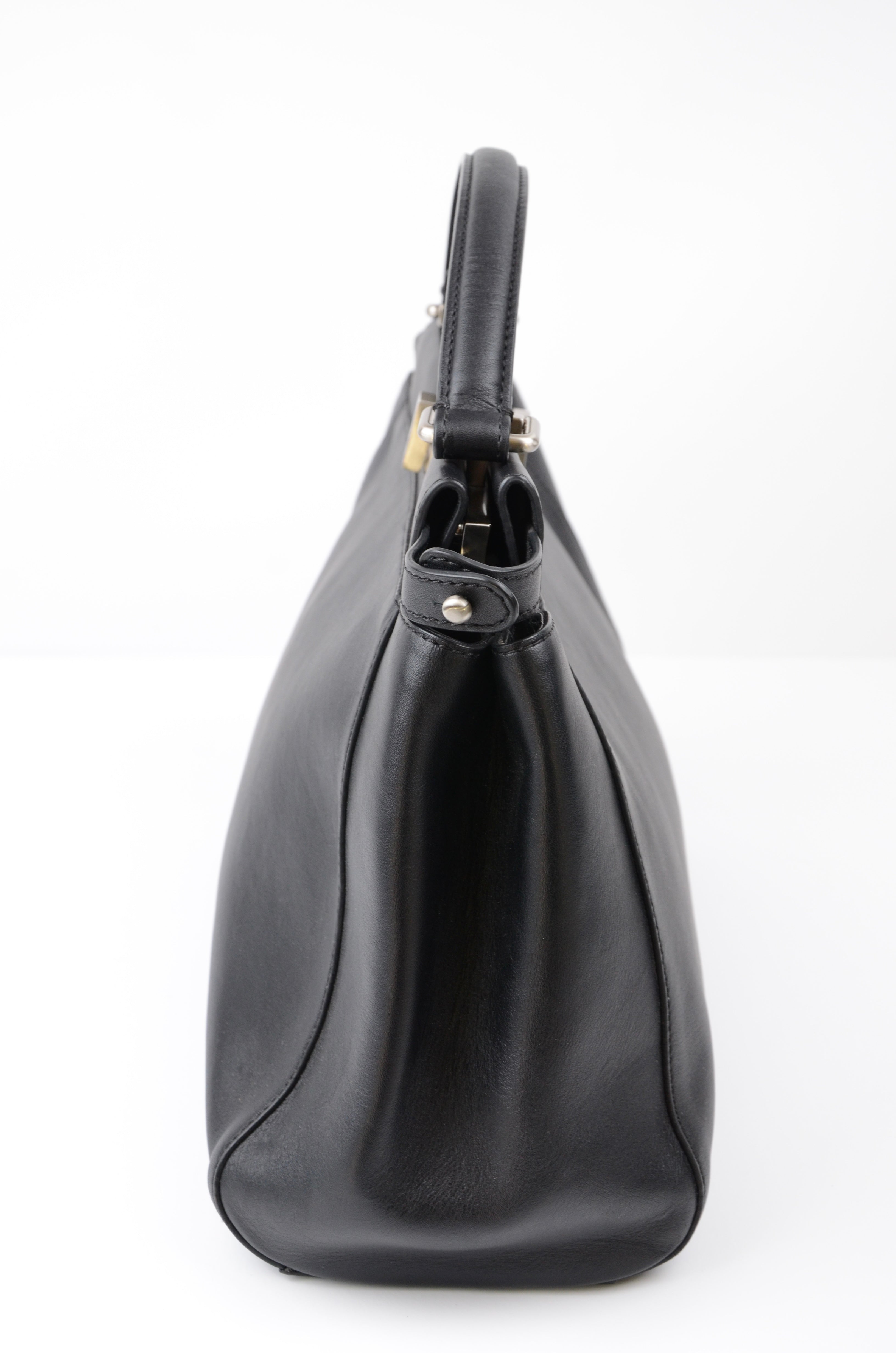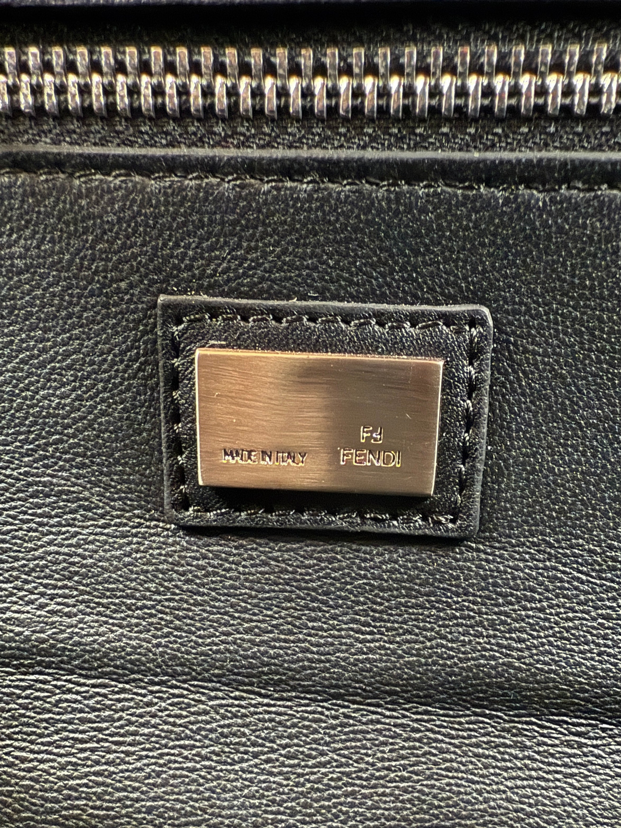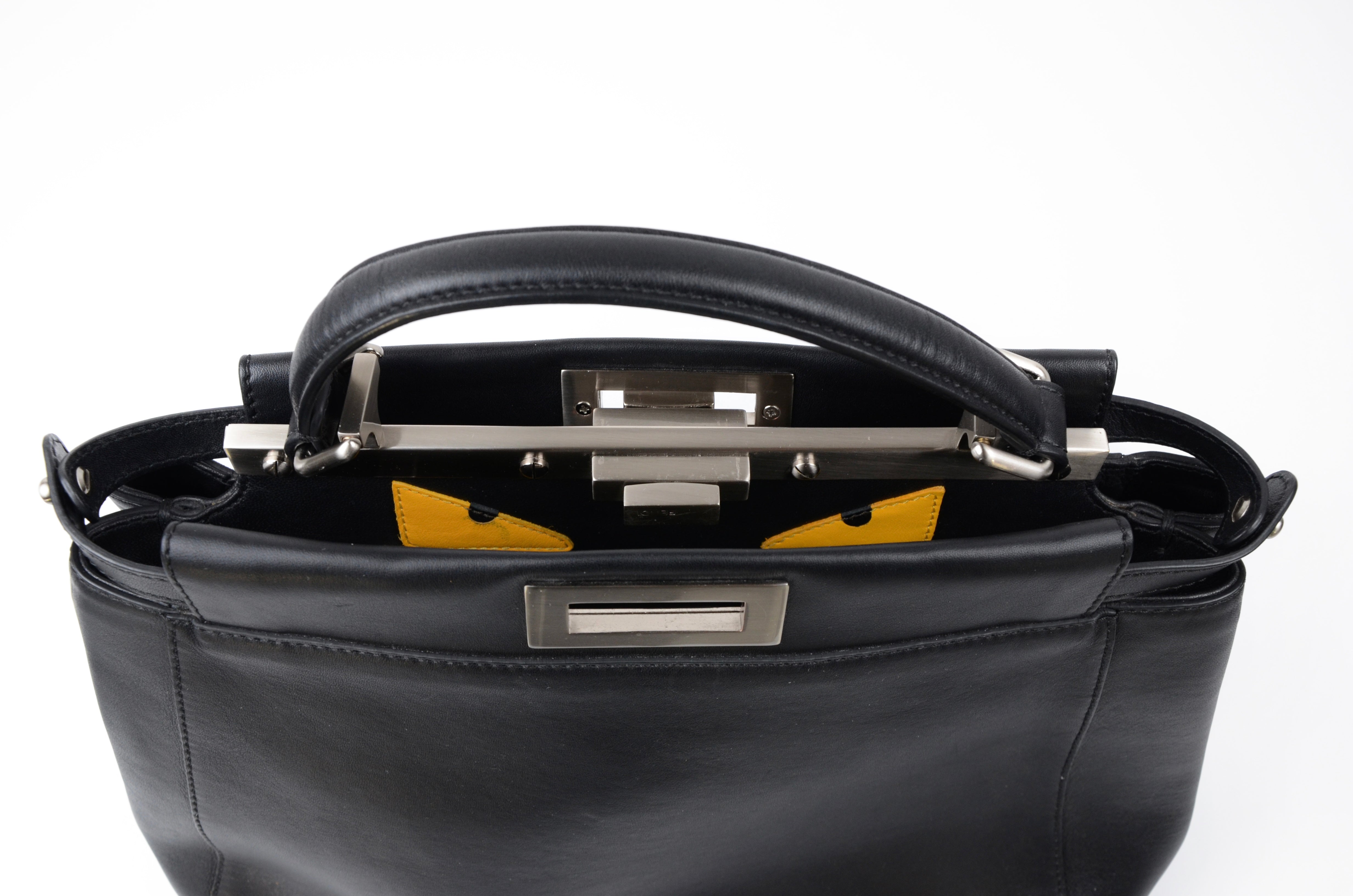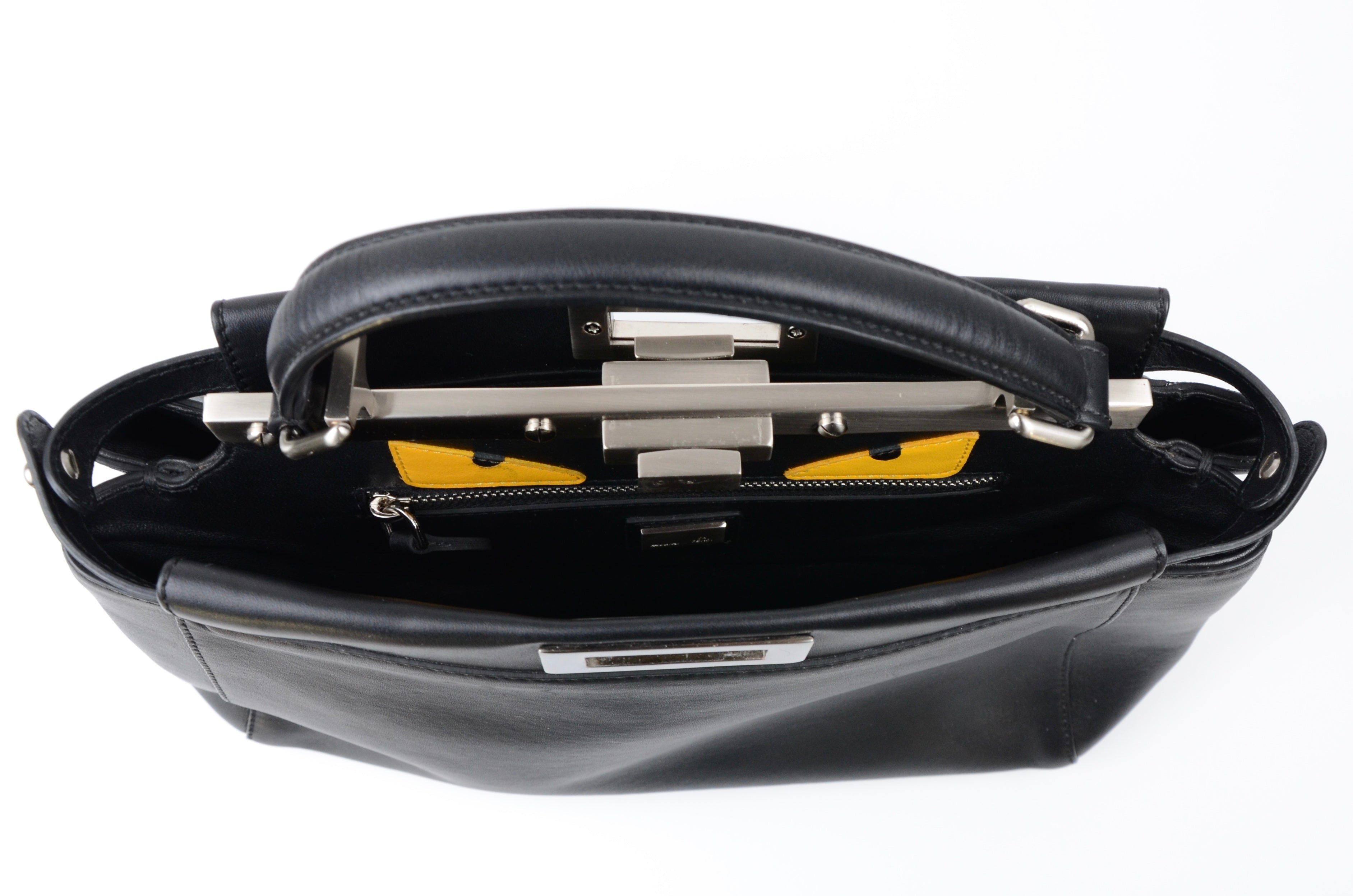 Description: step into understated luxury with this iconic Fendi Peekaboo Medium handbag, crafted in Italy. Designed in smooth black leather, this timeless piece combines refined elegance with a modern edge. The structured silhouette features the signature twist lock closure, revealing a playful interior with the distinctive yellow monster eyes motif, a subtle nod to Fendi’s creative spirit. Dual compartments with a central zip pocket ensure practicality, while the top handle and detachable shoulder strap offer versatile styling options. A true investment piece that captures the essence of Fendi’s craftsmanship and bold design heritage.
