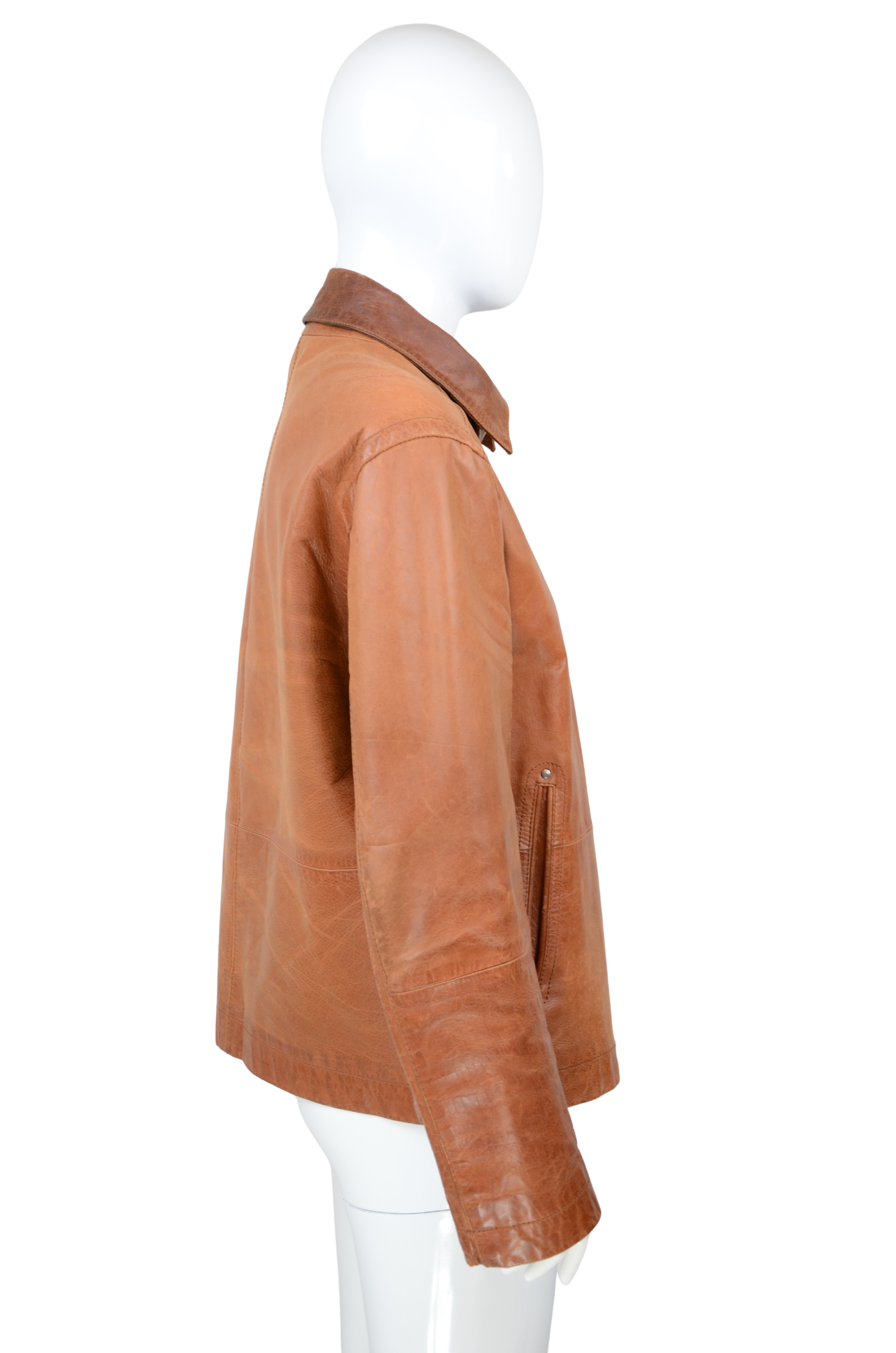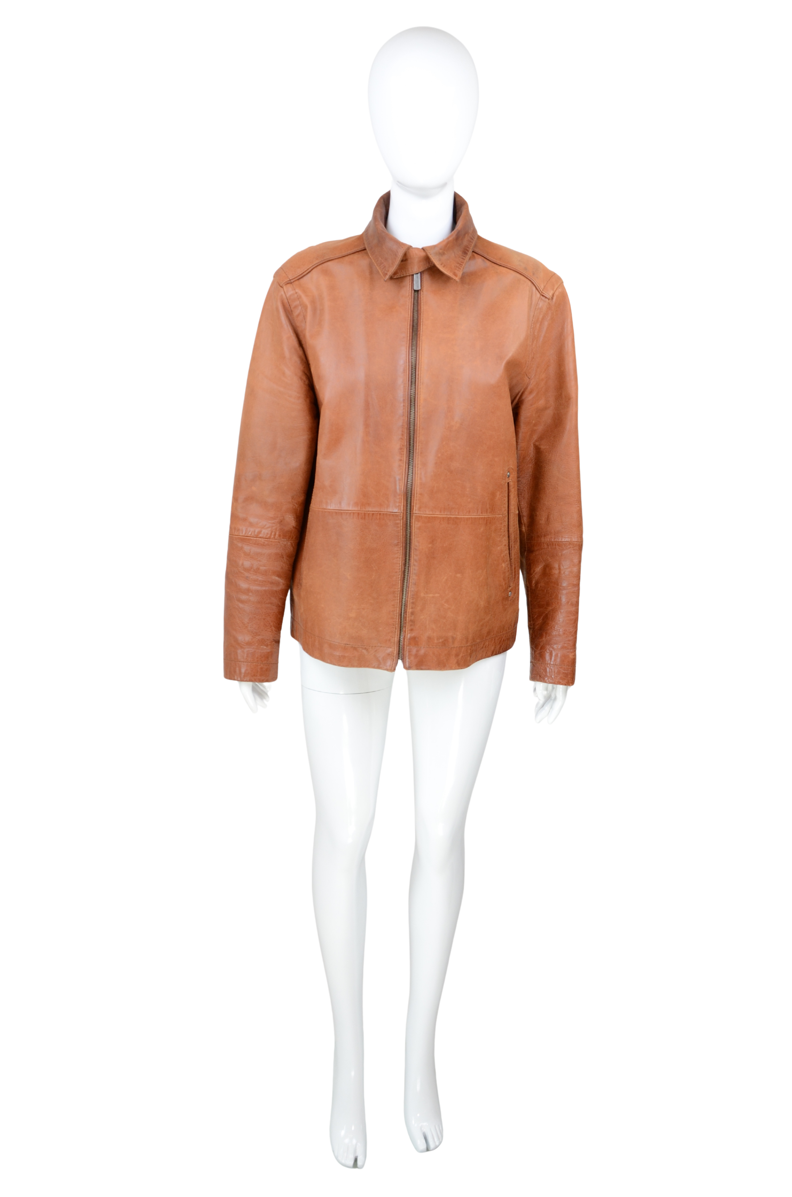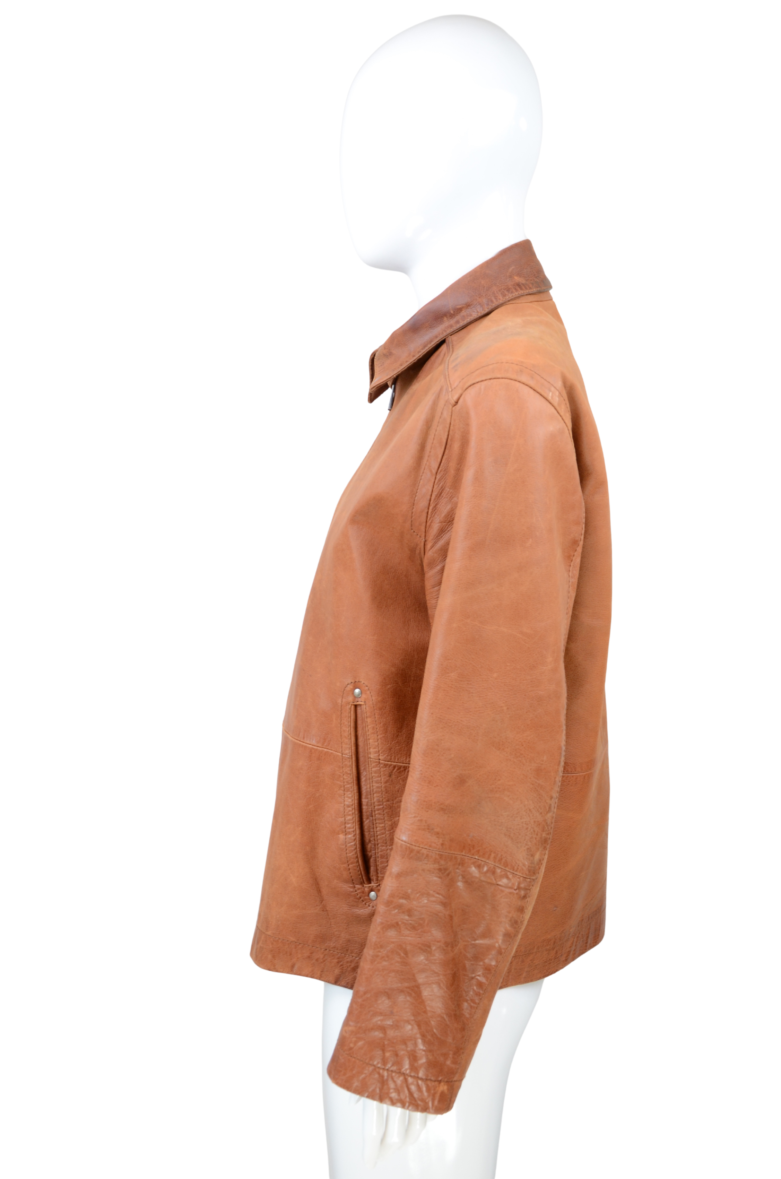 Description: elevate your everyday look with this sleek vintage leather jacket in a warm cognac tone. Crafted from genuine leather, this piece features a minimal design with a straight fit, zip closure, and subtle detailing that keeps the focus on the rich texture of the leather. Its timeless silhouette makes it easy to style, pair it with denim for a casual outfit or layer it over tailoring for a refined edge. A versatile wardrobe staple that brings both elegance and vintage character.