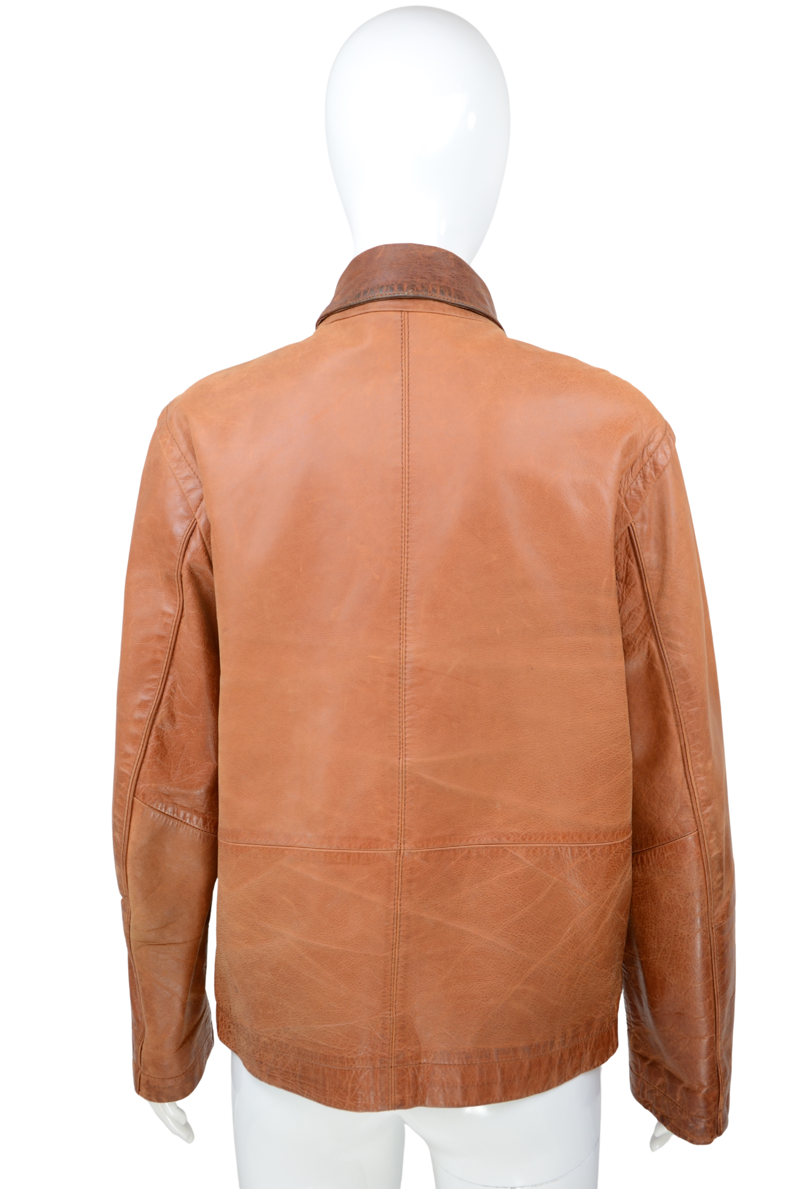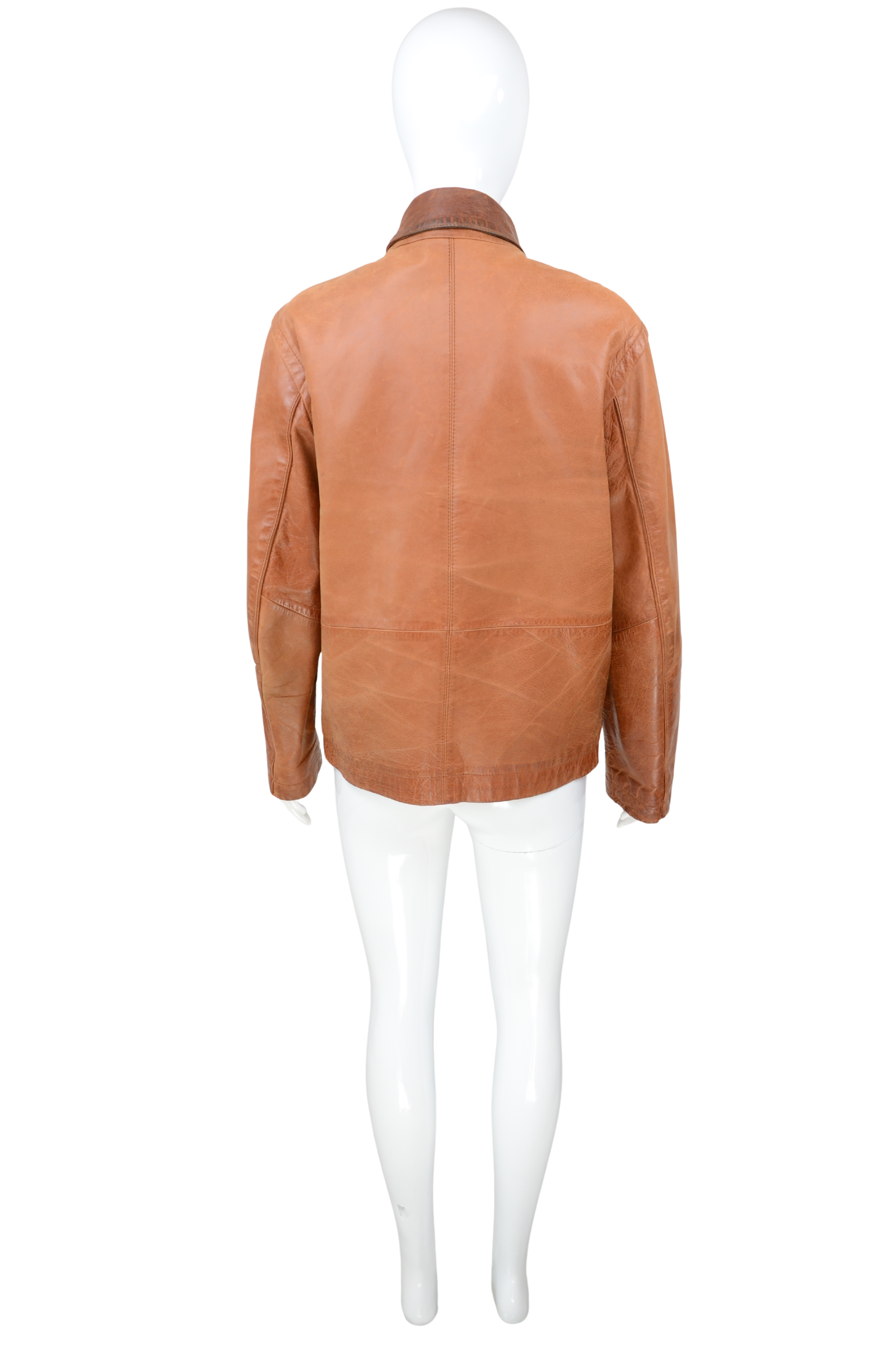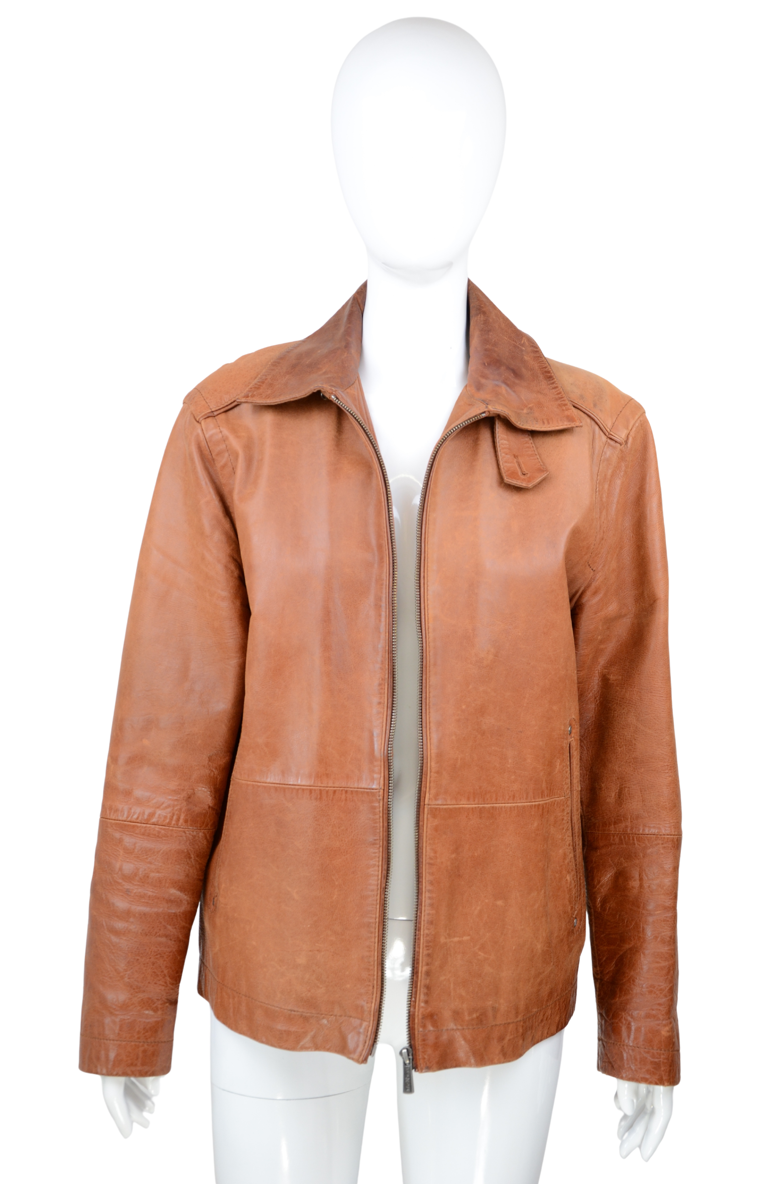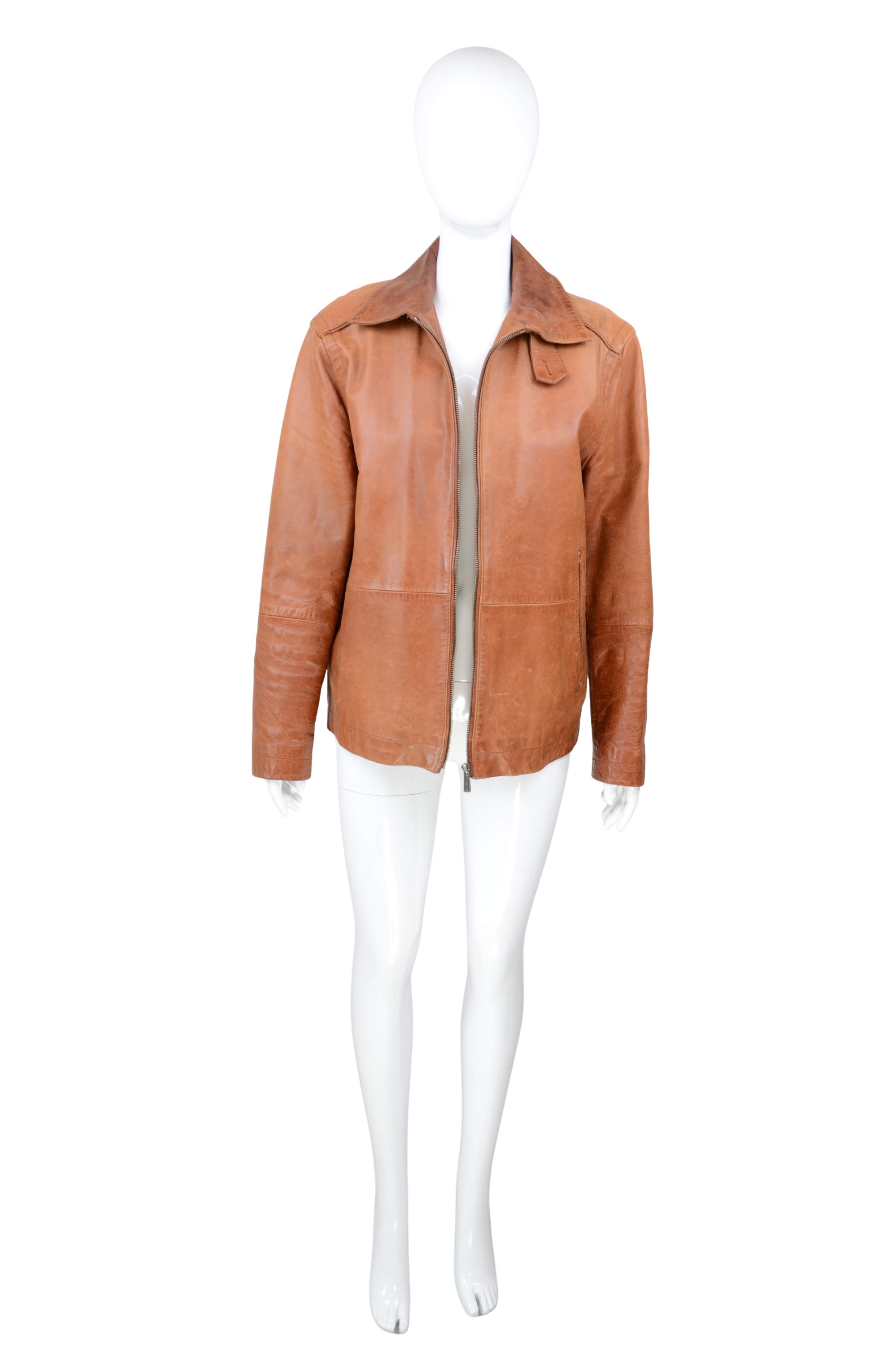 Description: elevate your everyday look with this sleek vintage leather jacket in a warm cognac tone. Crafted from genuine leather, this piece features a minimal design with a straight fit, zip closure, and subtle detailing that keeps the focus on the rich texture of the leather. Its timeless silhouette makes it easy to style, pair it with denim for a casual outfit or layer it over tailoring for a refined edge. A versatile wardrobe staple that brings both elegance and vintage character.