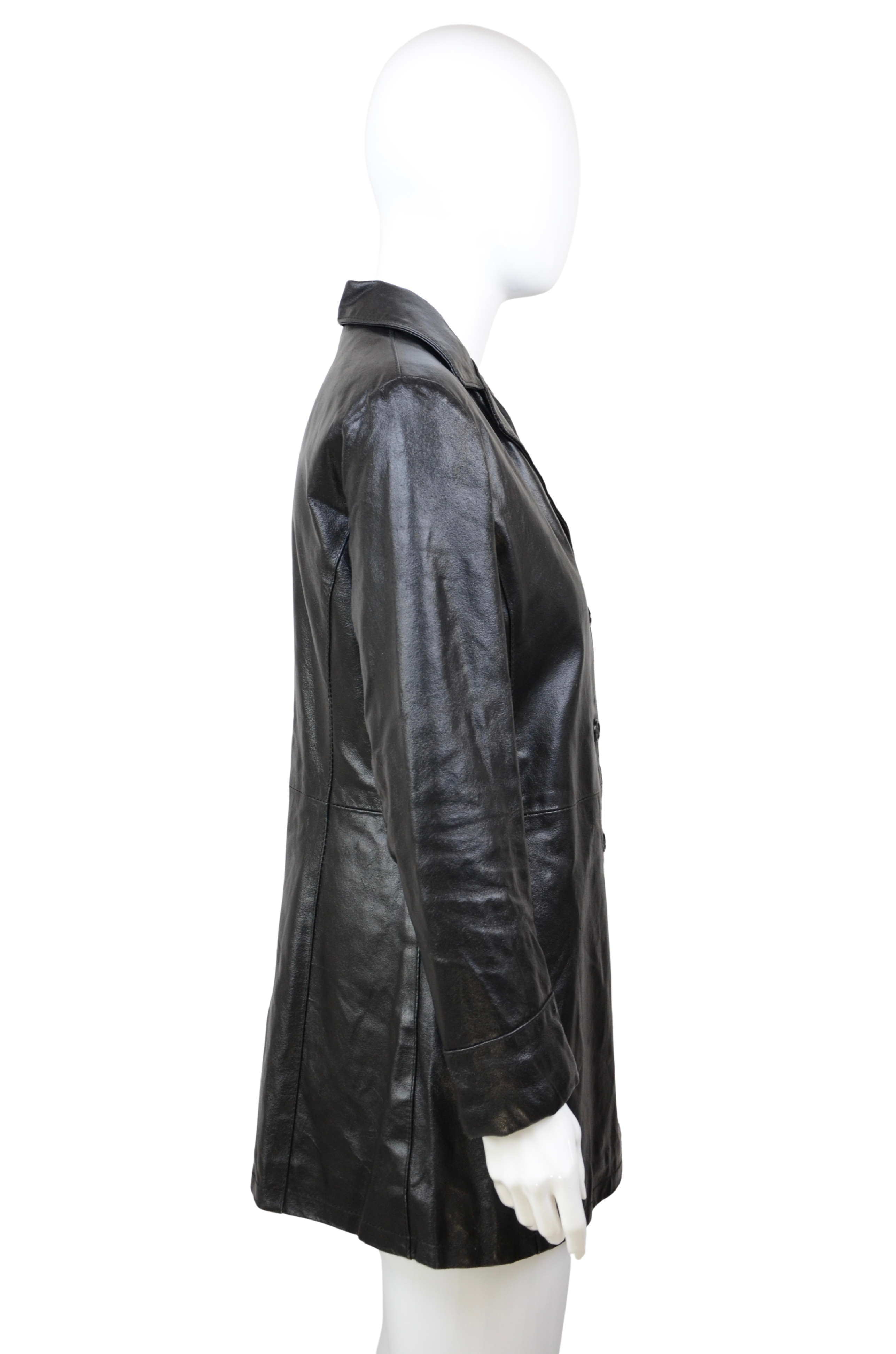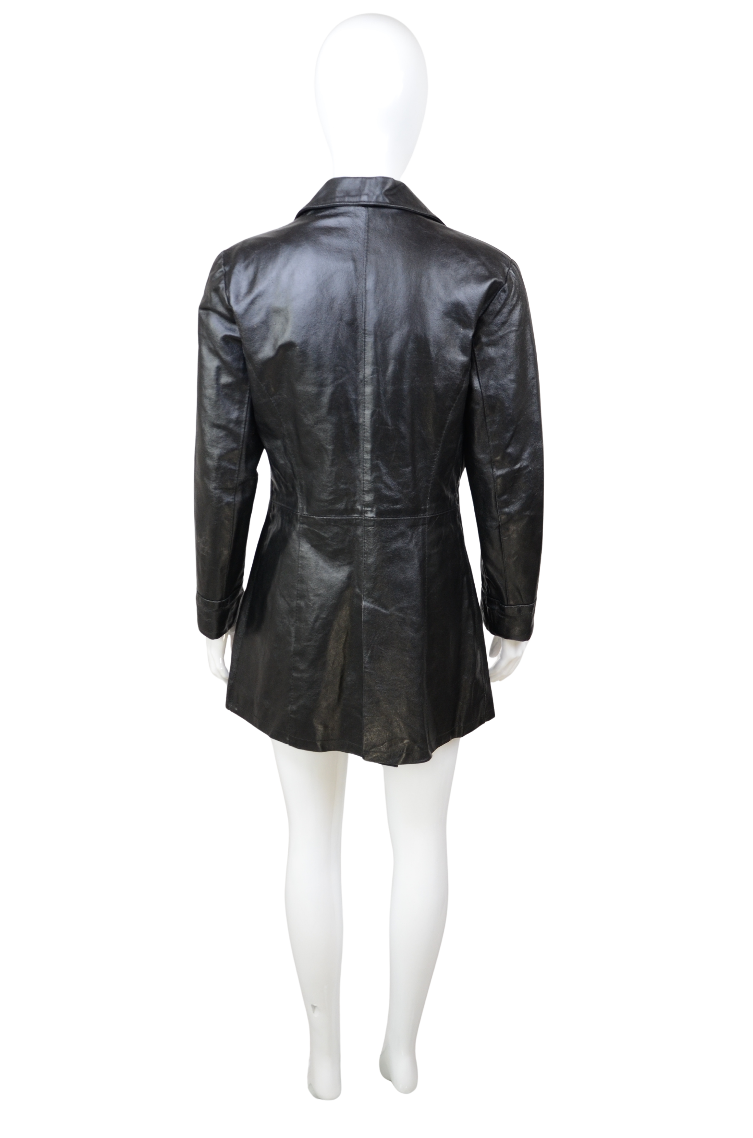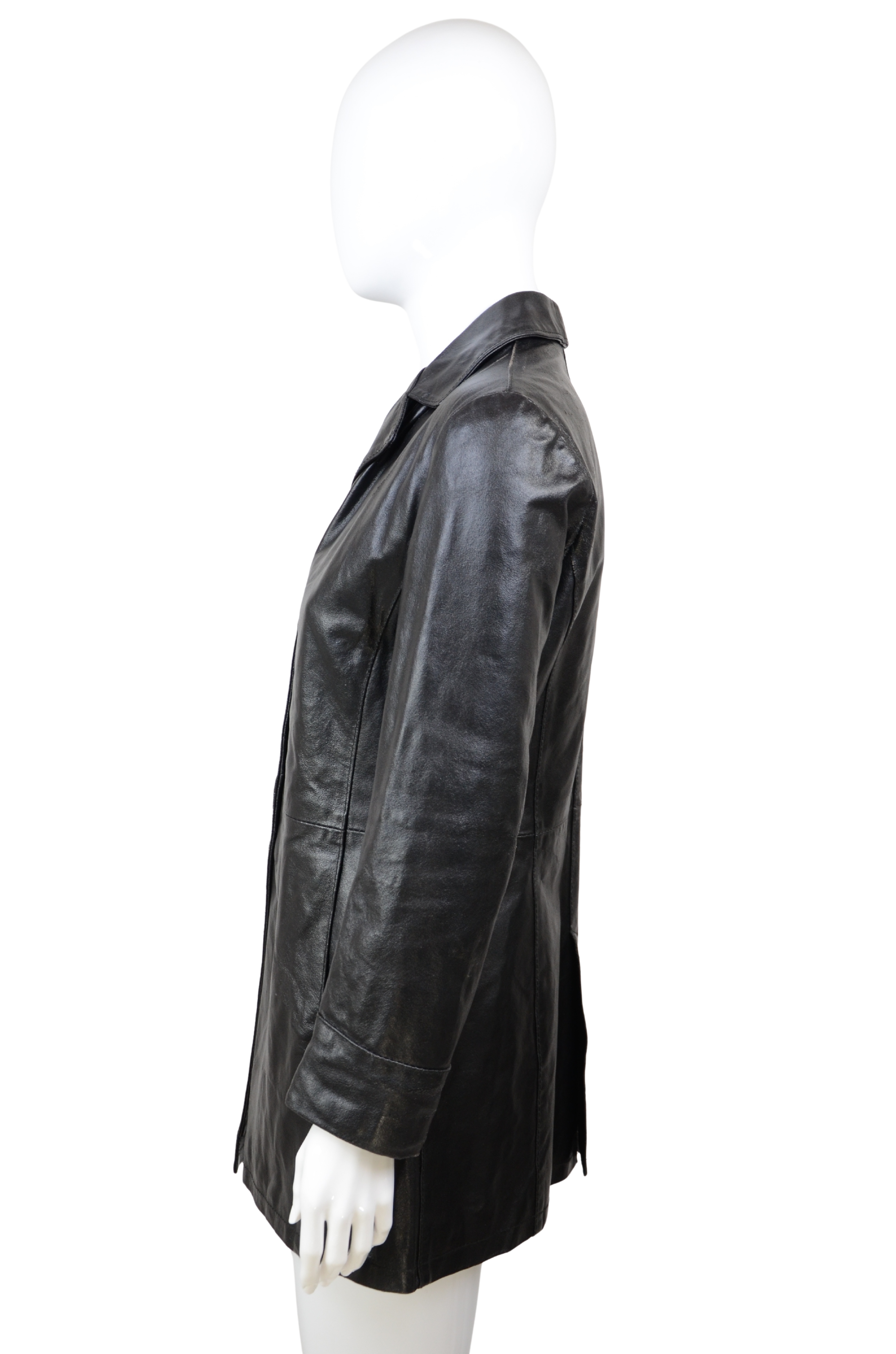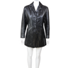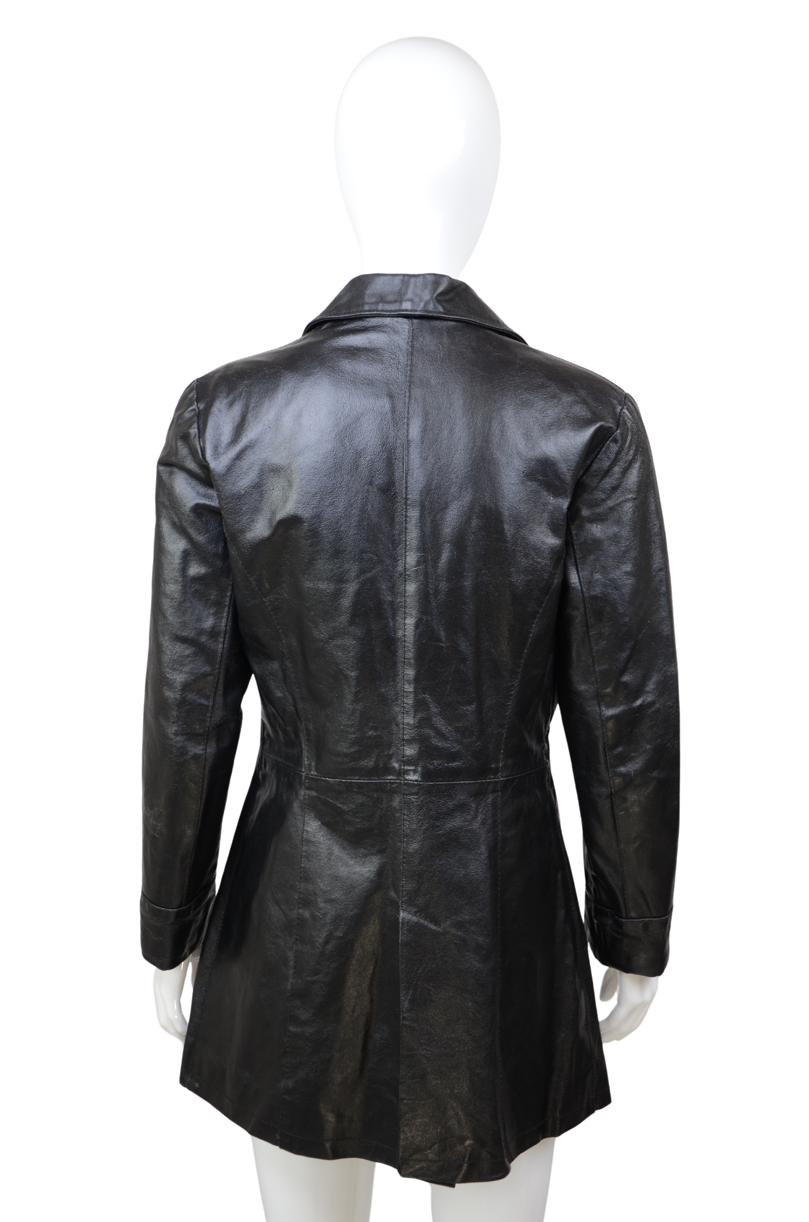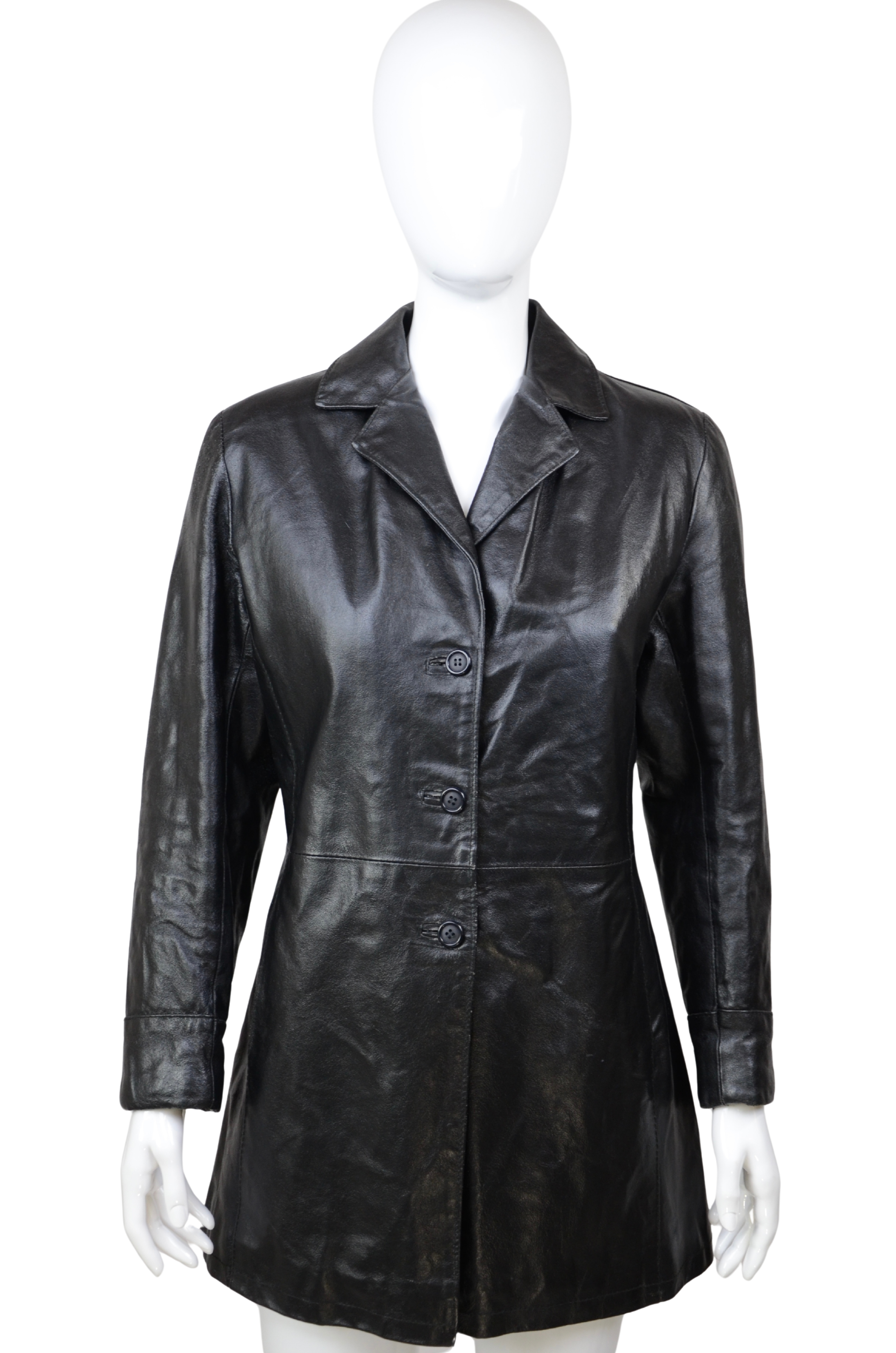 Description: refined and timeless, this vintage leather coat is crafted from genuine leather in a sleek black tone. The design features a tailored silhouette with a button-front closure and structured collar, giving it a polished yet versatile appeal. Its longer cut makes it the perfect transitional piece, elegant enough to wear over dresses yet casual enough to pair with denim. A true minimalist staple that embodies effortless vintage chic.