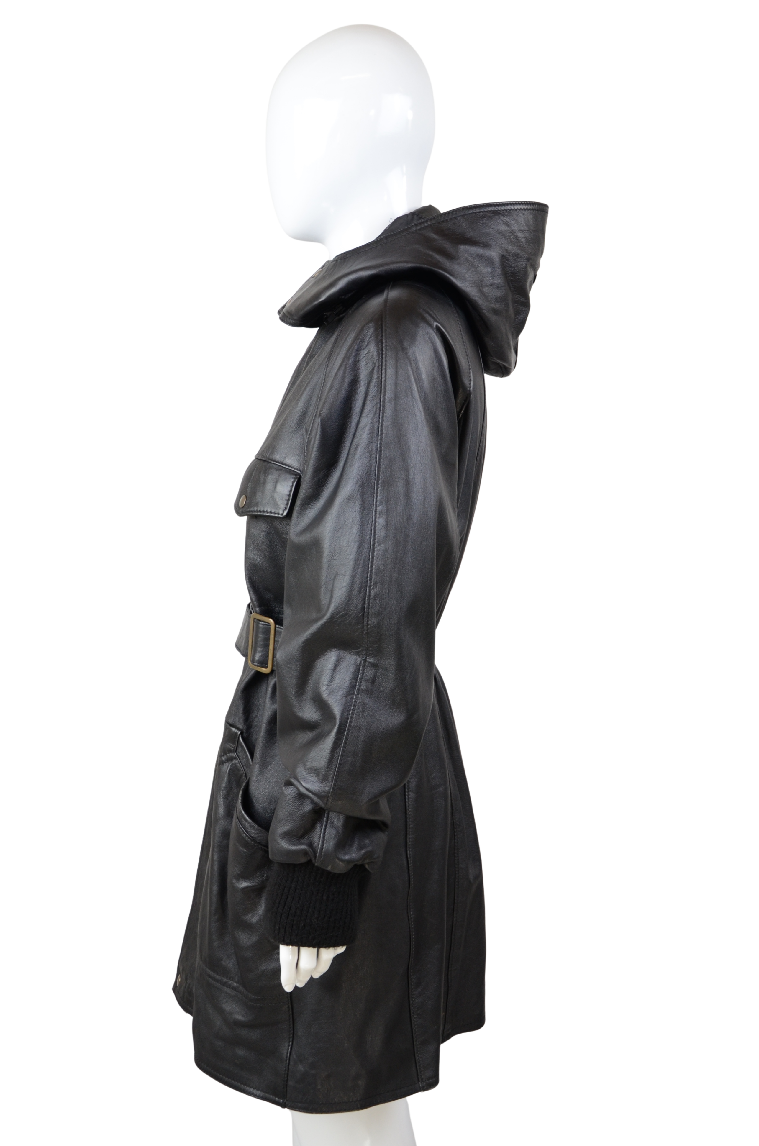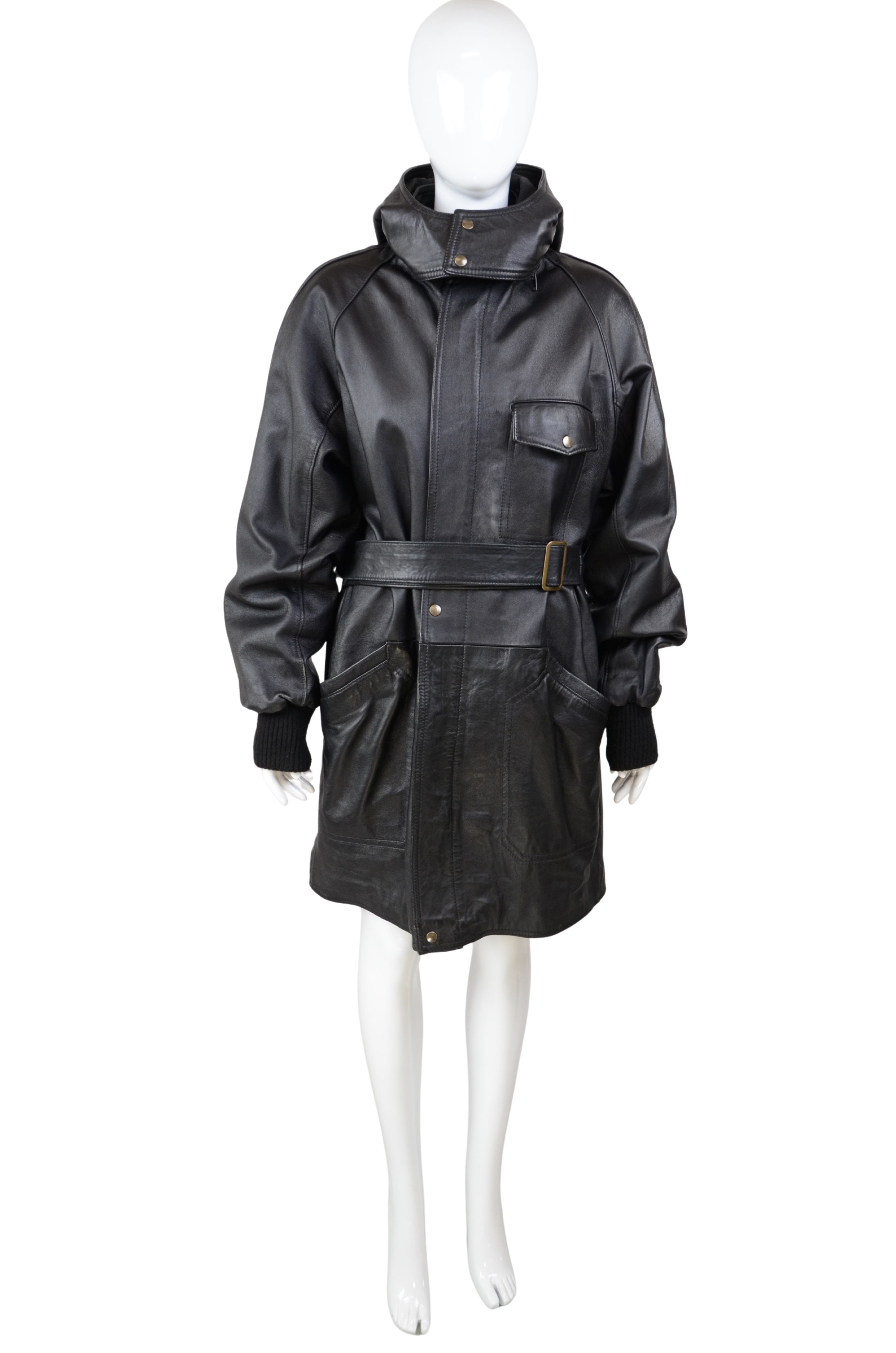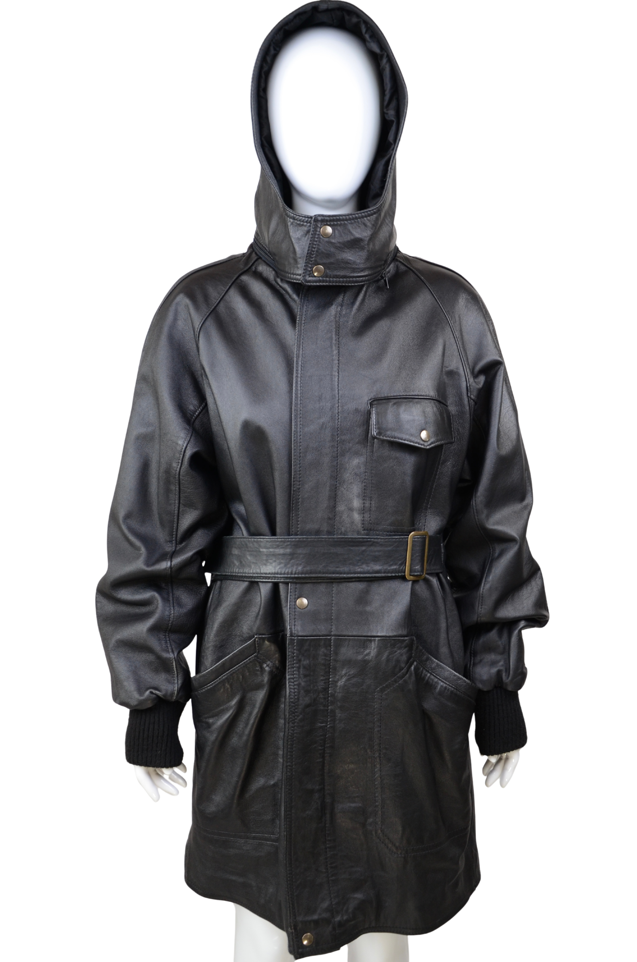 Description: make a statement with this oversized vintage leather jacket, designed with both style and practicality in mind. Crafted from genuine leather, this piece features a detachable hood, adjustable belt at the waist for a flattering fit, and multiple front pockets for a utilitarian edge. The longline silhouette and relaxed XL size give it that effortlessly cool, slightly androgynous vibe, perfect for layering over chunky knits or styling with sleek trousers. A bold outerwear piece that combines function and timeless style.