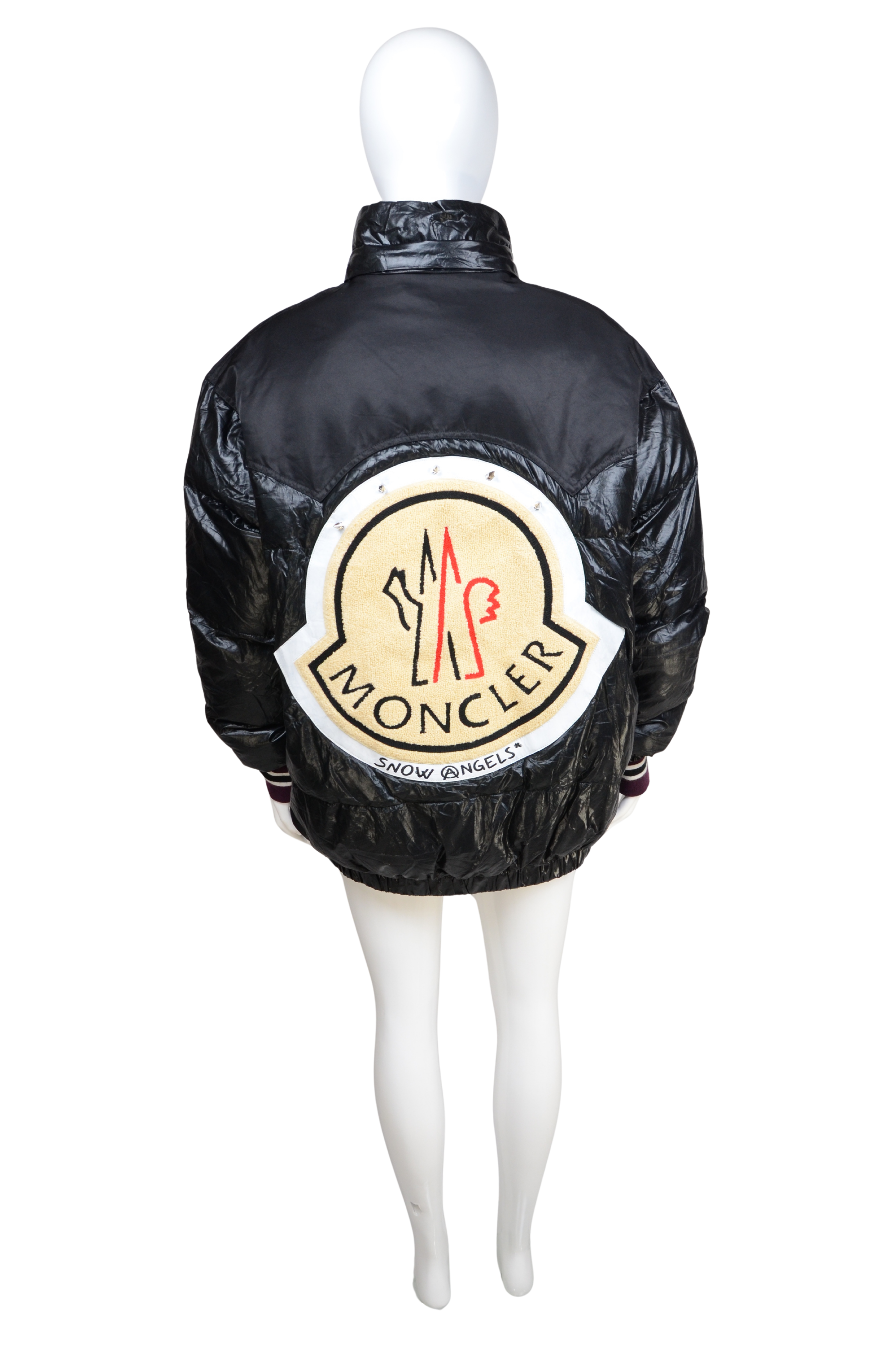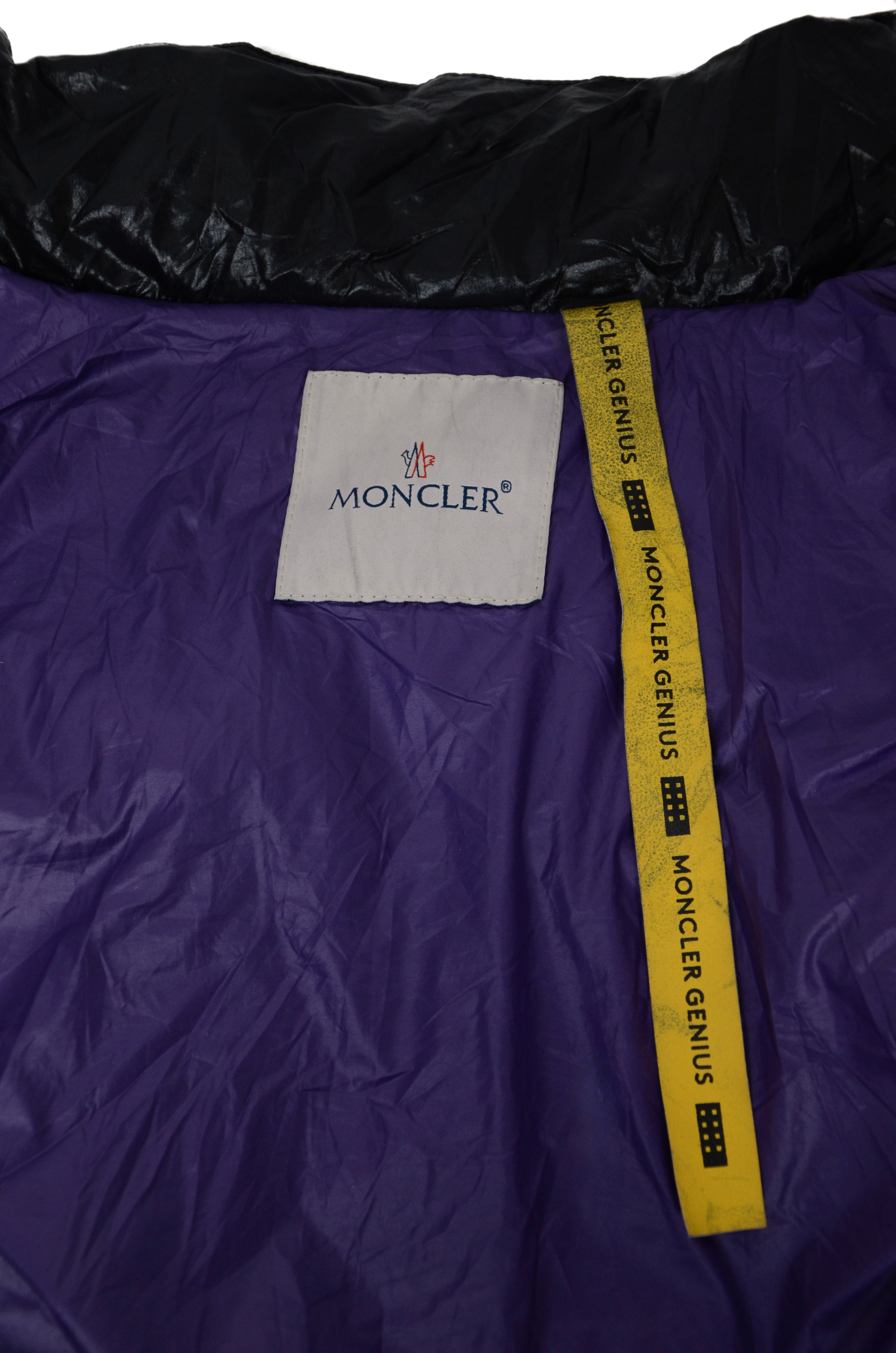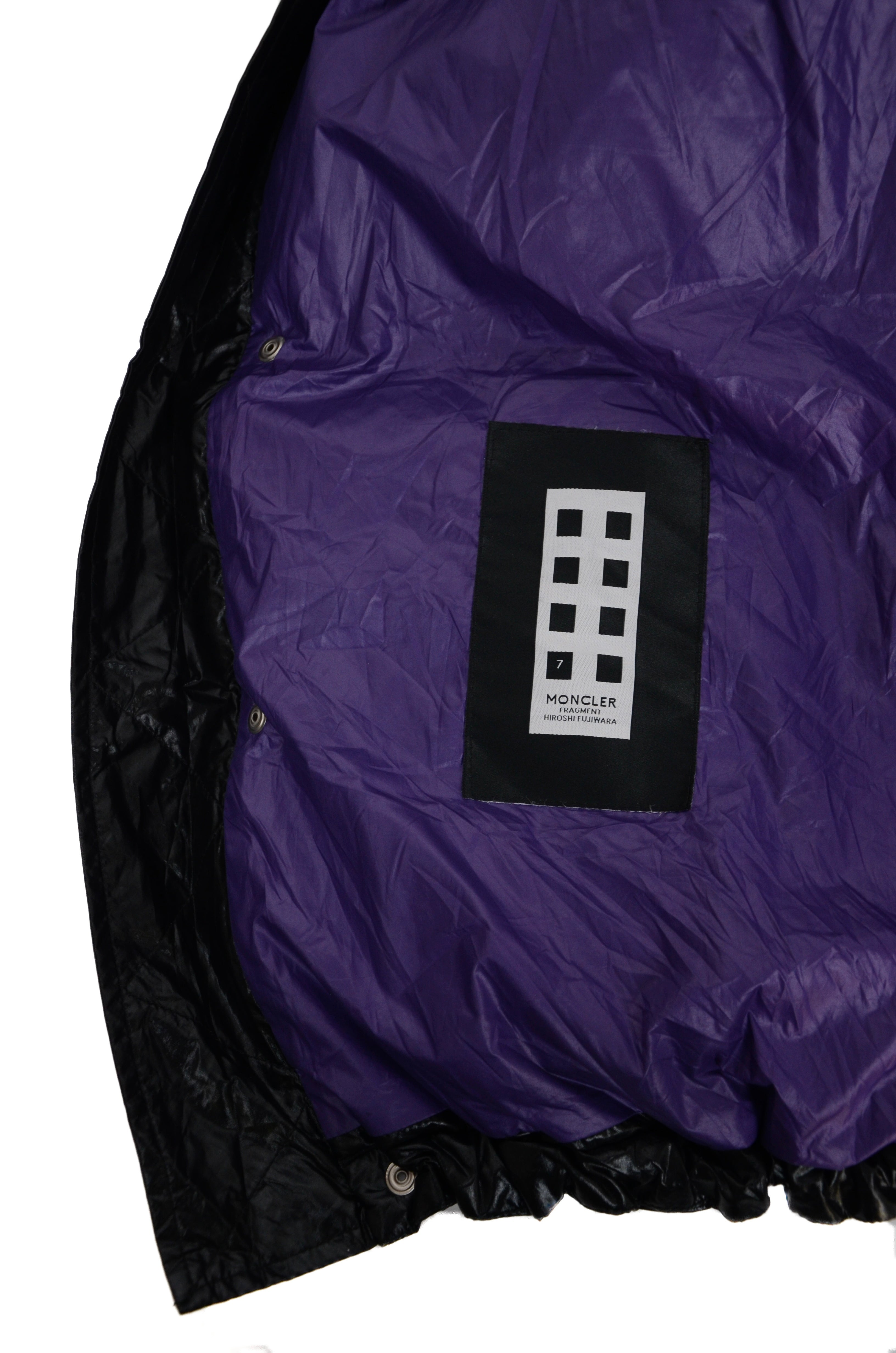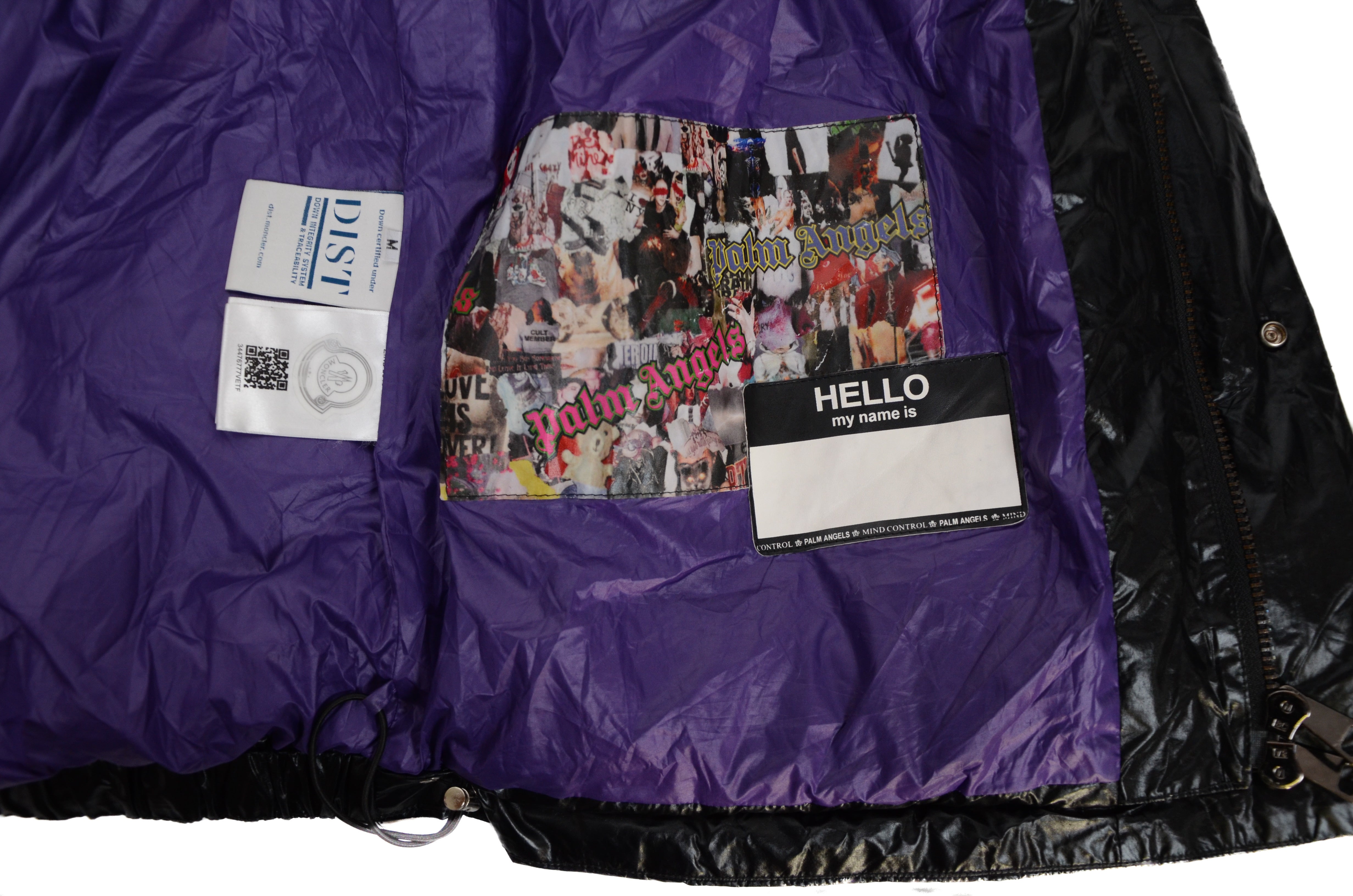 Description: A standout collector’s piece from the Moncler Genius project, designed in collaboration with Palm Angels and Fragment. This oversized puffer jacket combines Moncler’s signature high-performance quality with Palm Angels’ rebellious streetwear edge and Hiroshi Fujiwara’s minimalist design approach. Crafted in glossy black nylon laqué with a purple lining, it features bold oversized Moncler “Snow Angels” terry patches on the front and back, silver-tone hardware, and ribbed cuffs. A rare and highly sought-after statement piece that merges luxury, warmth, and cultural relevance.
