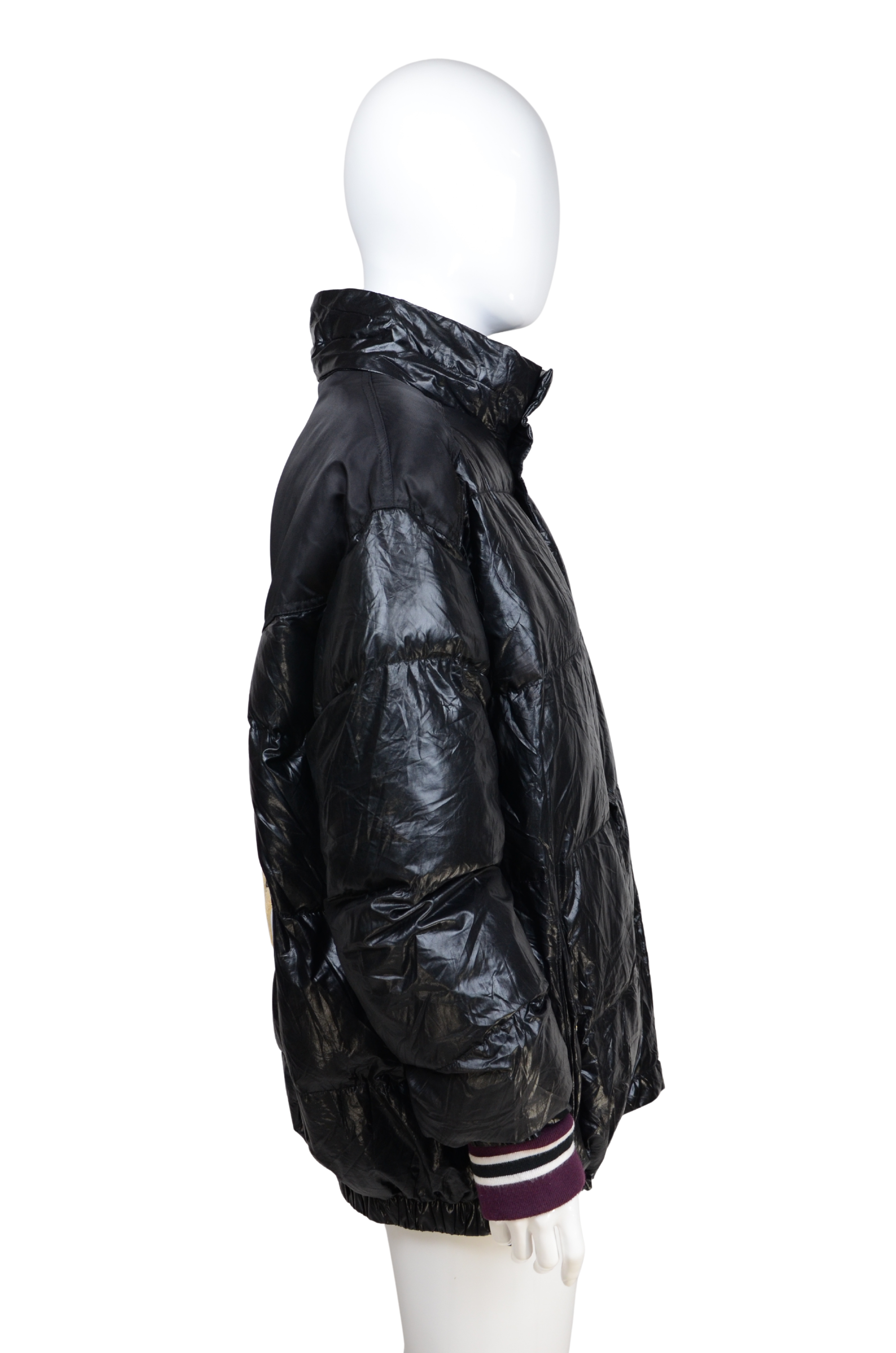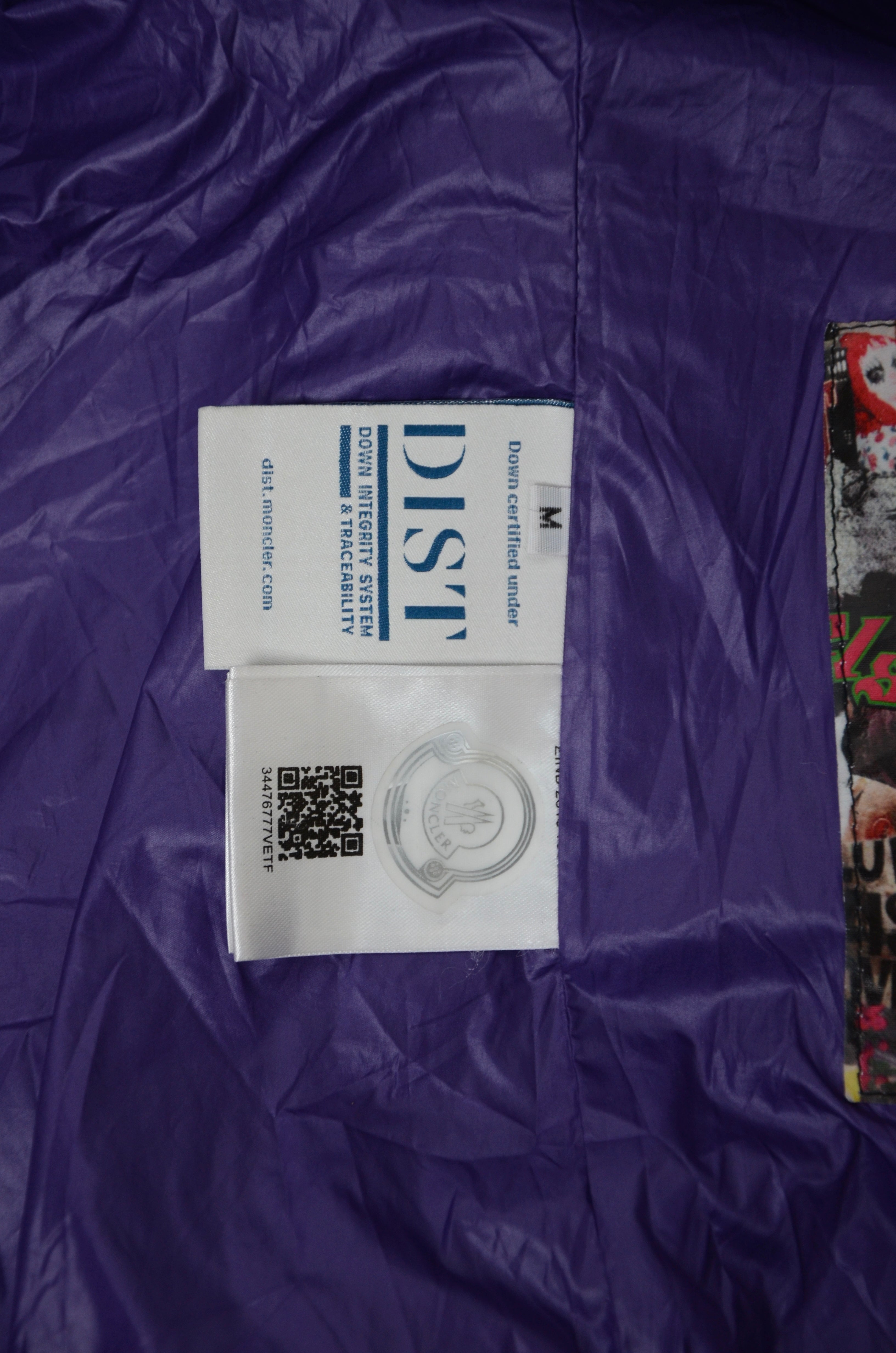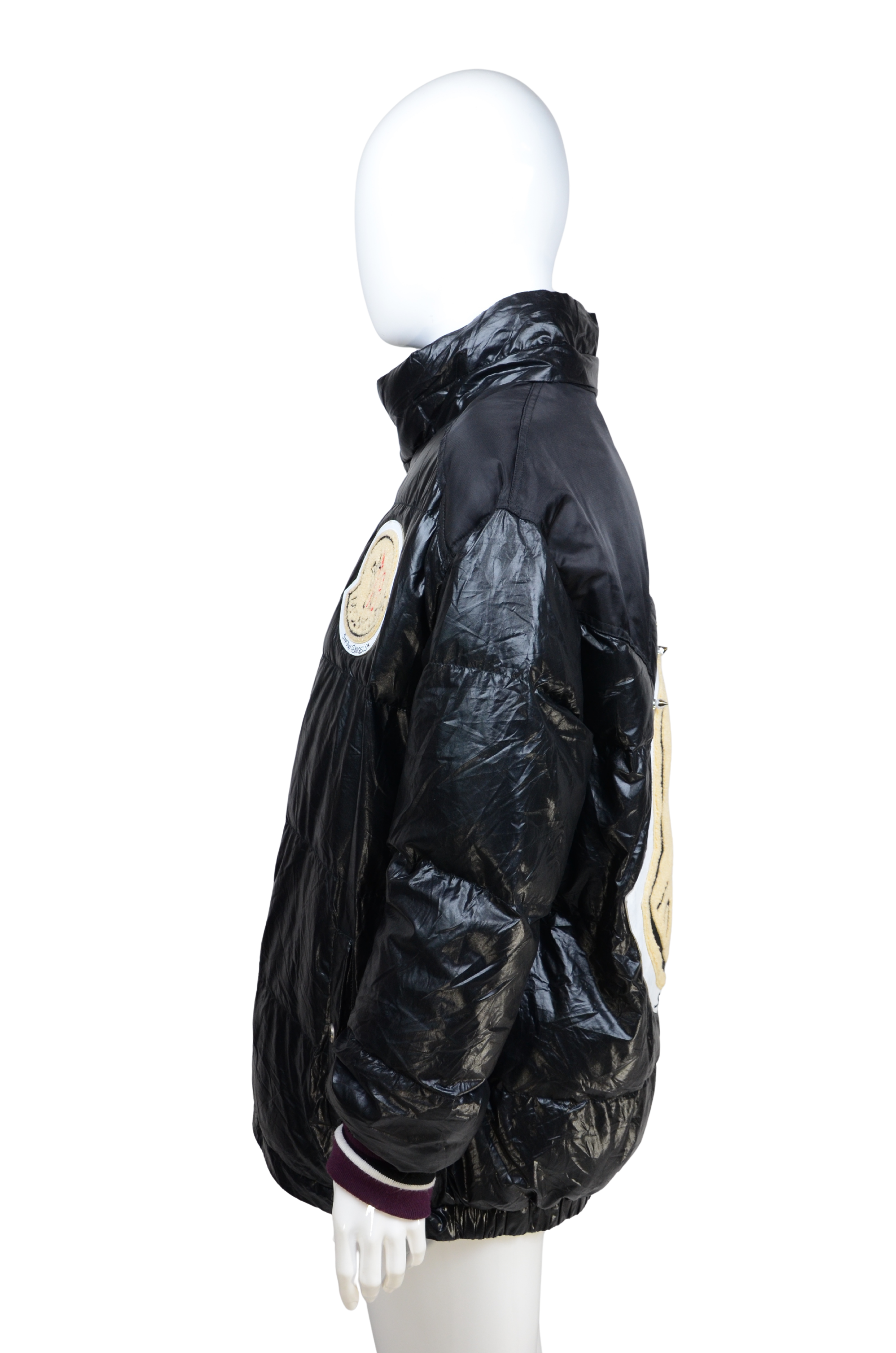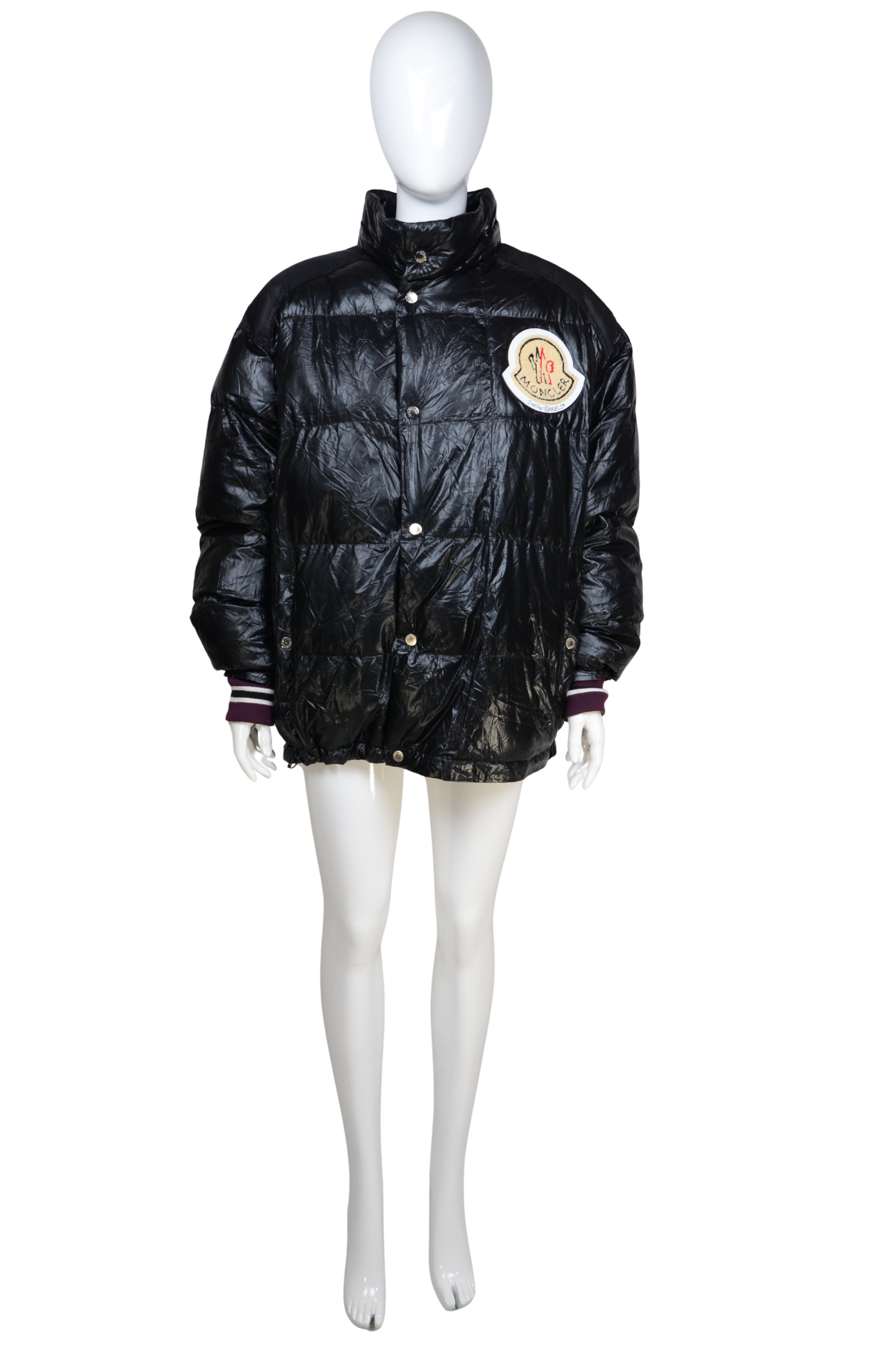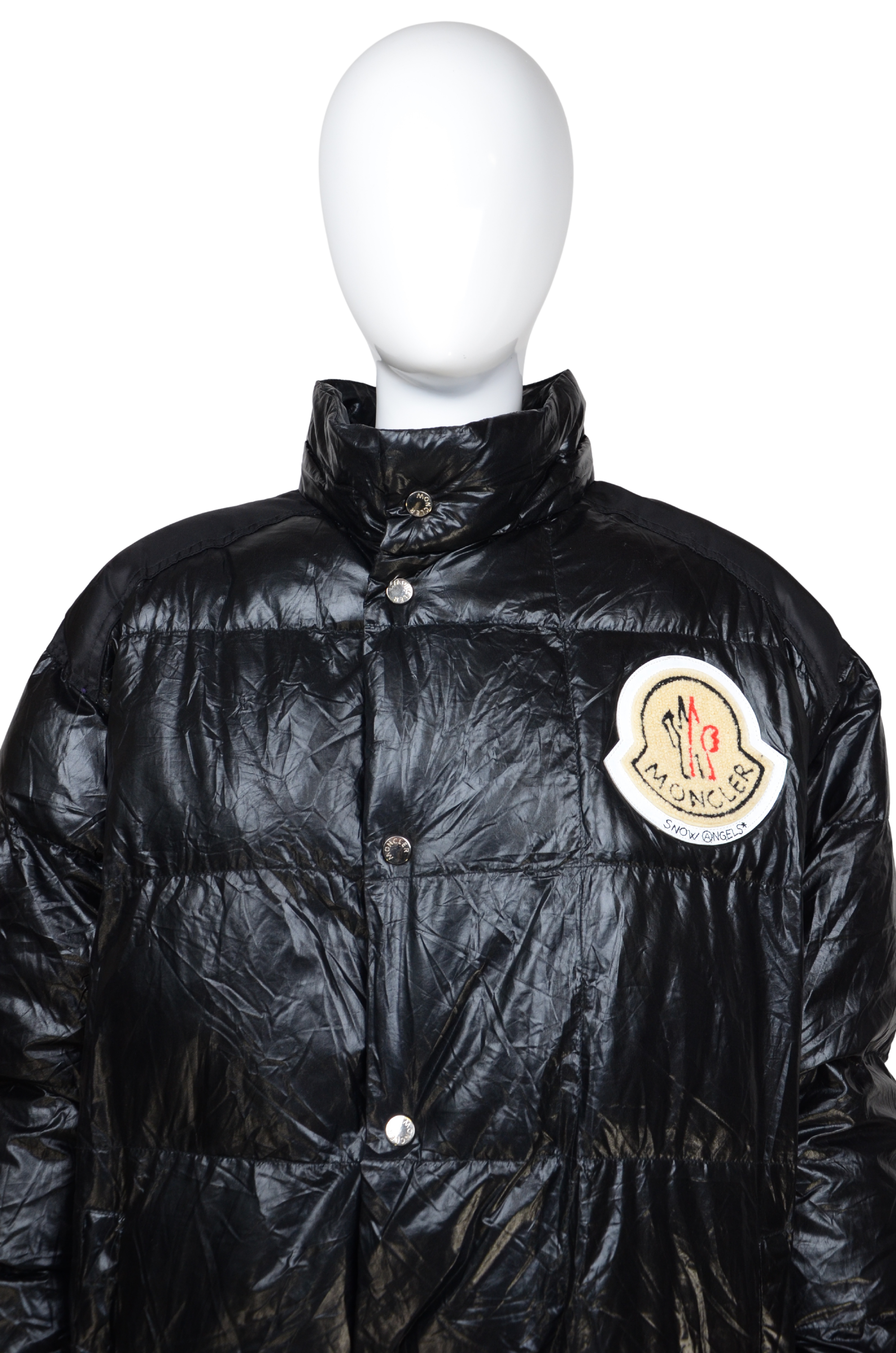 Description: A standout collector’s piece from the Moncler Genius project, designed in collaboration with Palm Angels and Fragment. This oversized puffer jacket combines Moncler’s signature high-performance quality with Palm Angels’ rebellious streetwear edge and Hiroshi Fujiwara’s minimalist design approach. Crafted in glossy black nylon laqué with a purple lining, it features bold oversized Moncler “Snow Angels” terry patches on the front and back, silver-tone hardware, and ribbed cuffs. A rare and highly sought-after statement piece that merges luxury, warmth, and cultural relevance.