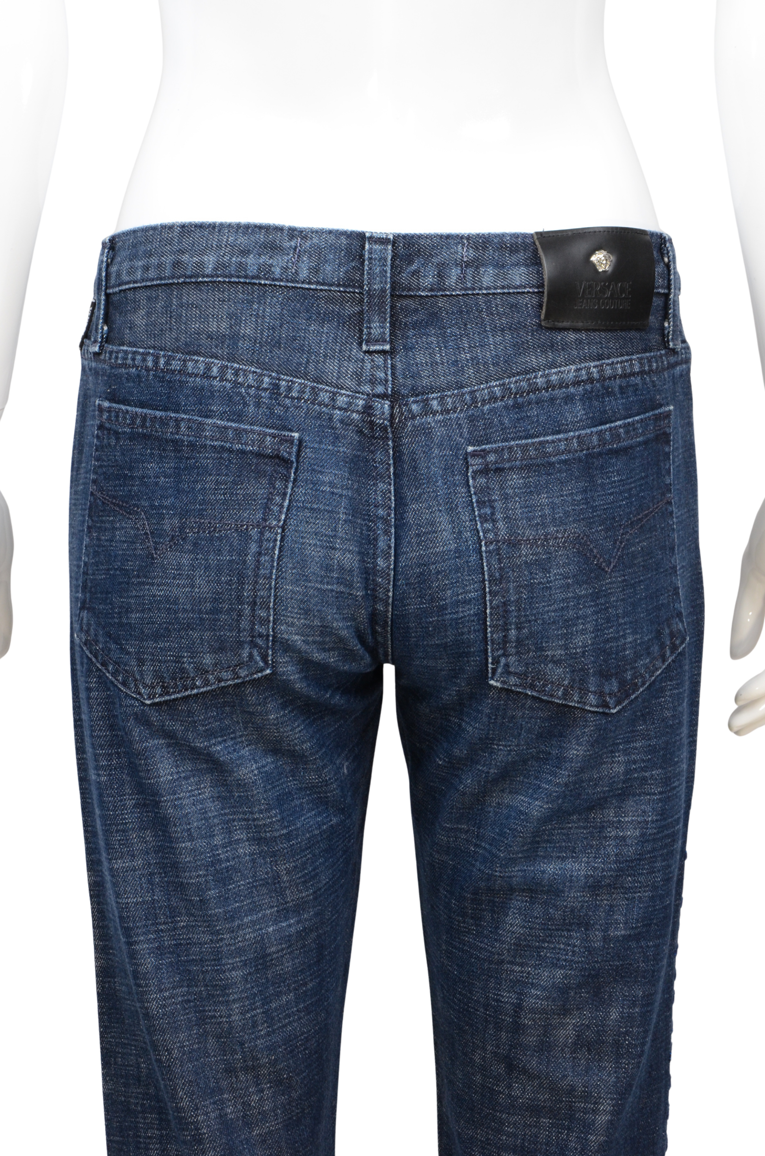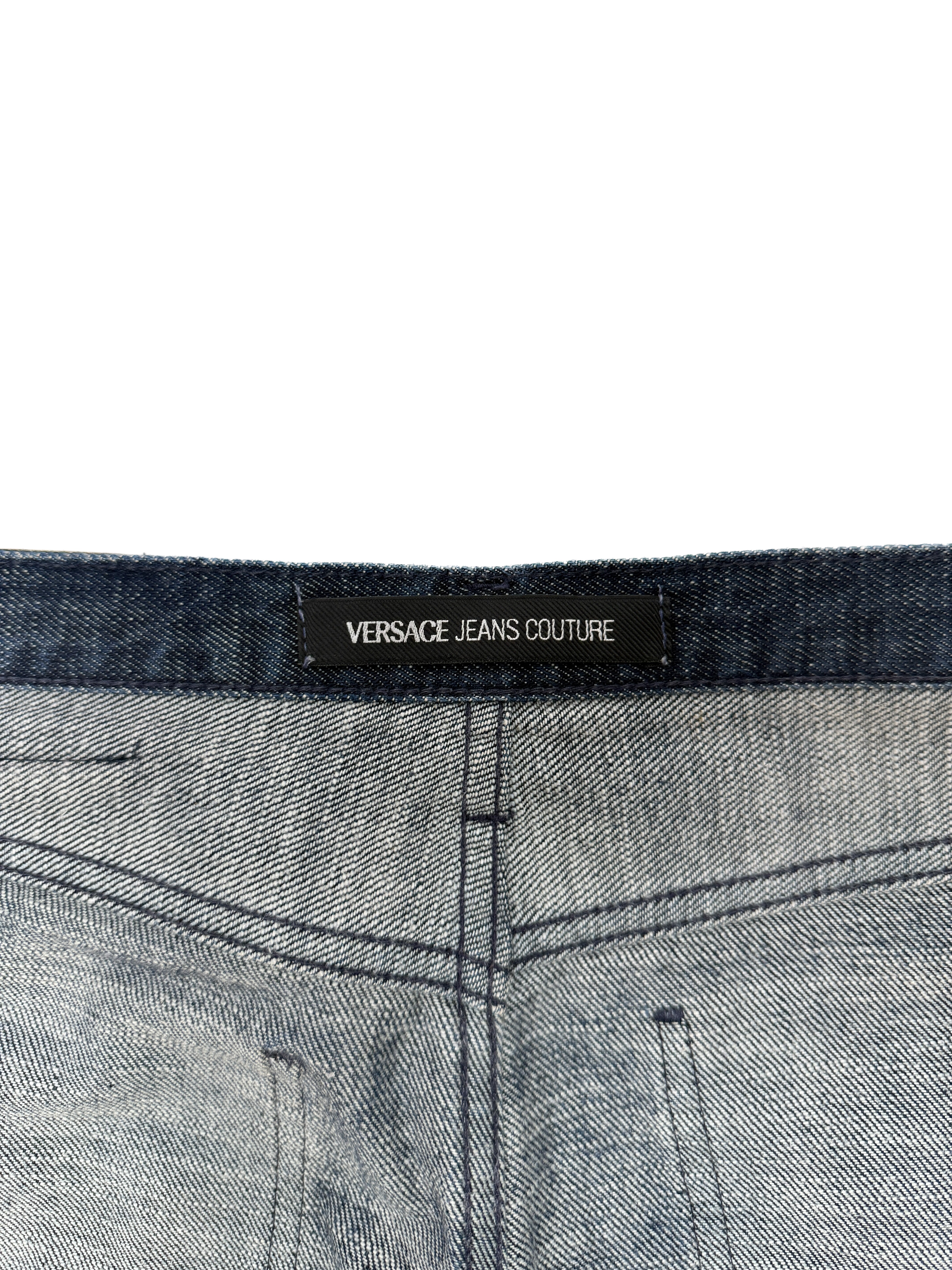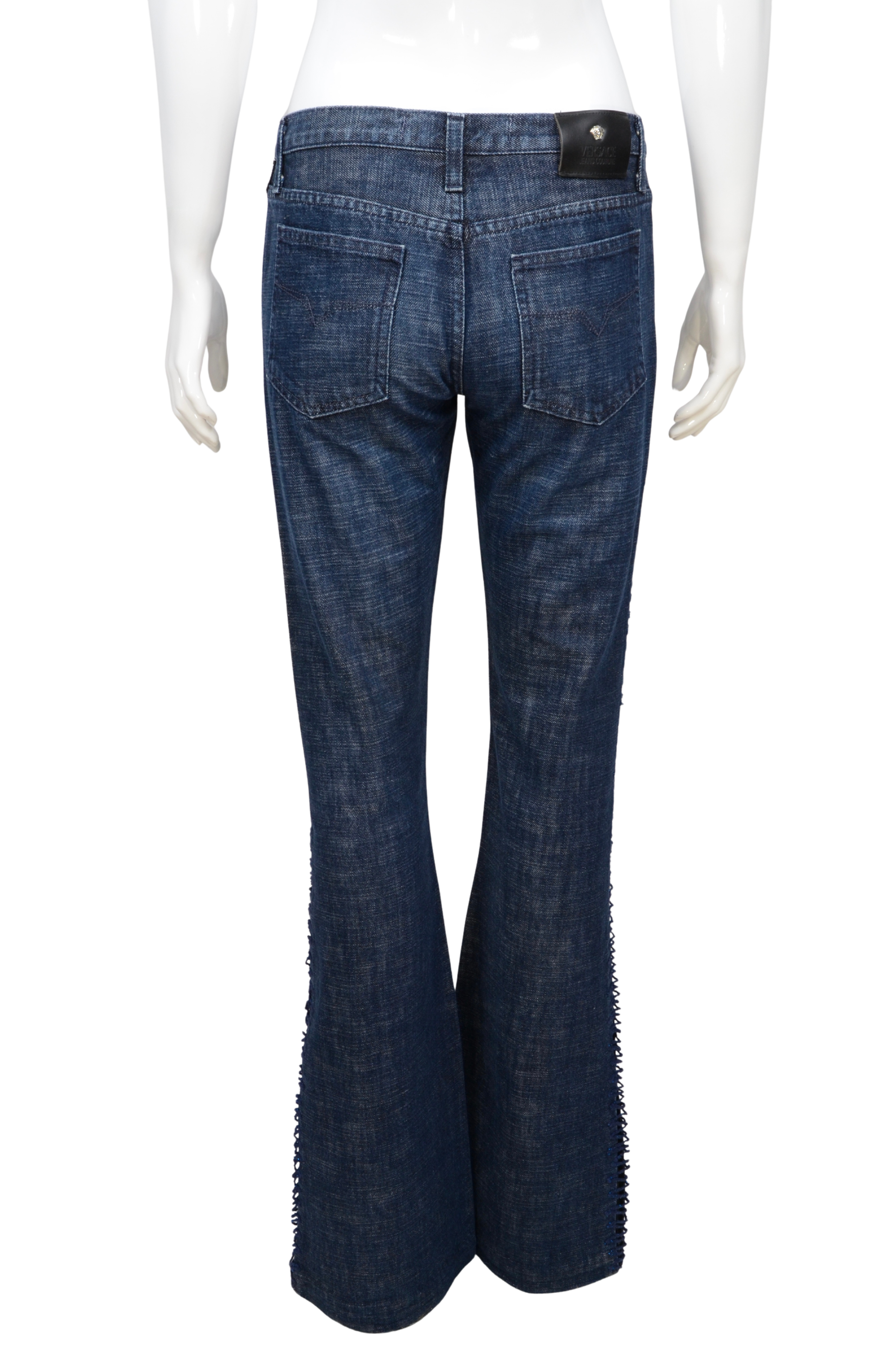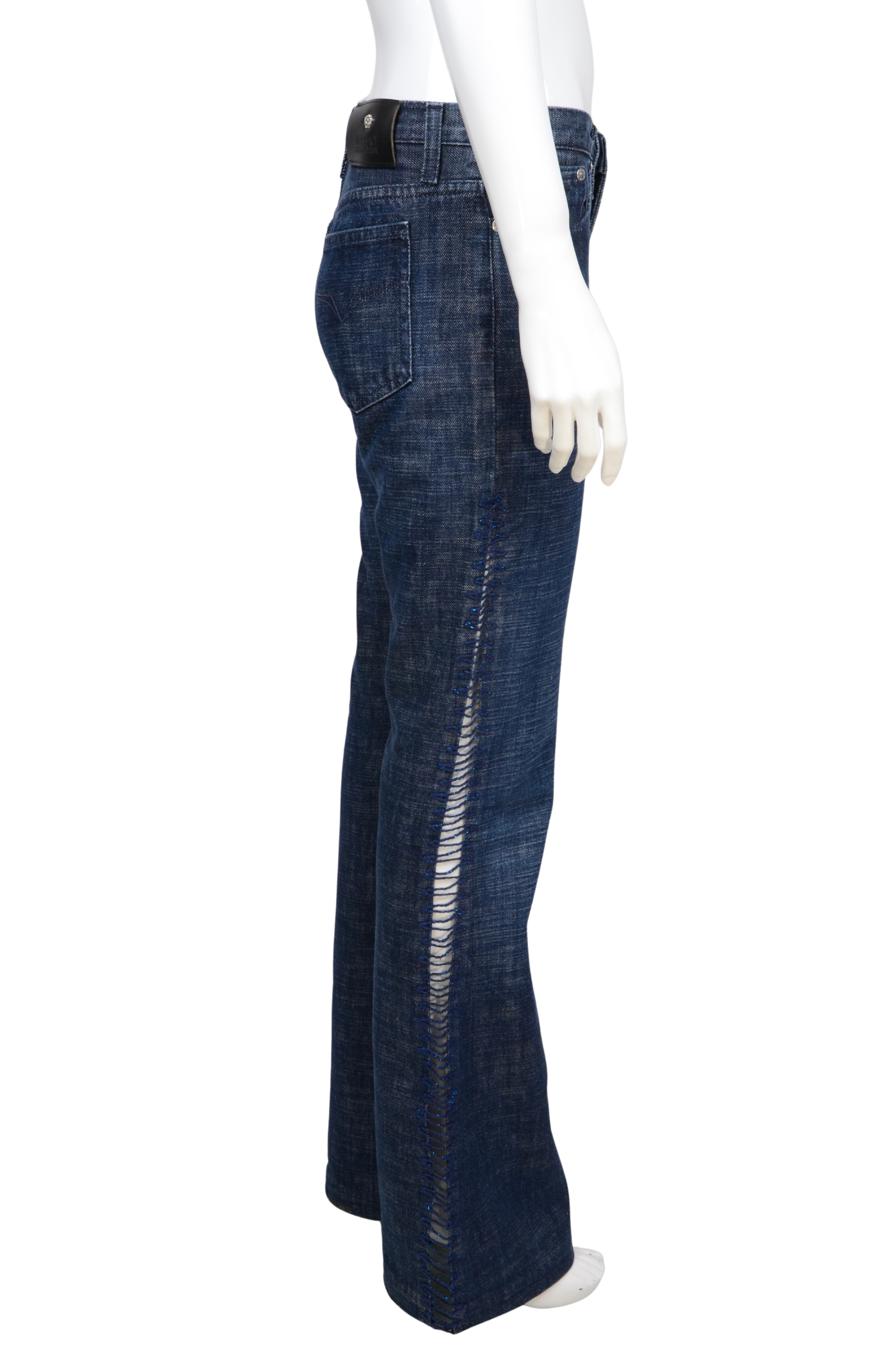 Description: A standout pair of vintage Versace Jeans Couture flared denim pants, crafted in premium mid-wash cotton denim. The design features intricate lace-up detailing running down the outer leg seams, adding a subtle touch of Y2K-inspired edge. Finished with the signature black leather logo patch on the back and polished silver-tone hardware, these jeans balance classic Italian craftsmanship with a bold, feminine twist. Perfect for styling with a simple tank or a sleek blazer for that effortless Versace look.